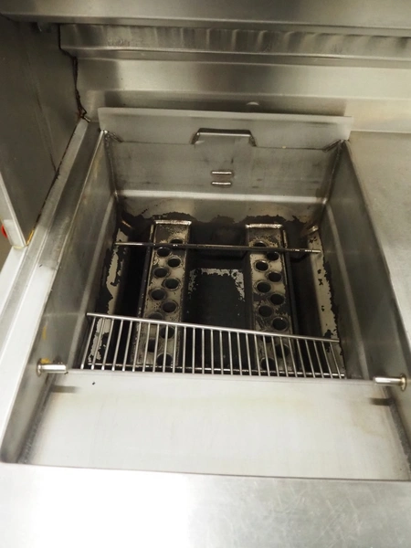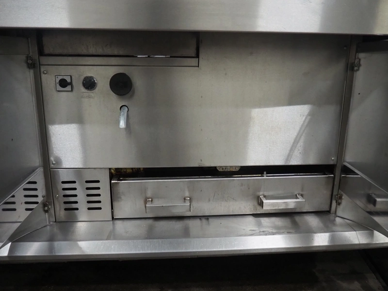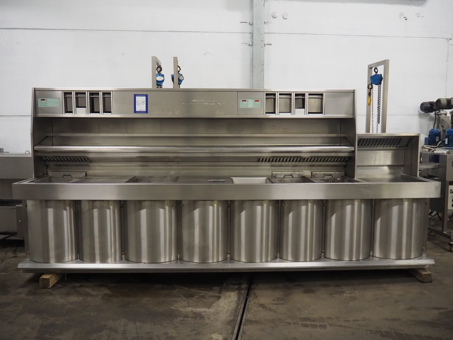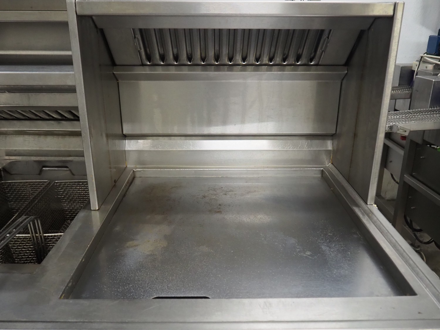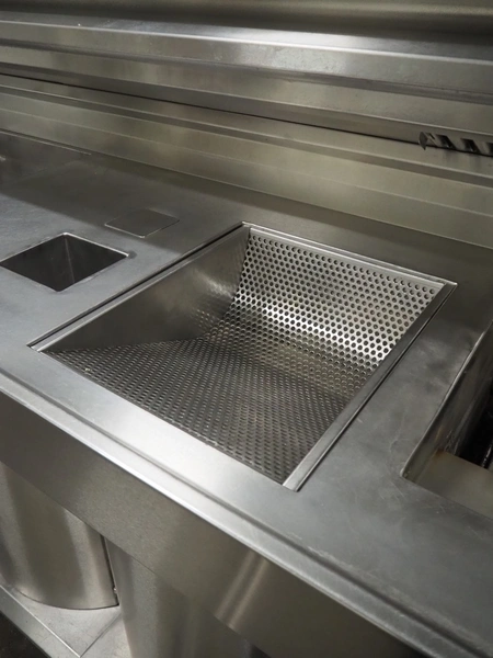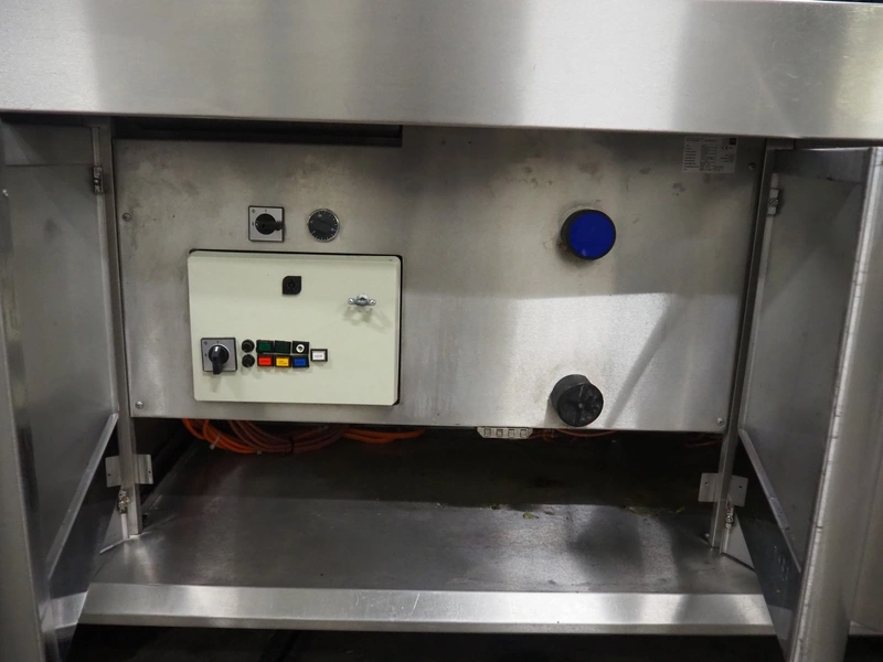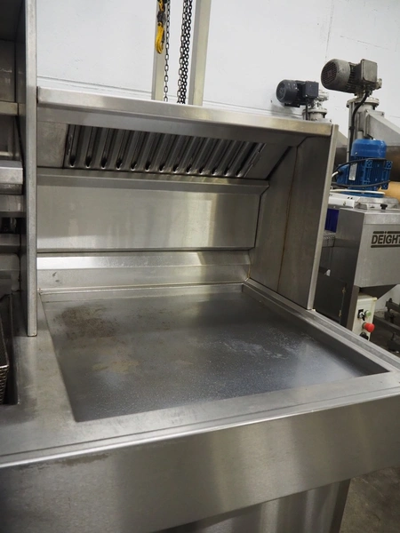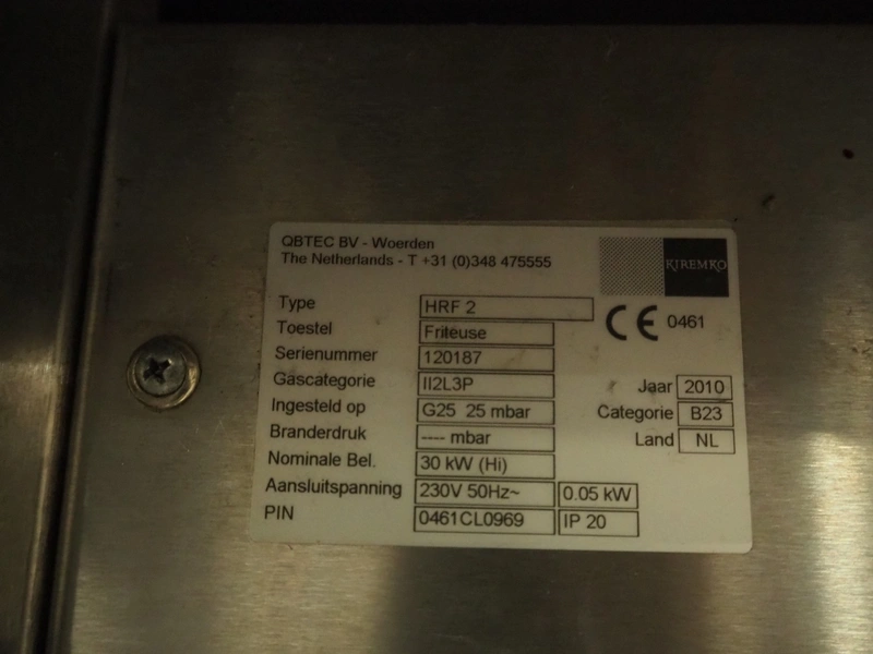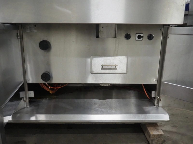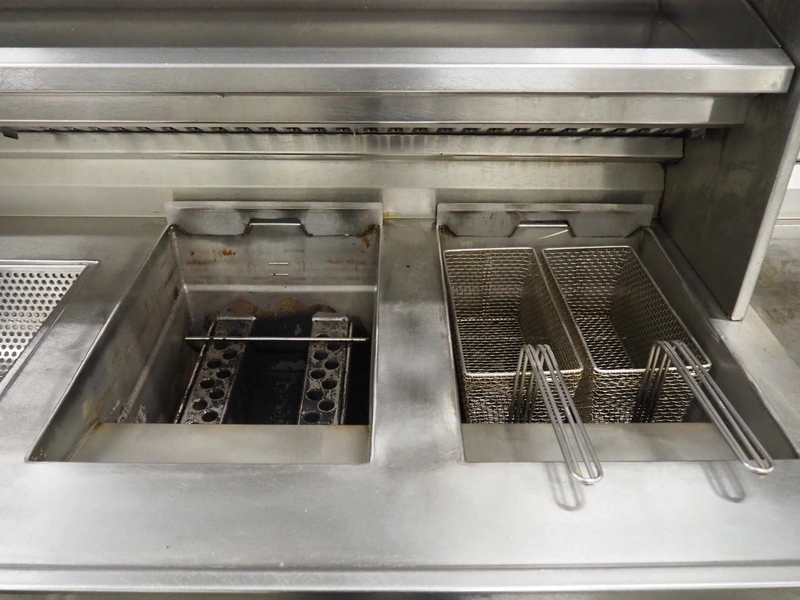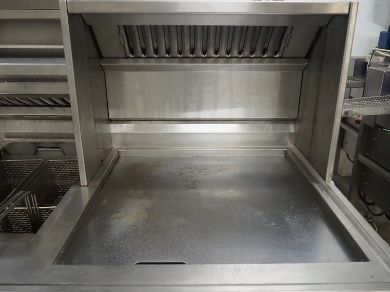 Kiremko multi-purpose cooking counter, type: HRF 2, serial number: 120187, year of construction: 2010, 230 V, 50 Hz, 30 kW, 3 deep fryers, grill plate, lekkage tray and au-bain-marie, total dimensions: 1000 mm x 4150 mm x 1800 mm.