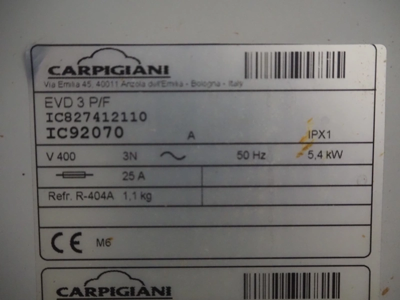 Carpigiani mobile ice cream machine, model: EVD 3 P/F, serial number: IC92070, 400 V, 3 Ph, 50 Hz, 25 A, 5.4 kW, refrigerant: R-404A, 1.1 kg, dimensions: 510 mm x 880 mm x 1780 mm. Incomplete.