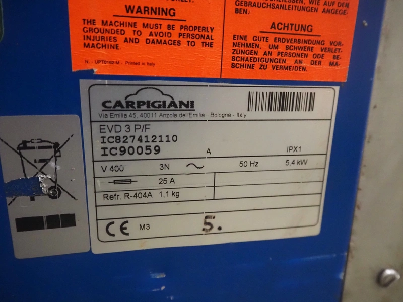 Carpigiani mobile ice cream machine, model: EVD 3 P/F, serial number: IC90059, 400 V, 3 Ph, 50 Hz, 25 A, 5.4 kW, refrigerant: R-404A, 1.1 kg, dimensions: 510 mm x 880 mm x 1780 mm. Incomplete.