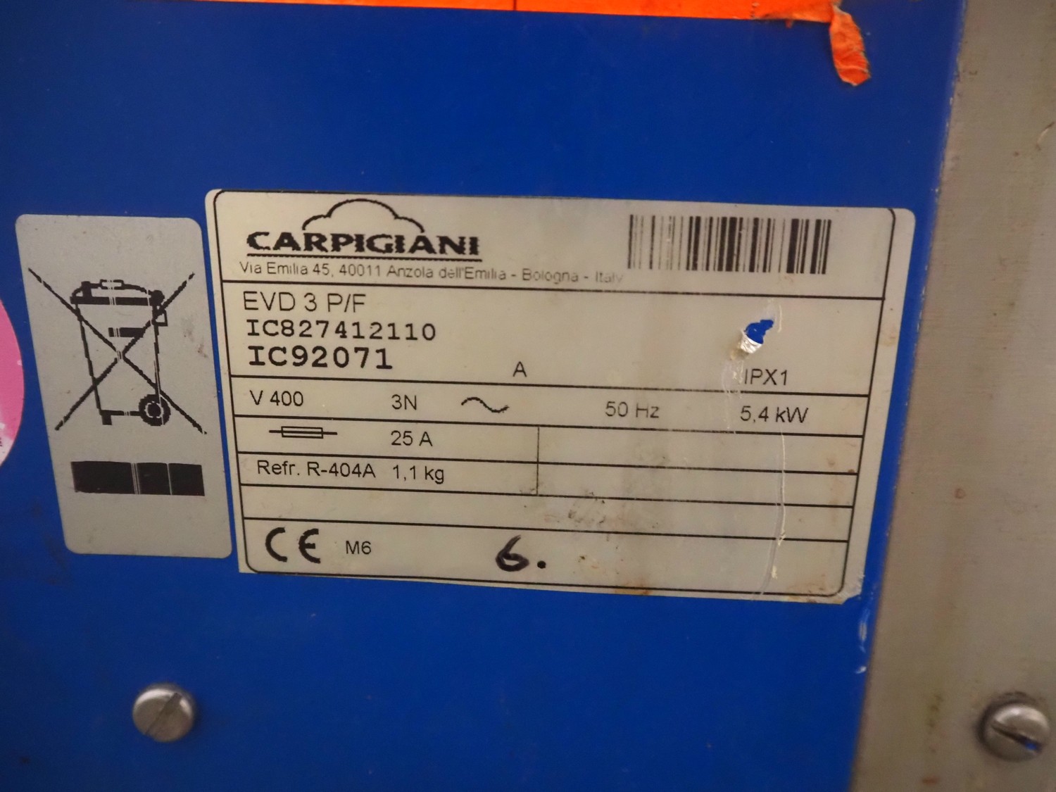 Carpigiani mobile ice cream machine, model: EVD 3 P/F, serial number: IC92071, 400 V, 3 Ph, 50 Hz, 25 A, 5.4 kW, refrigerant: R-404A, 1.1 kg, dimensions: 510 mm x 880 mm x 1780 mm. Incomplete.