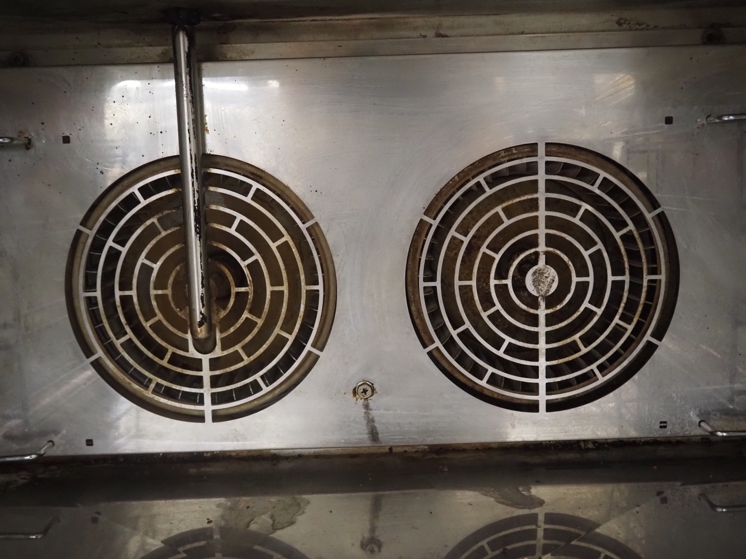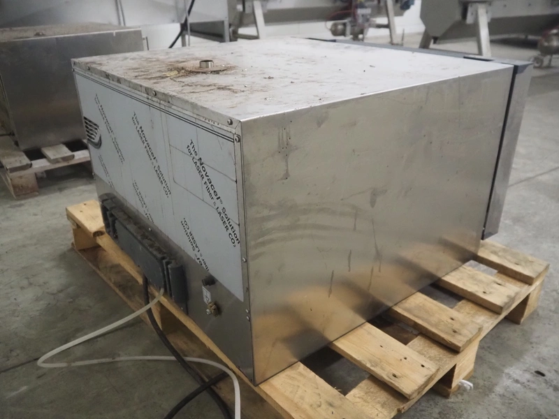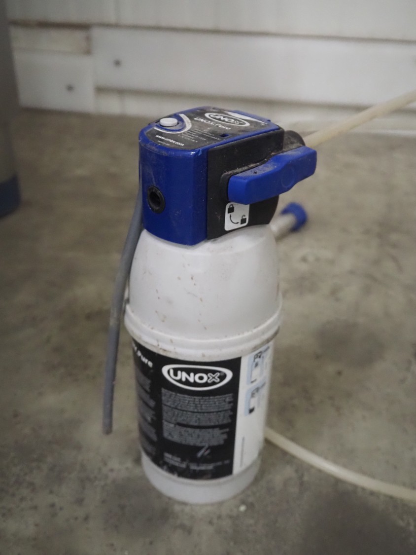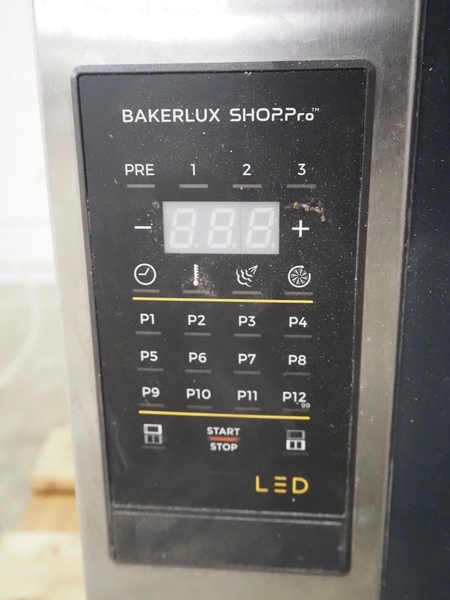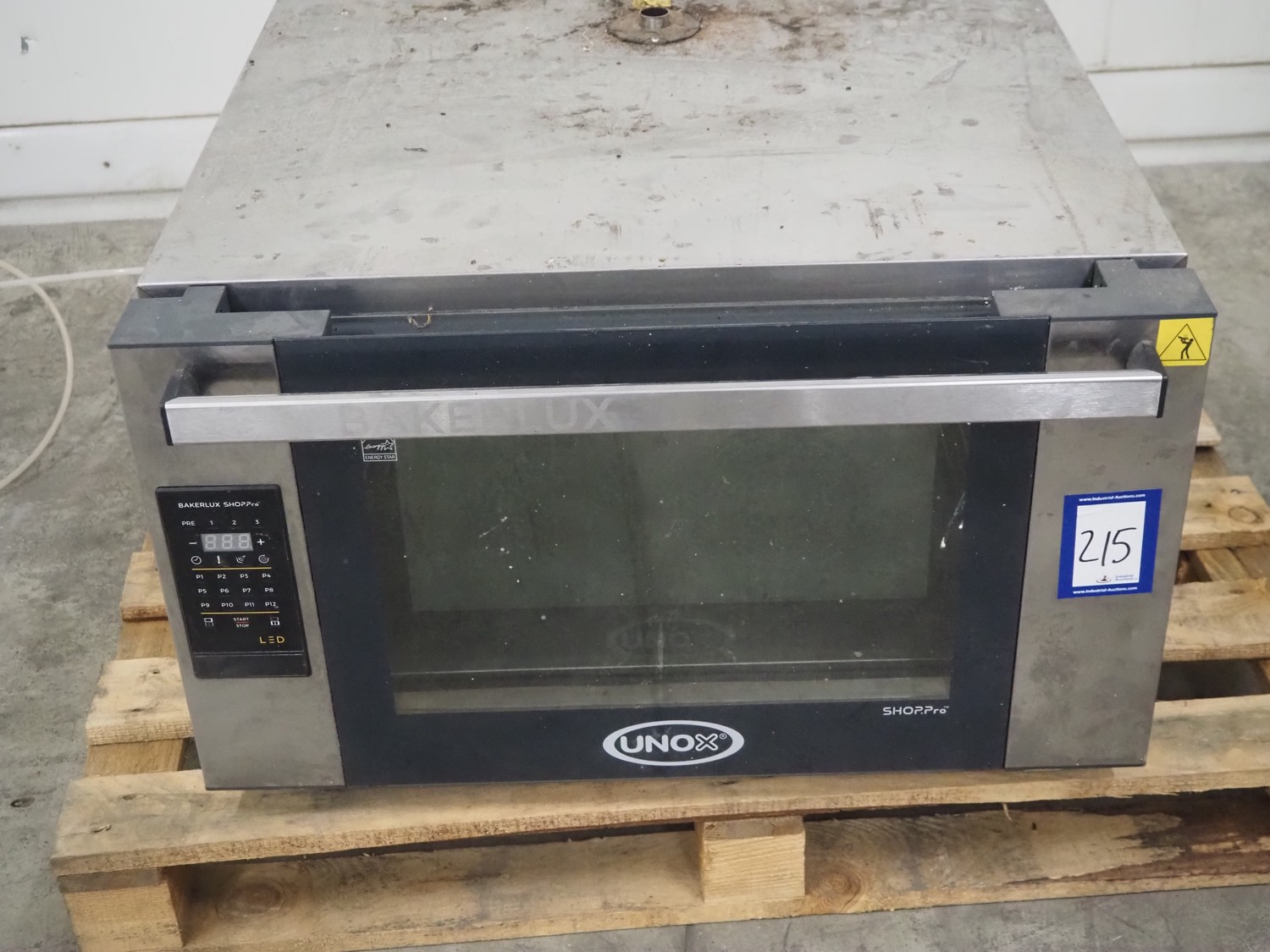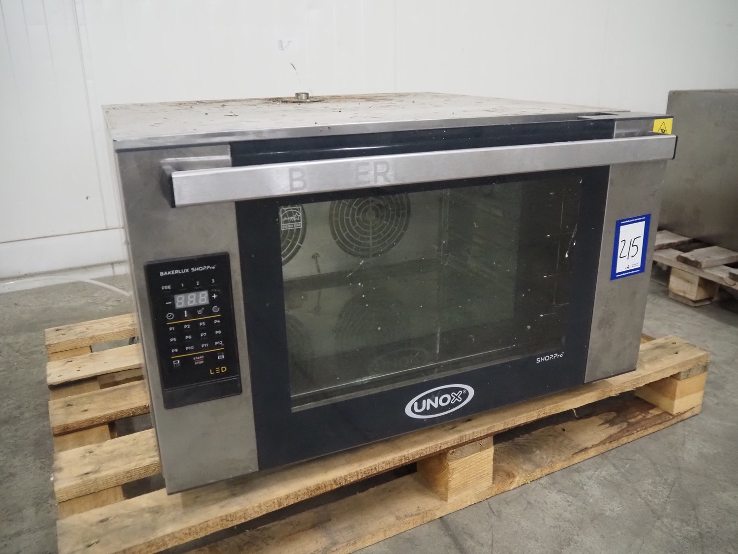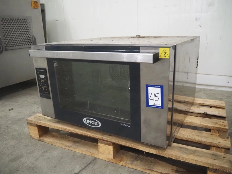 Unox oven, type: XEFT-04EU-ELDV, serial number: 2019A0006215, 380-415 V, 3 Ph, 6.9 kW, weight: 57 kg, 4 floors, floor dimensions: 605 mm x 370 mm, total dimensions: 800 mm x 840 mm x 480 mm.
