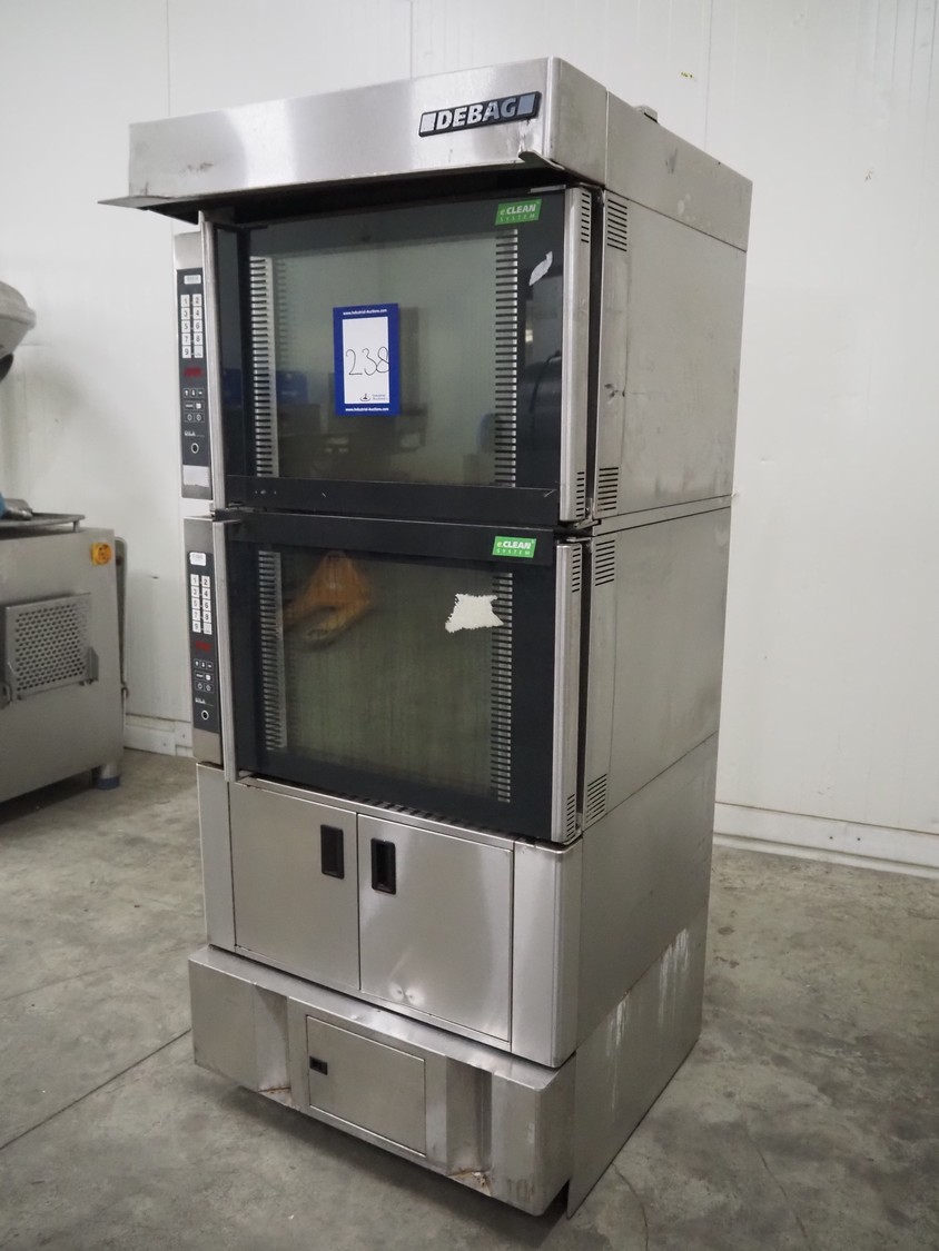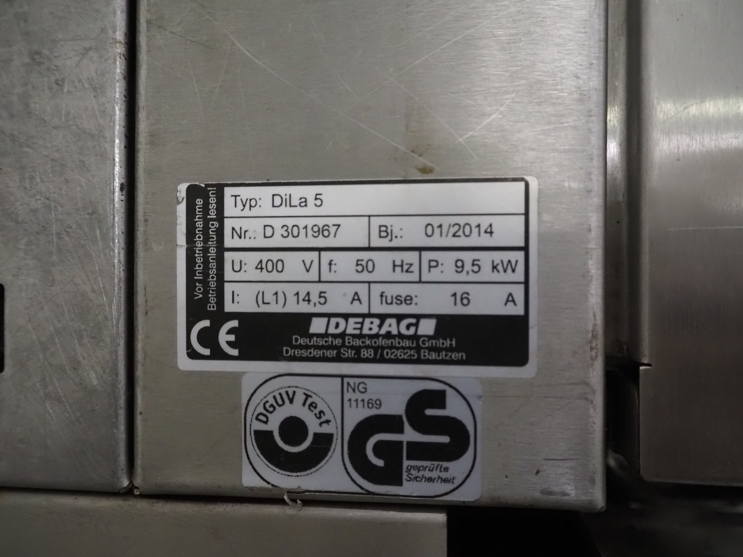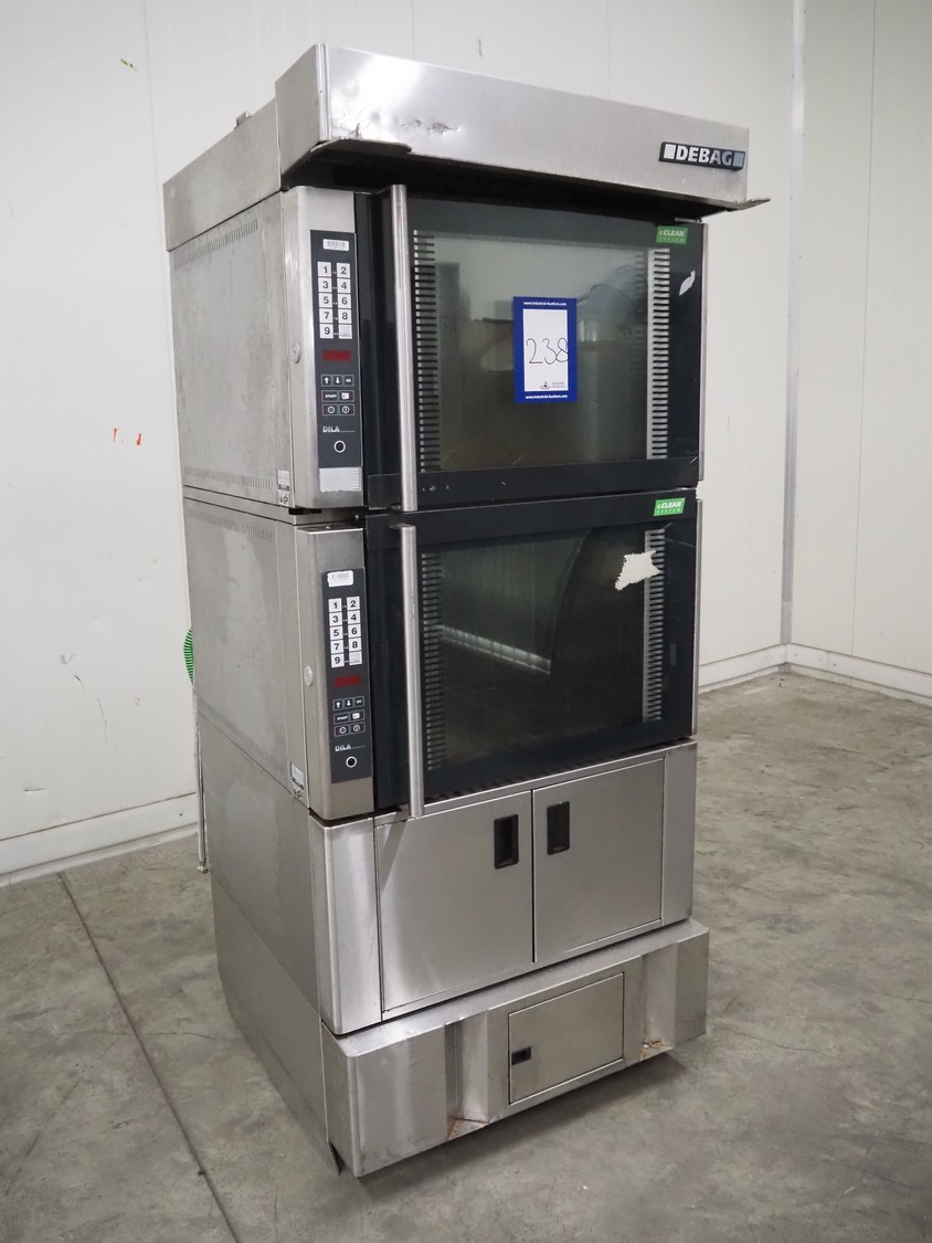 DEBAG double stacked oven, type: Dila 5, serial number: D 301967/D 301968, year of construction: 01/2014, 400 V, 50 Hz, 14.5/16 A, 9.5 kW, inside dimensions: (2x) 700 mm x 440 mm x 440 mm, total dimensions: 1150 mm x 950 mm x 2100 mm.