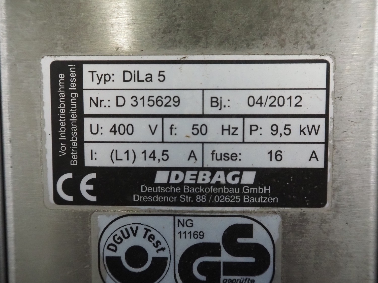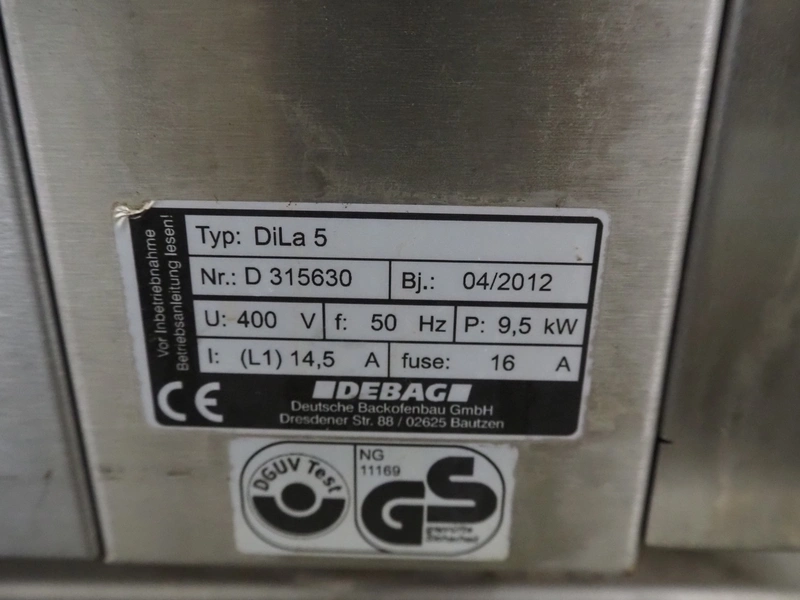 DEBAG double stacked oven, type: Dila 5, serial number: D 315629/D 315630, year of construction: 04/2012, 400 V, 50 Hz, 16 A, 9.5 kW, inside dimensions: (2x) 700 mm x 440 mm x 440 mm, total dimensions: 1135 mm x 1050 mm x 1600 mm.