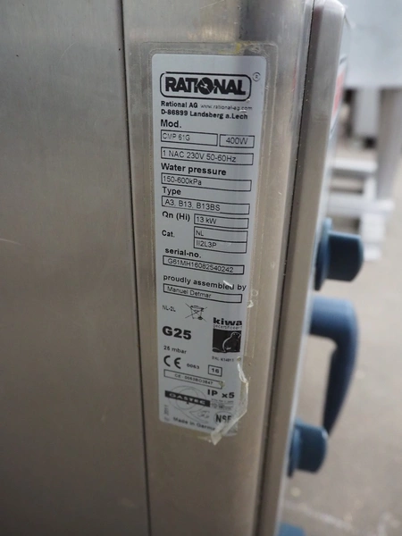 Rational combisteamer, type: CMP 61G, serial number: G61MH16082540242, 230 V, 50/60 Hz, 13 kW, gas heated, 6 floor, floor dimensions: 550 mm x 330 mm, total dimensions: 860 mm x 800 mm x 820 mm.
