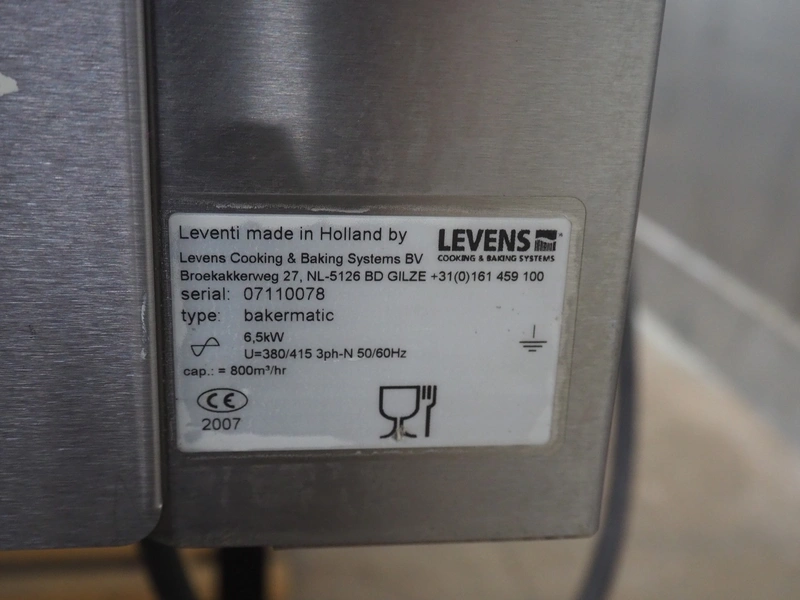 Leventi mobile bread oven, type: bakermatic, serial number: 07110078, year of construction: 2007, 380/415 V, 3 Ph, 50/60 Hz, 6.5 kW, dimensions: 1700 mm x 850 mm x 1500 mm.
