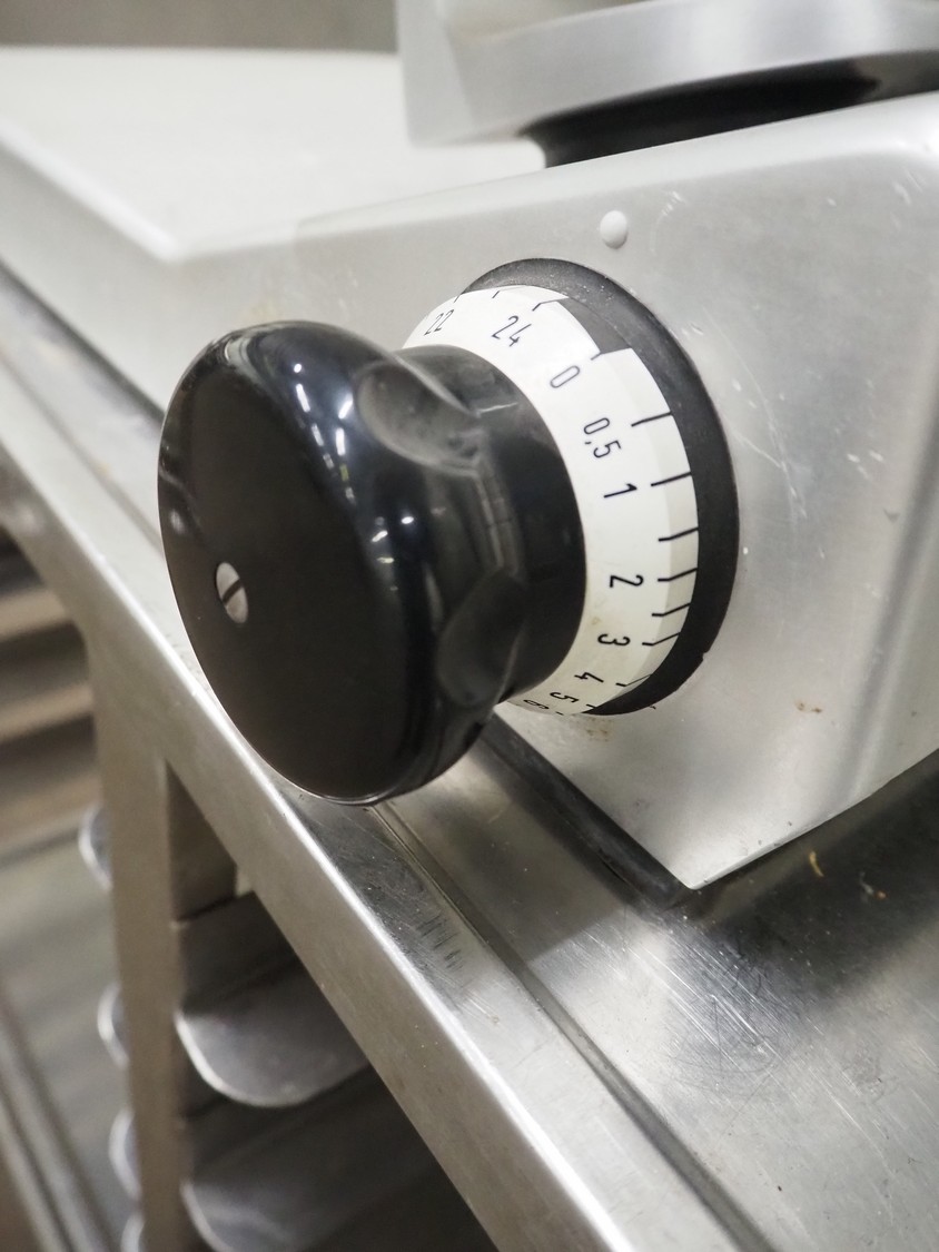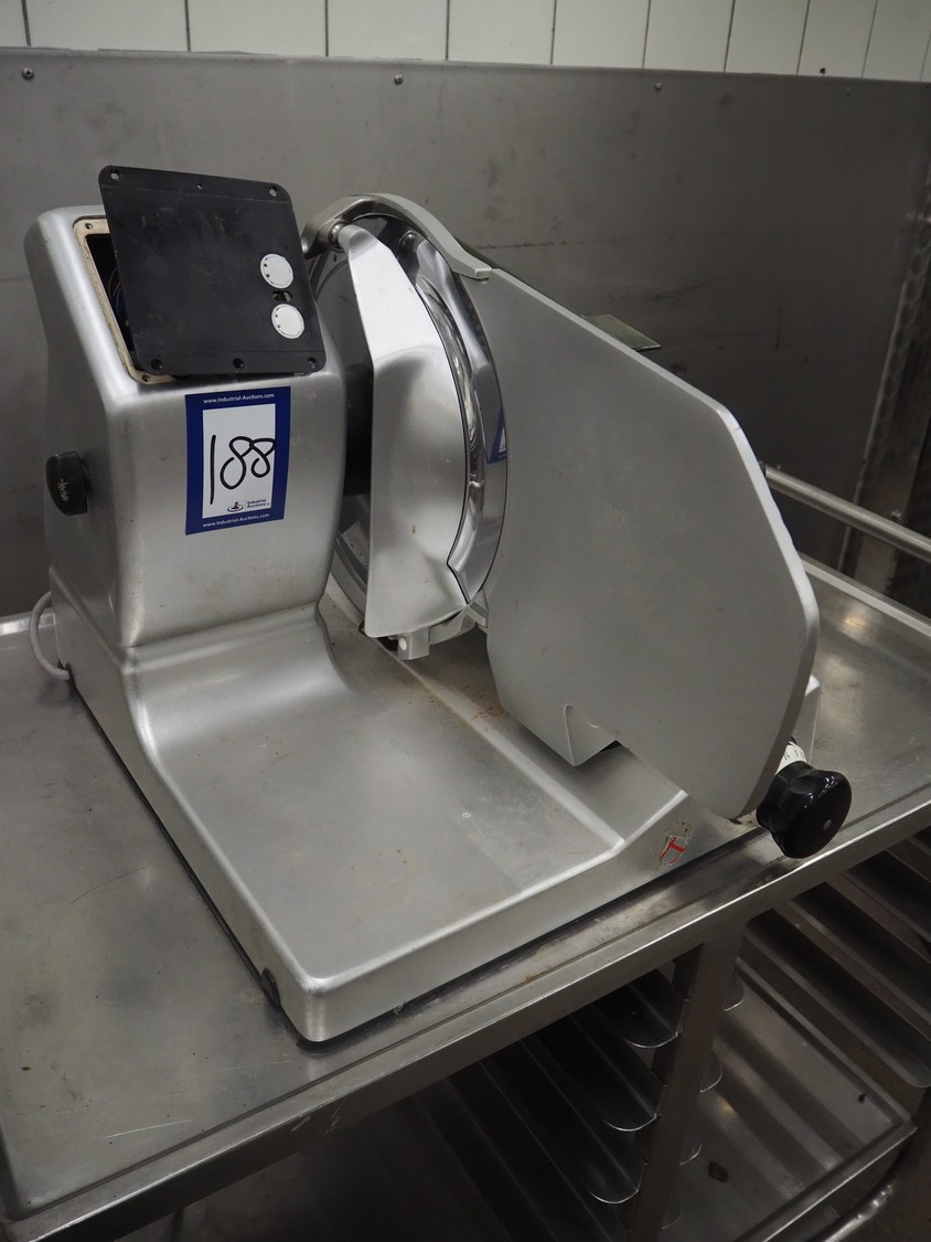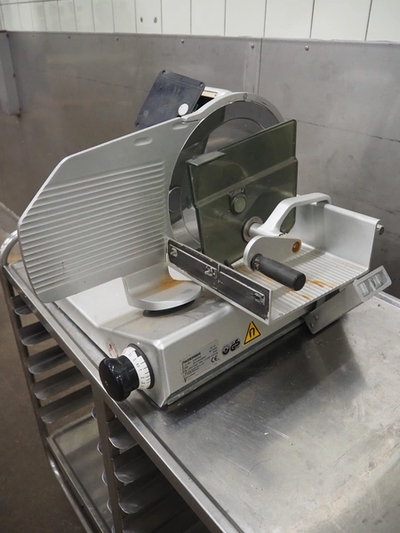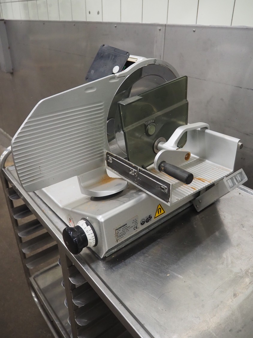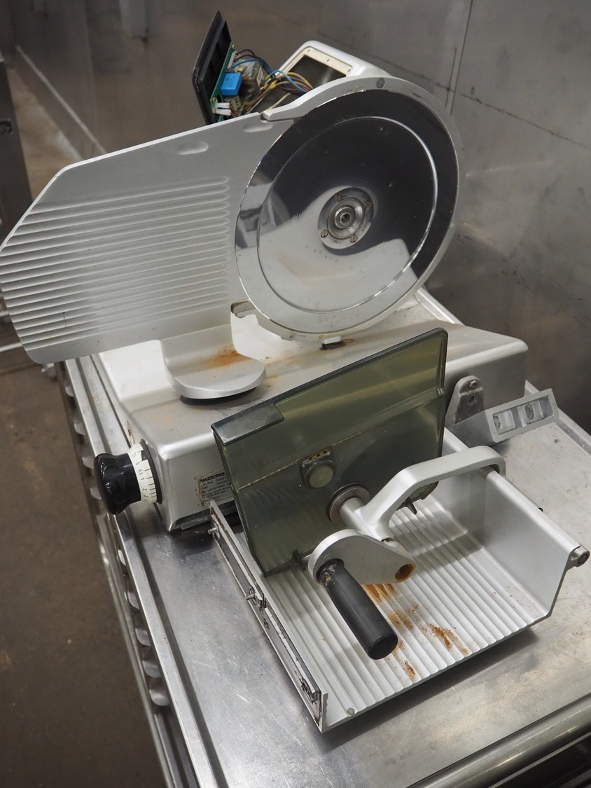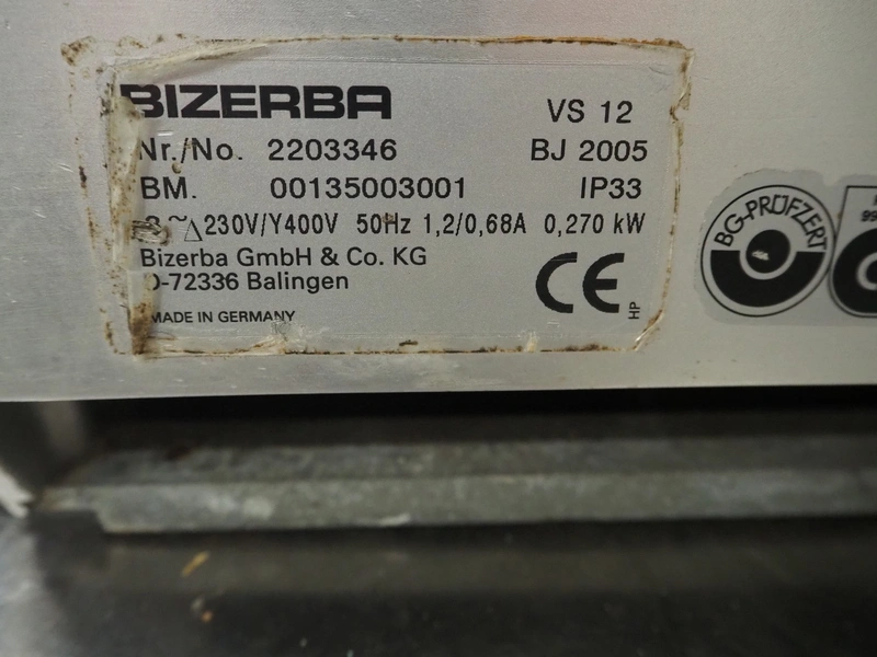 Bizerba slicer, model: VS 12, number: 2203346, year of construction: 2005, 230/400 V, 3 Ph, 50 Hz, 1.2/0.68 A, 0.270 kW, dimensions: 600 mm x 540 mm x 420 mm. Defect.