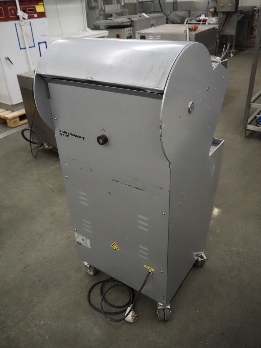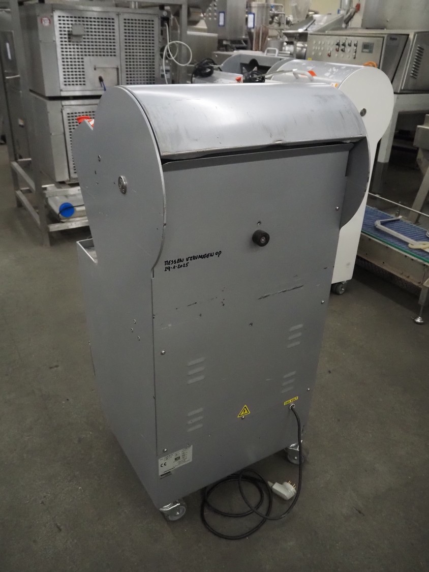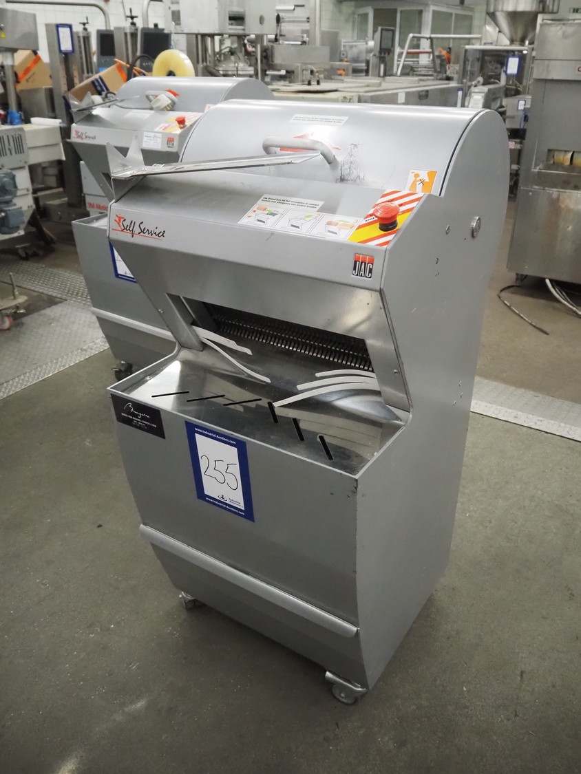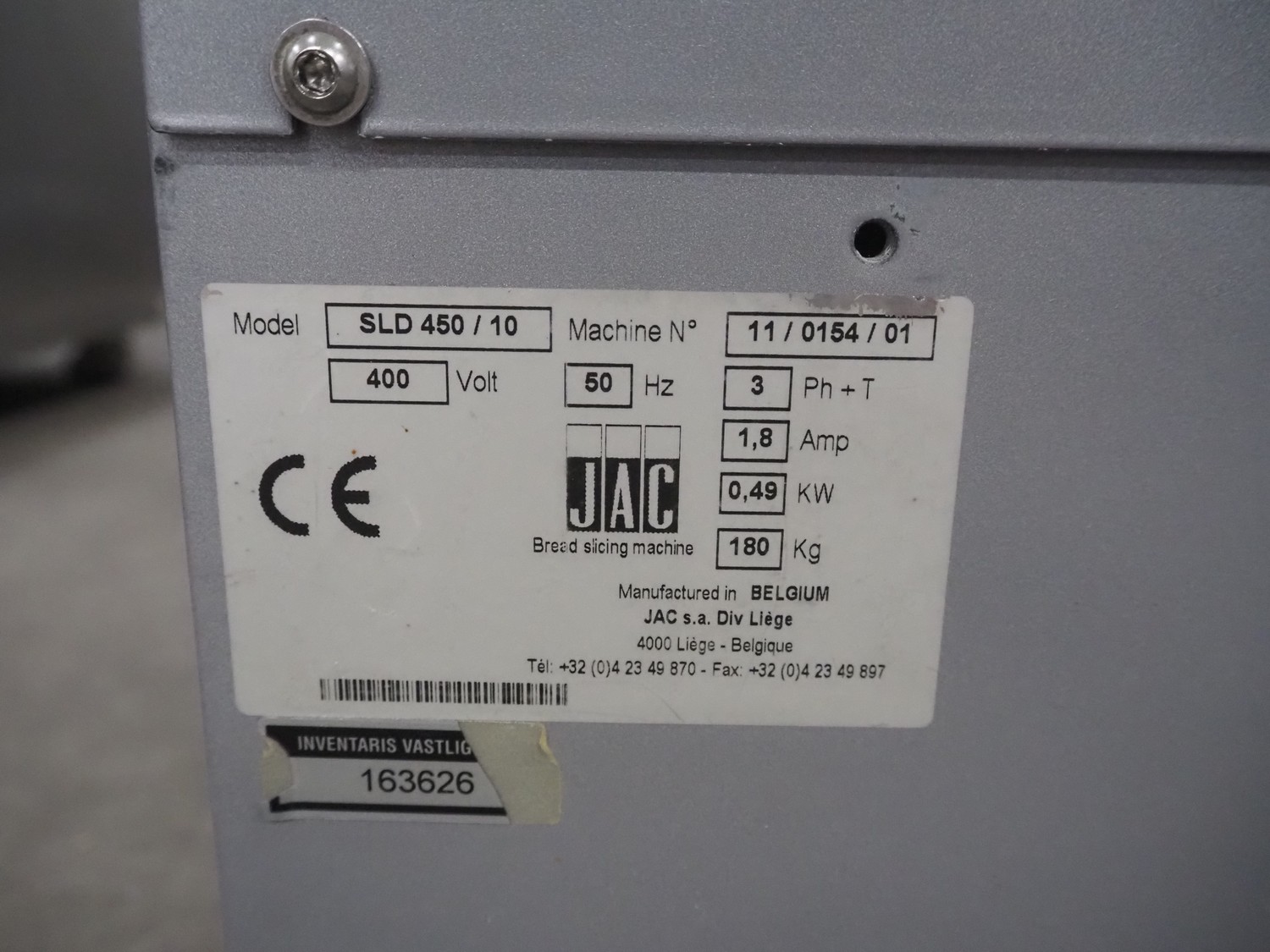 Jac mobile bread slicer, model: SLD 450/10, machine number: 11/0154/01, 400 V, 3 Ph, 50 Hz, 1.8 A, 0.49 kW, weight: 180 kg, working width: 440 mm, 41 knifes, distance between knifes: 11 mm, total dimensions: 700 mm x 600 mm x 1300 mm.
