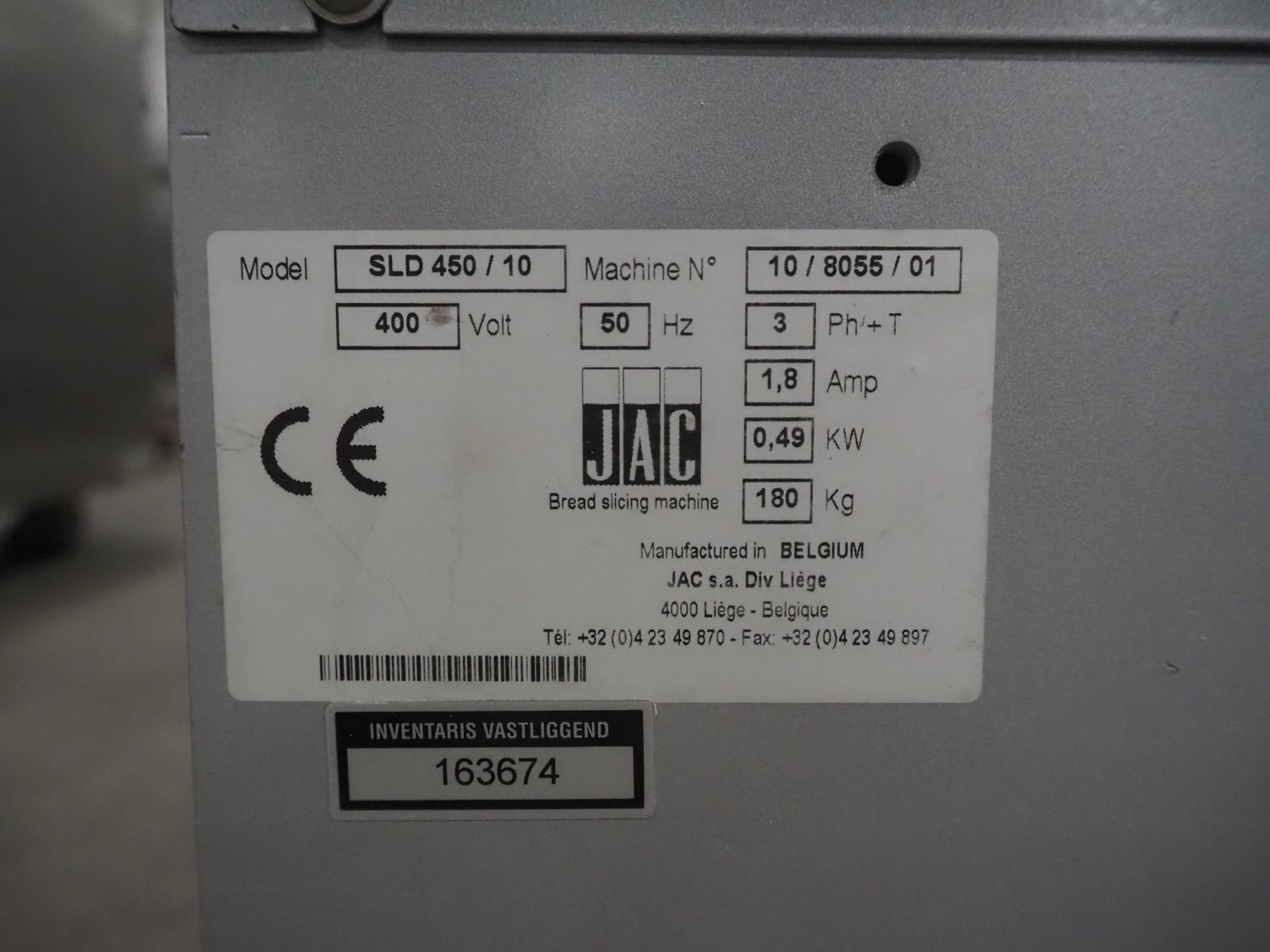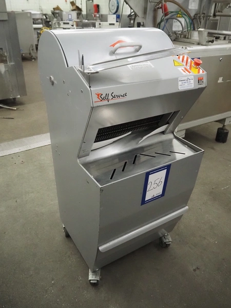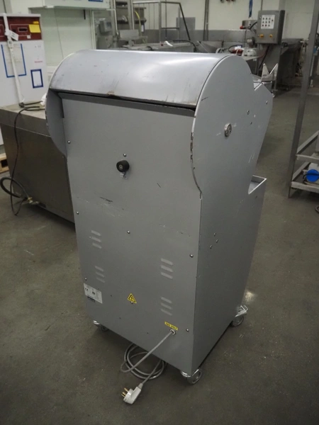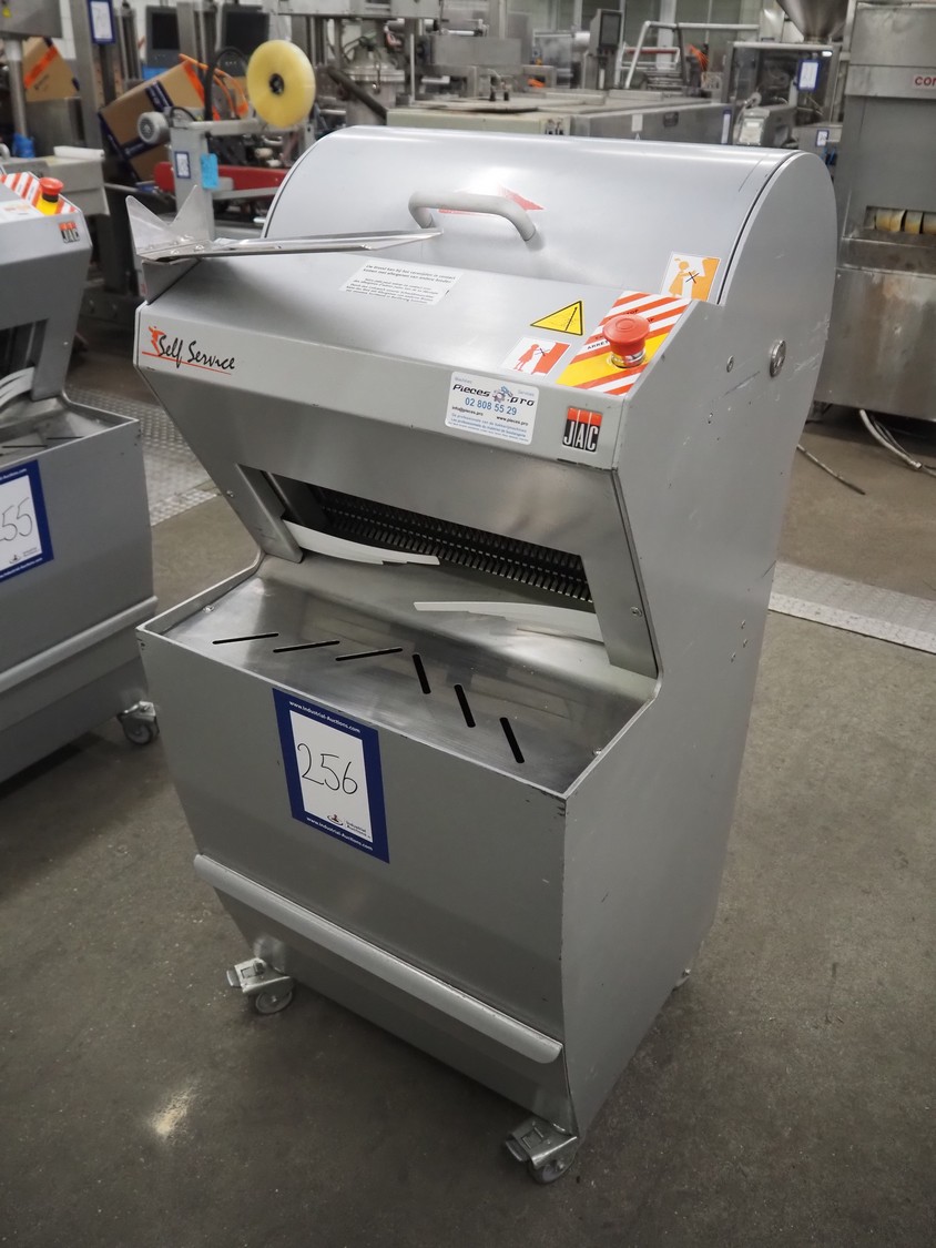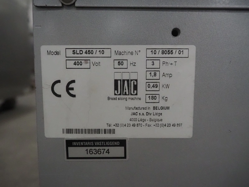 Jac mobile bread slicer, model: SLD 450/10, machine number: 10/8055/01, 400 V, 3 Ph, 50 Hz, 1.8 A, 0.49 kW, weight: 180 kg, working width: 440 mm, 41 knifes, distance between knifes: 10 mm, total dimensions: 700 mm x 600 mm x 1300 mm.