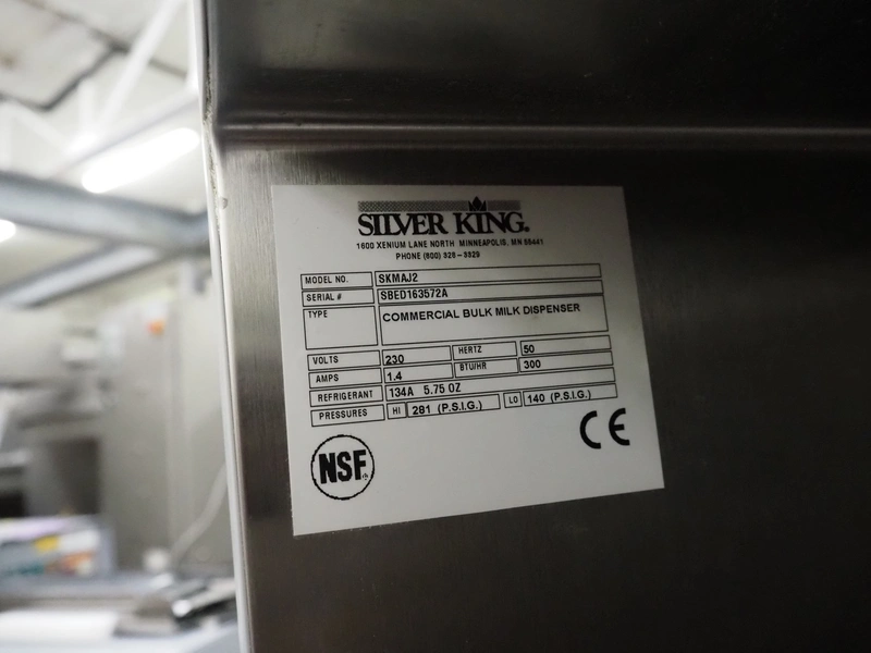 Silver King milk dispenser, model: SKMAJ2, serial number: SBED163572A, 230 V, 50 Hz, 1.4 A, refrigerant: 134A, inside dimensions: (2x) 290 mm x 260 mm x 500 mm, total dimensions: 720 mm x 440 mm x 1000 mm.