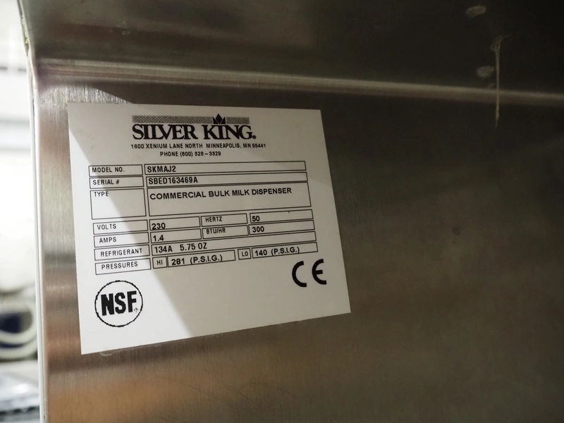 Silver King milk dispenser, model: SKMAJ2, serial number: SBED163469A, 230 V, 50 Hz, 1.4 A, refrigerant: 134A, inside dimensions: (2x) 290 mm x 260 mm x 500 mm, total dimensions: 720 mm x 440 mm x 1000 mm.