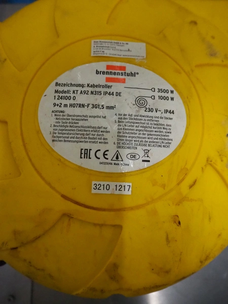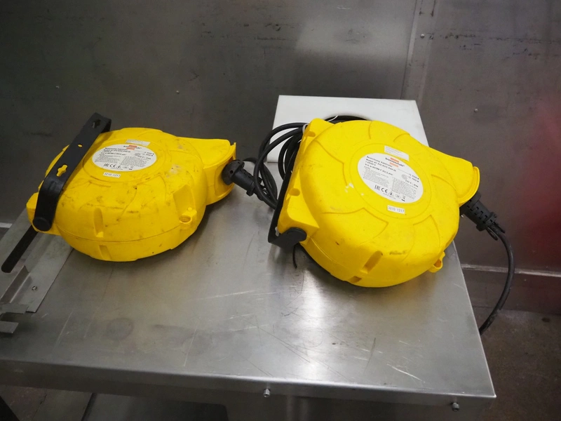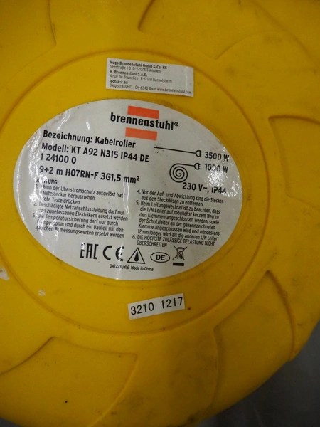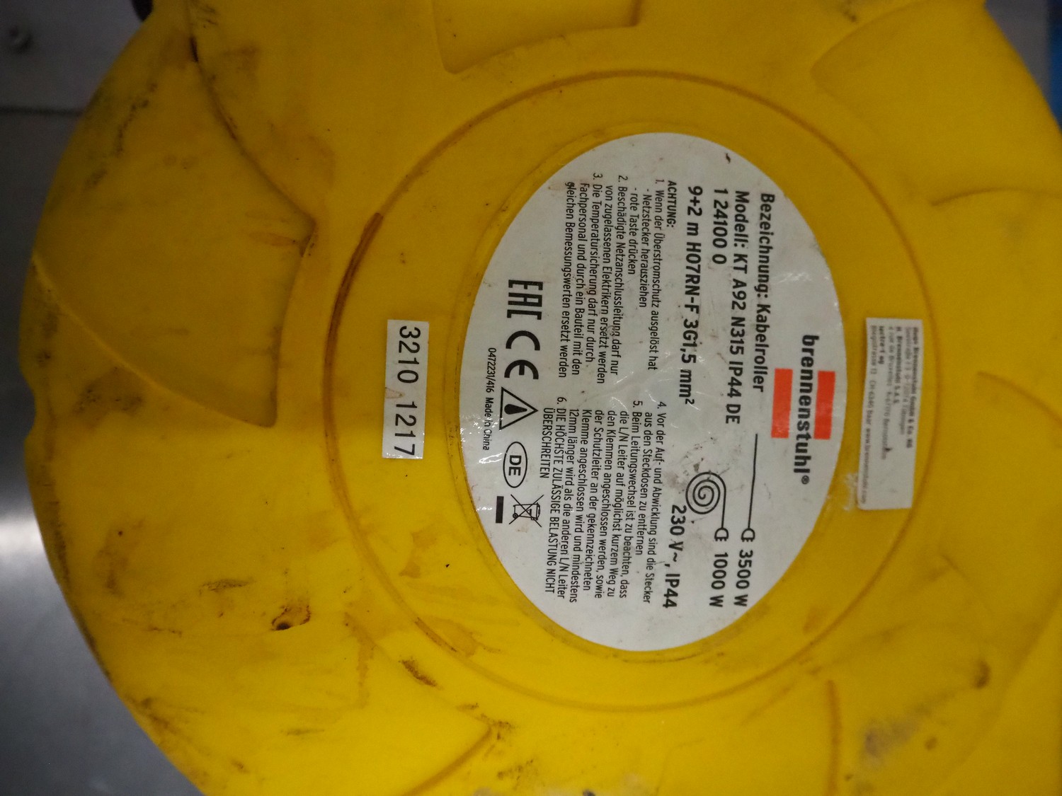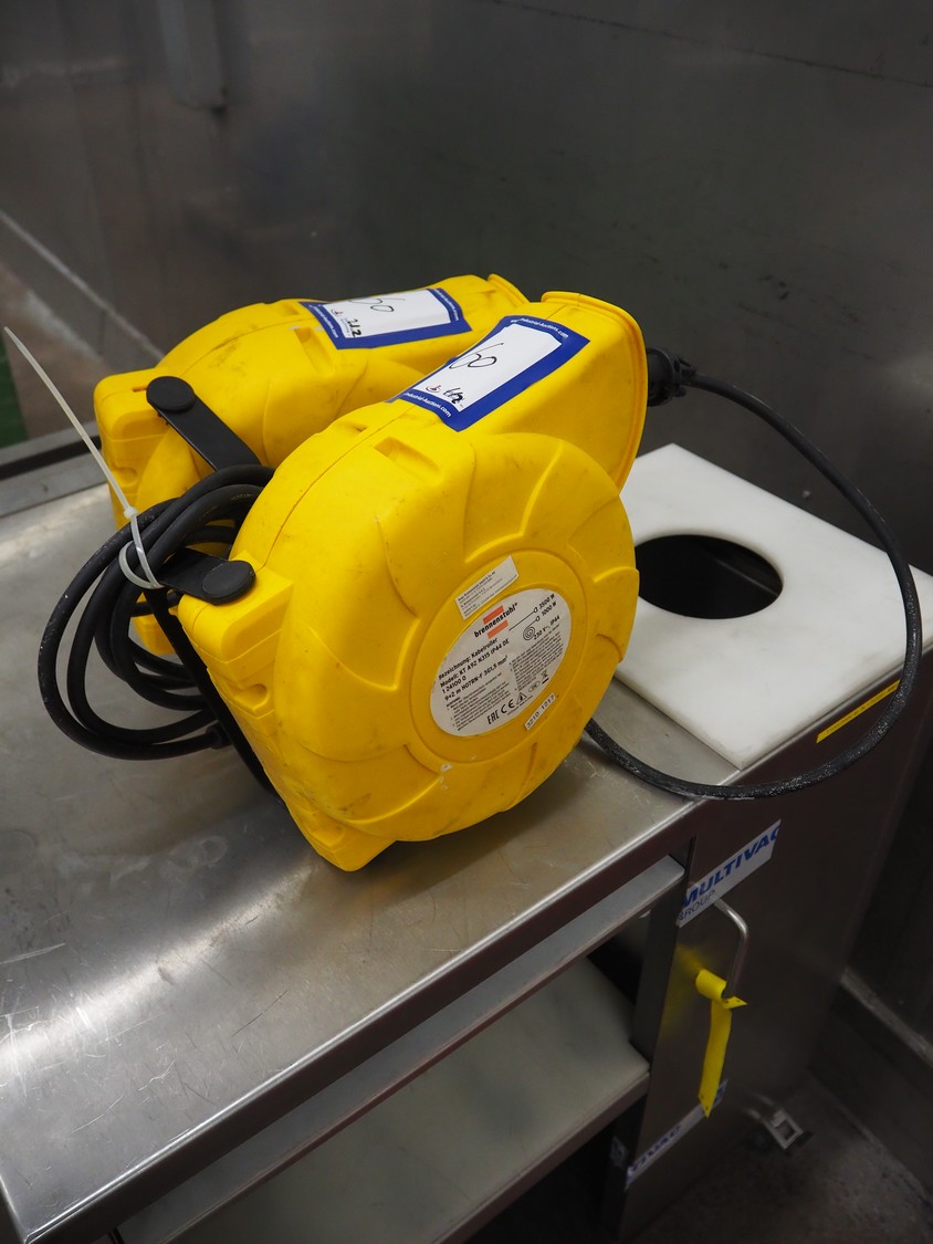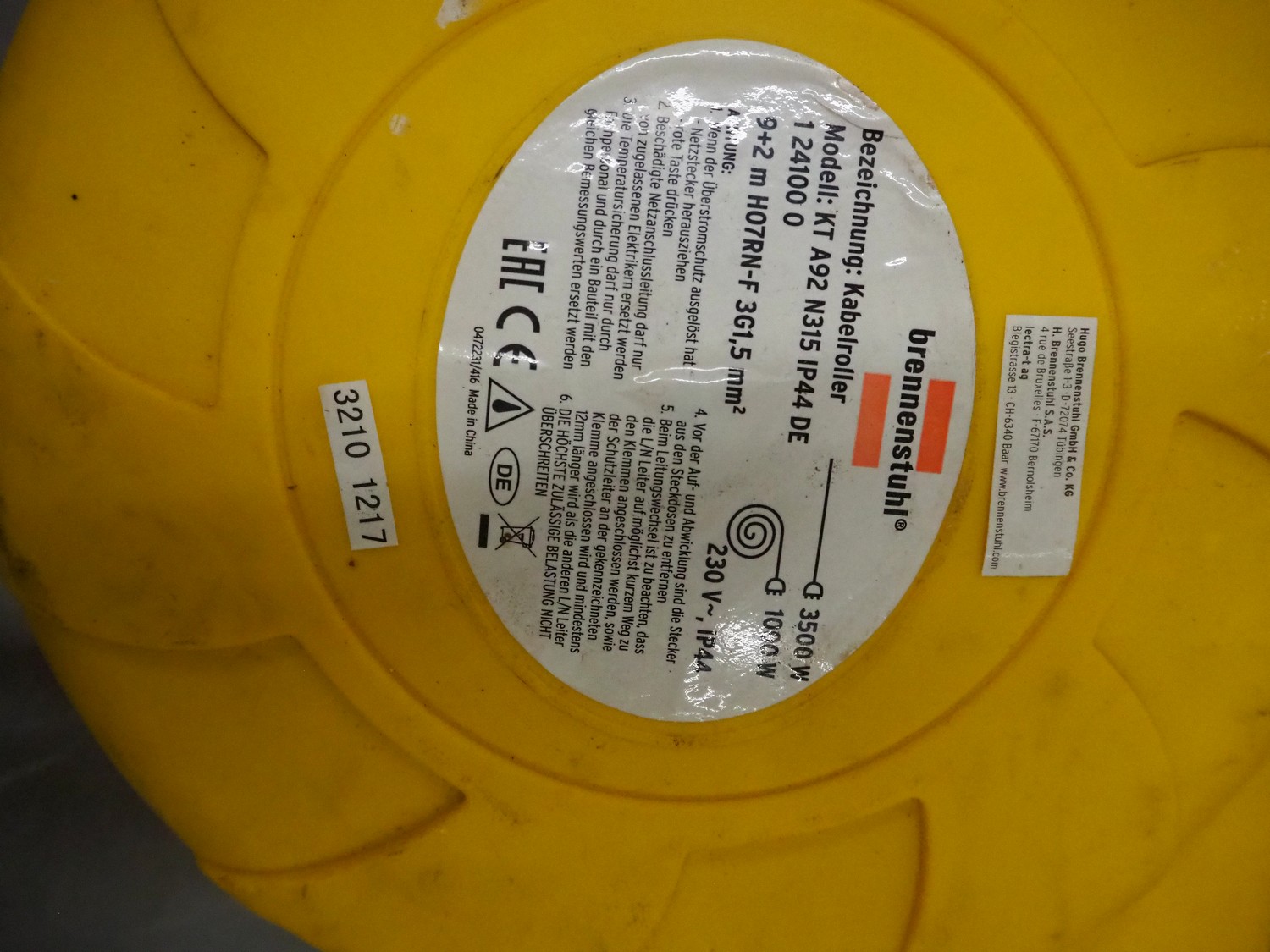 2 Brennenstuhl hose reels with electric cable, model: KT A92 N315, 230 V, unrolled: 3500 W, rolled: 1000 W, length: (2x) 11 meter.