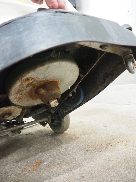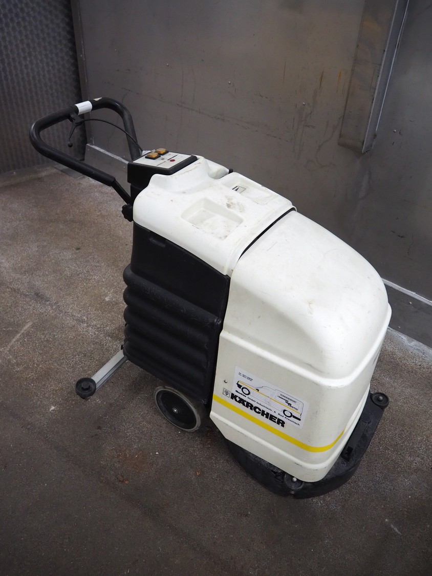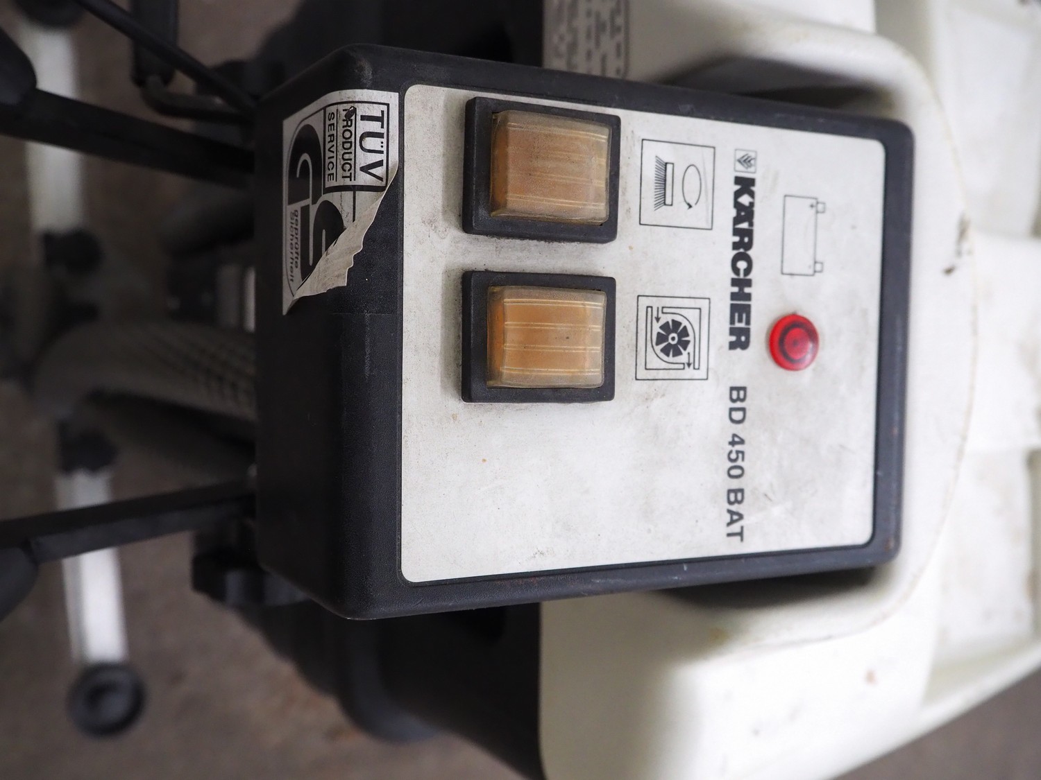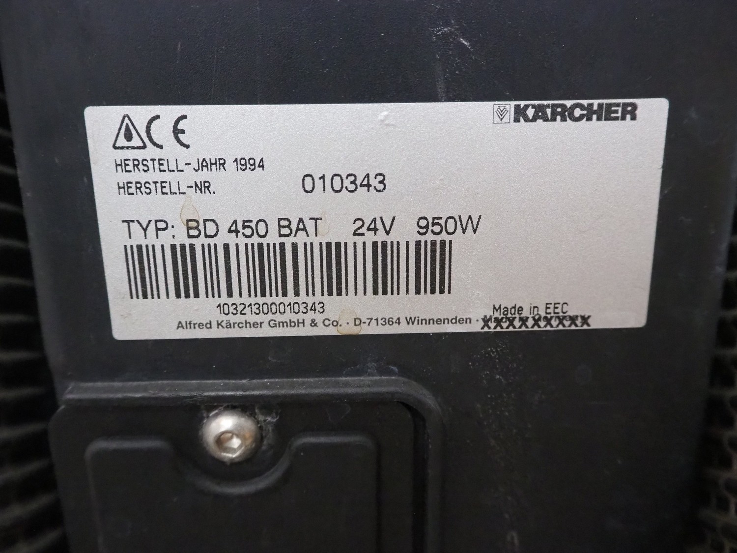 Kärcher floor scrubbing machine, type: BD 450 BAT, number: 010343, year of construction: 1994, 24 V, 950 W, dimensions: 1200 mm x 700 mm x 900 mm. Missing brush.