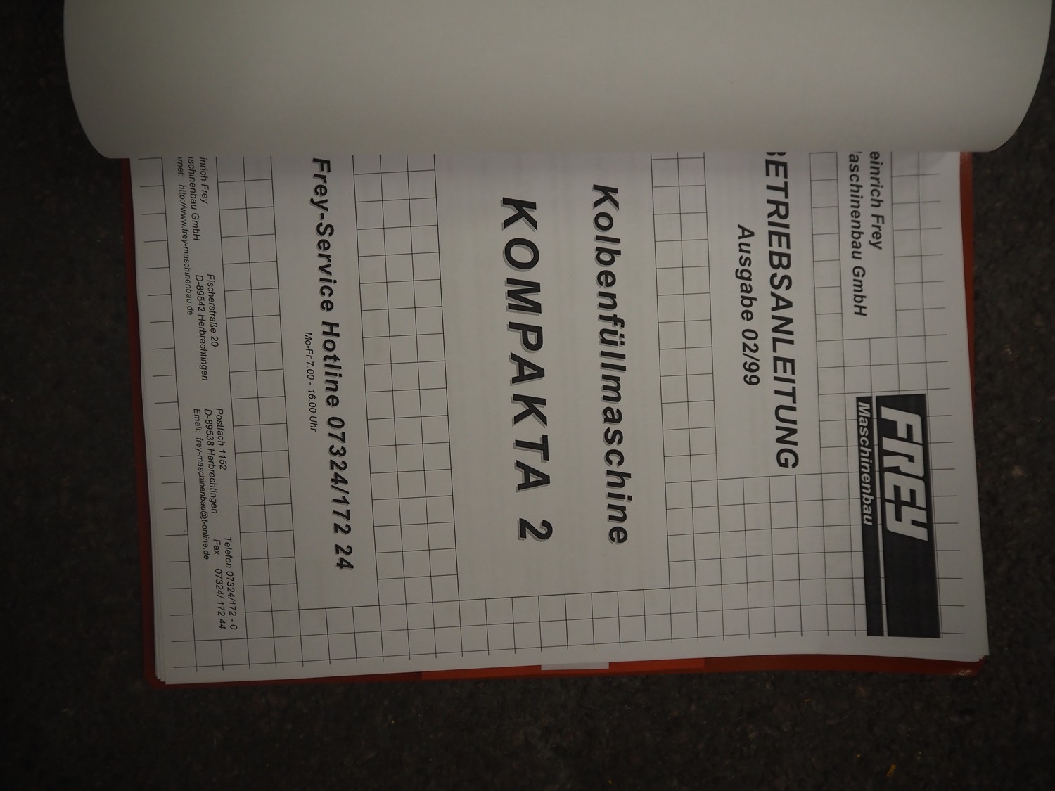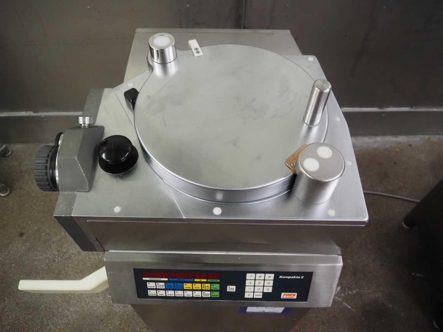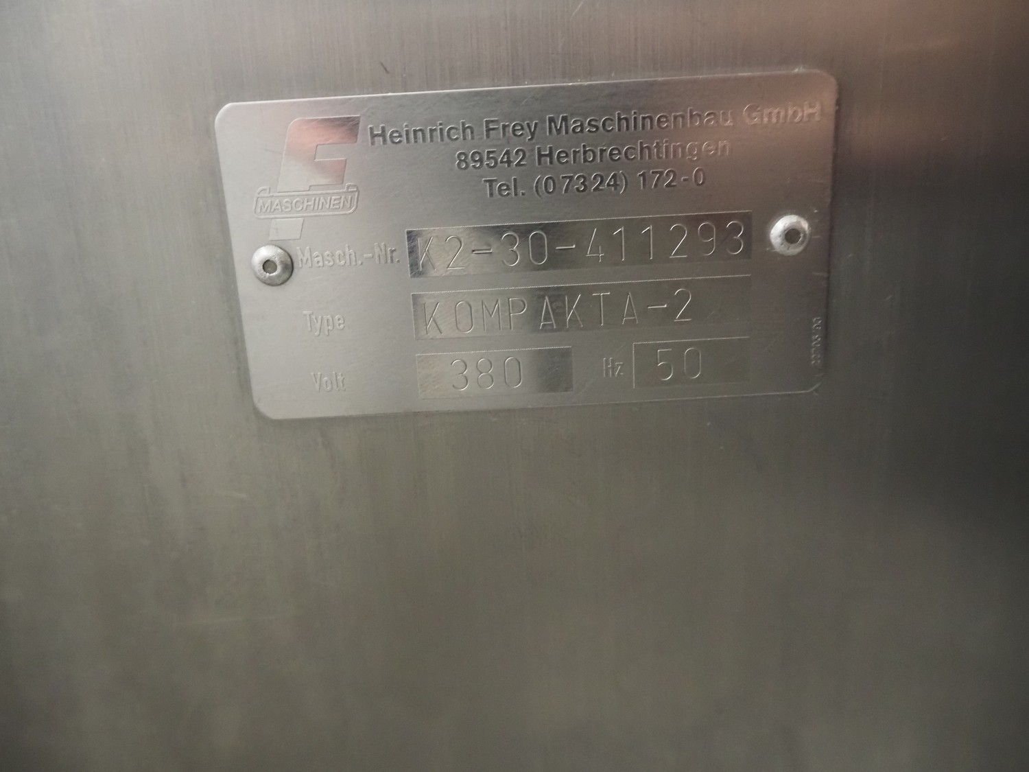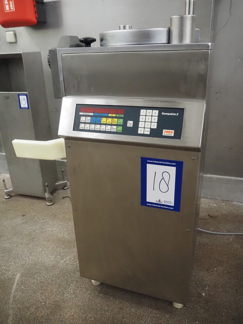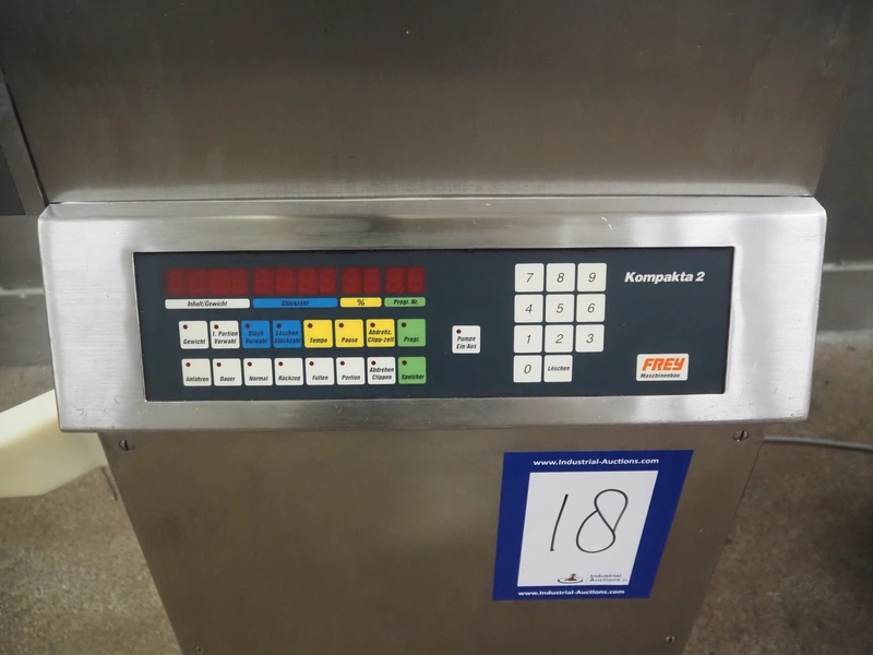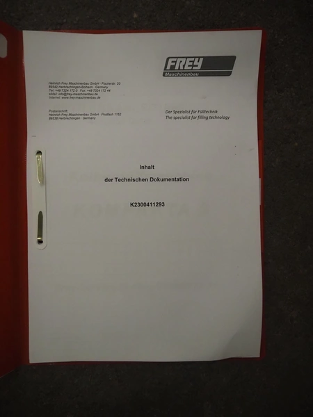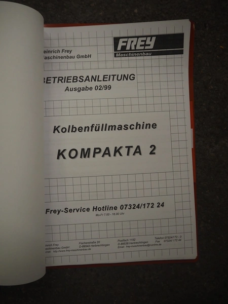 Frey Maschinenbau GmbH piston filler, type: KOMPAKTA-2, machine number: K2-30-411293, 380 V, 50 Hz, dimensions: 760 mm x 700 mm x 1240 mm. Including box with parts.