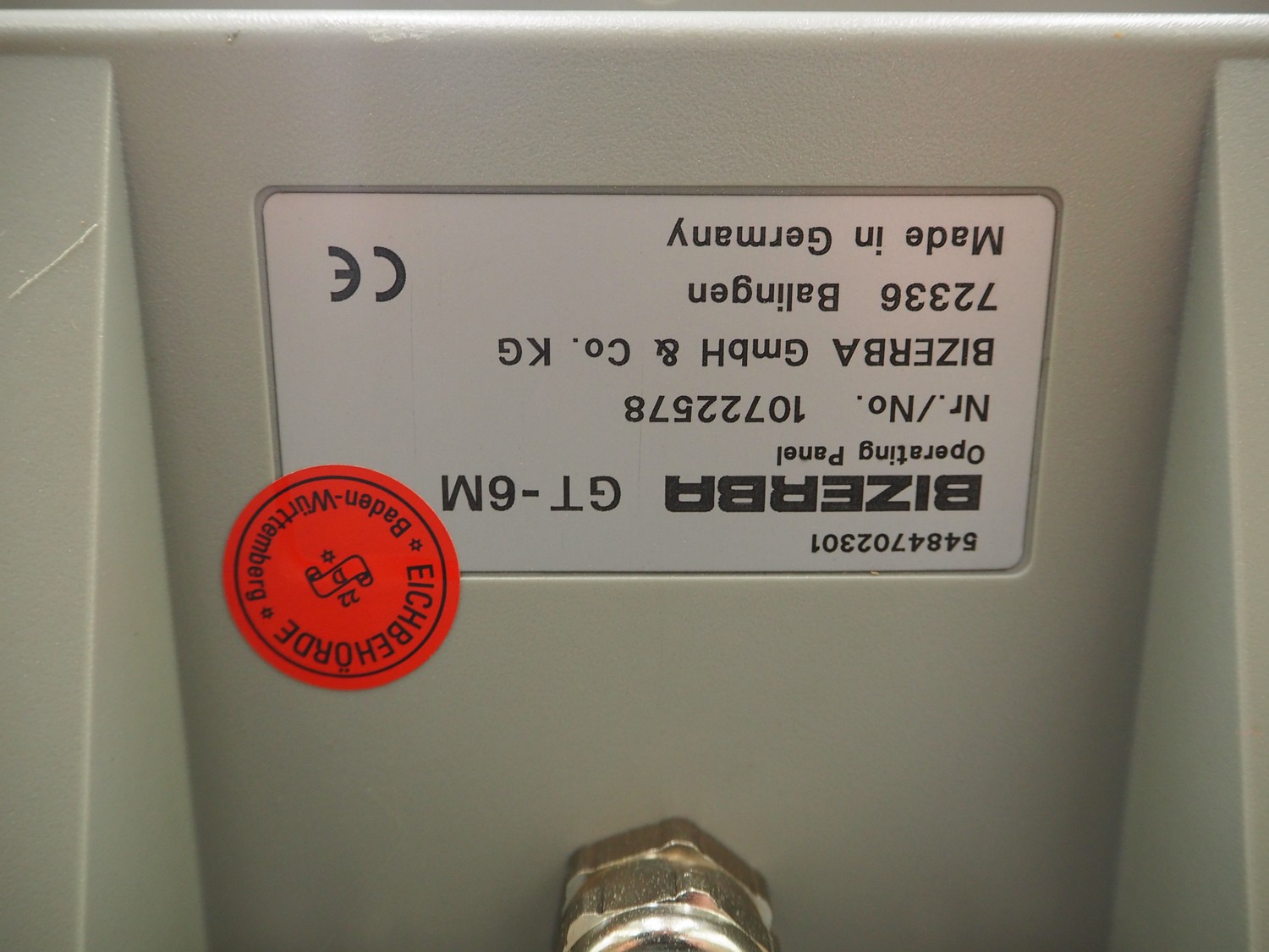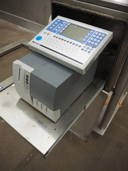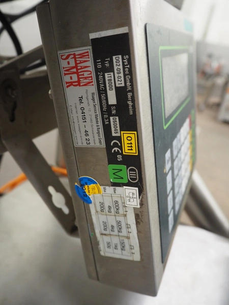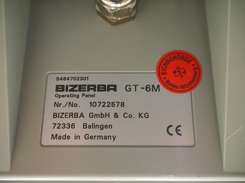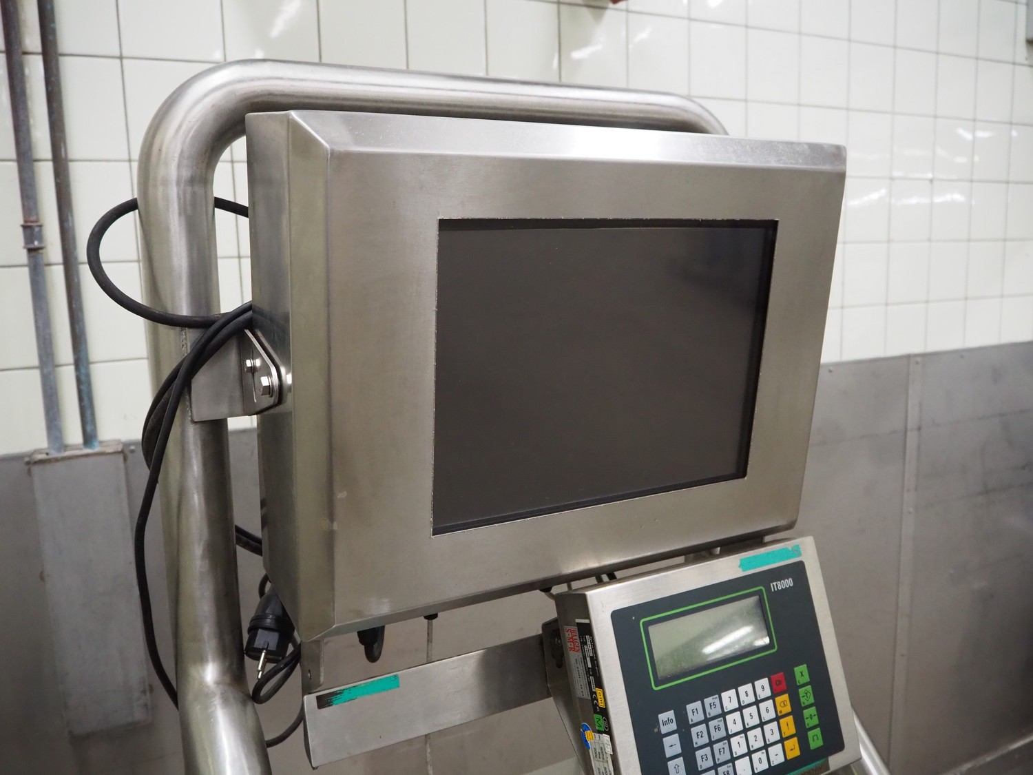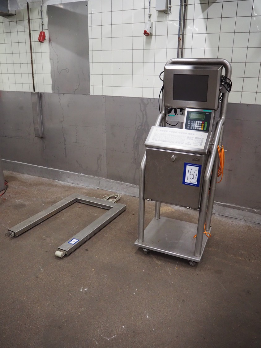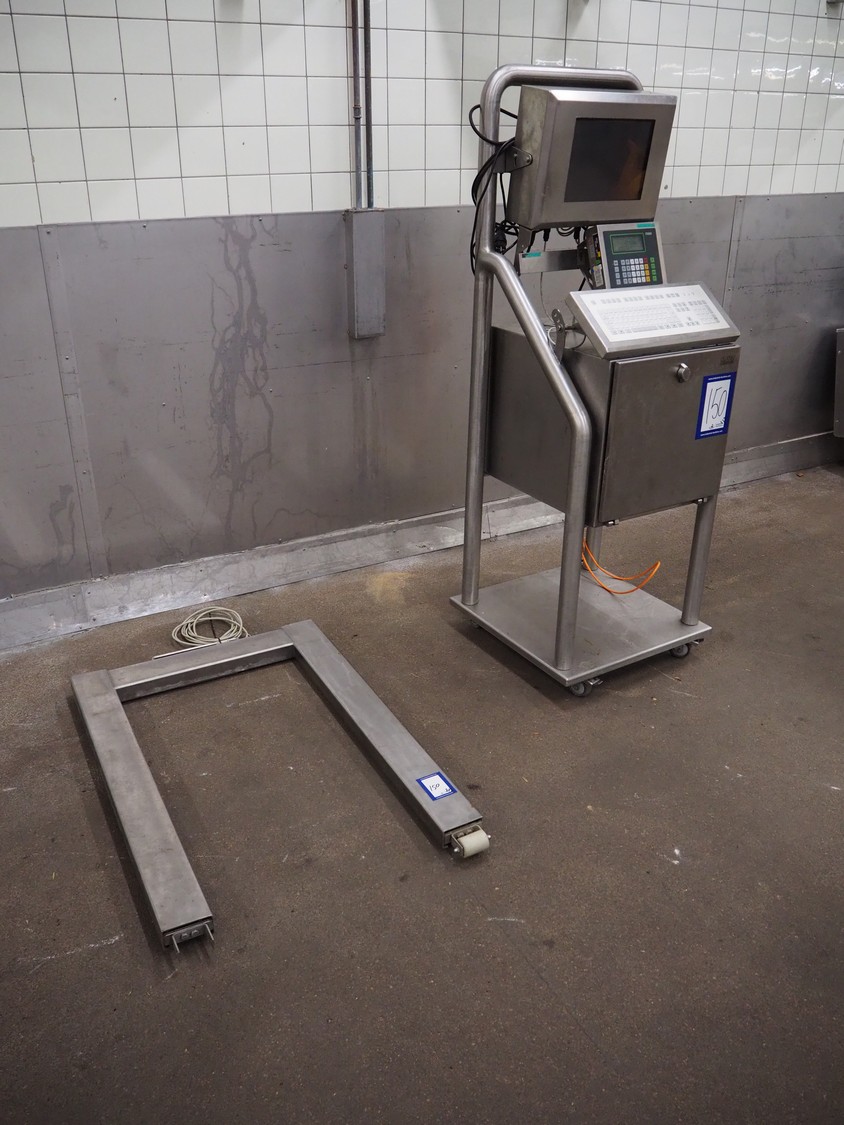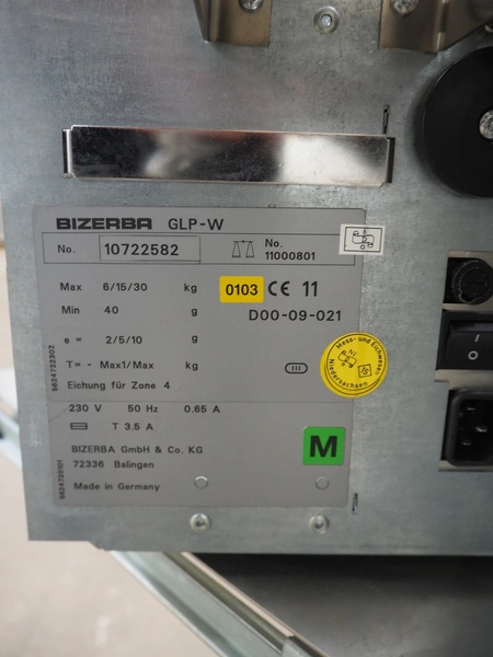 Bizerba pallet weighing scale with indicator and labelling machine, type indicator: GT-6M, number: 10722578, type labelling machine: GLP-W, number: 11000801, maximum weight: 6/15/30 kg, minimum weight: 40 gram, e= 2/5/10 gram, 230 V, 50 Hz, 0.65 A, dimensions scale: 1250 mm x 640 mm x 1850 mm, dimensions s/s cabinet: 650 mm x 640 mm x 1850 mm.