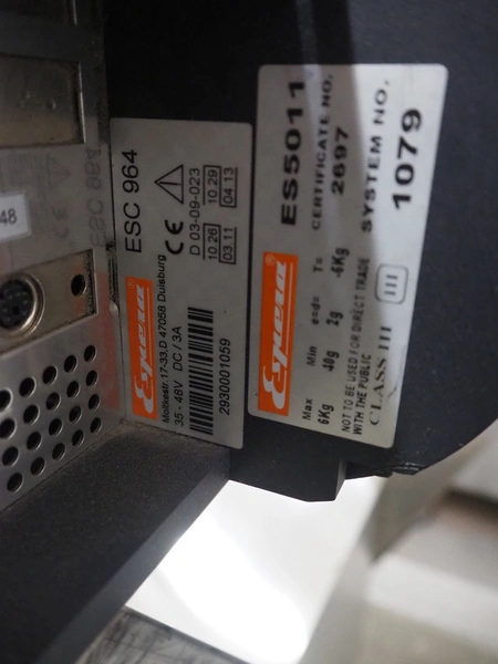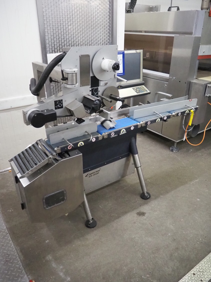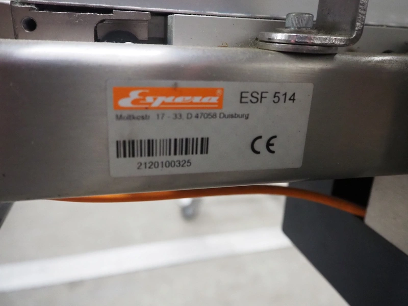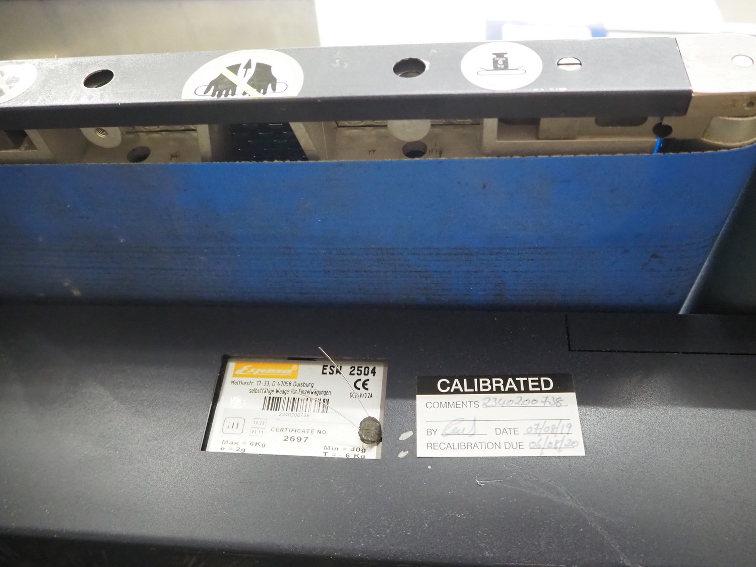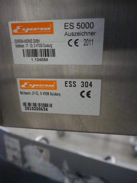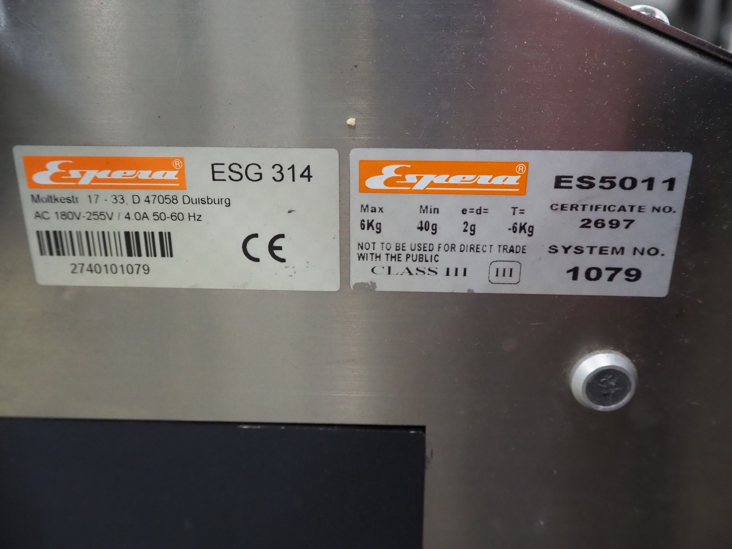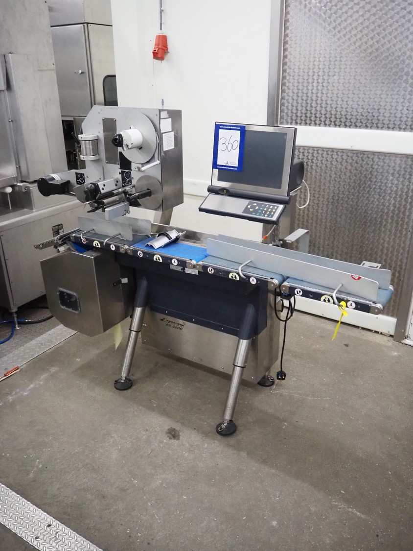 Espera weighing and labelling machine with top and bottom labeller, type: ES 5000, year of construction: 2011, type weigher: ESW 2504, maximum weight: 6 kg, minimum weight: 40 gram, e= 2 gram, T= -6 kg, type labelling units: ESD 564, plastic belt, belt width: 140 mm, total dimensions: 1800 mm x 800 mm x 1500 mm.