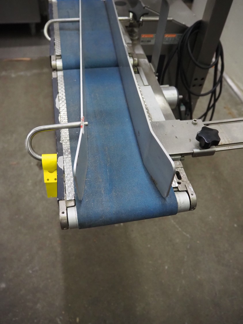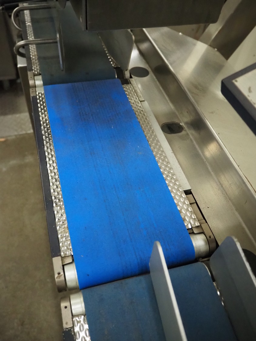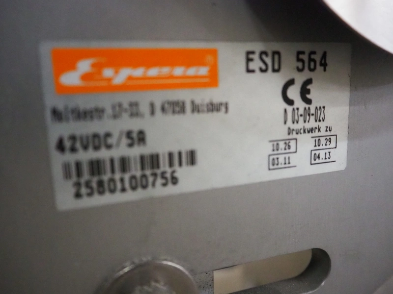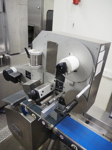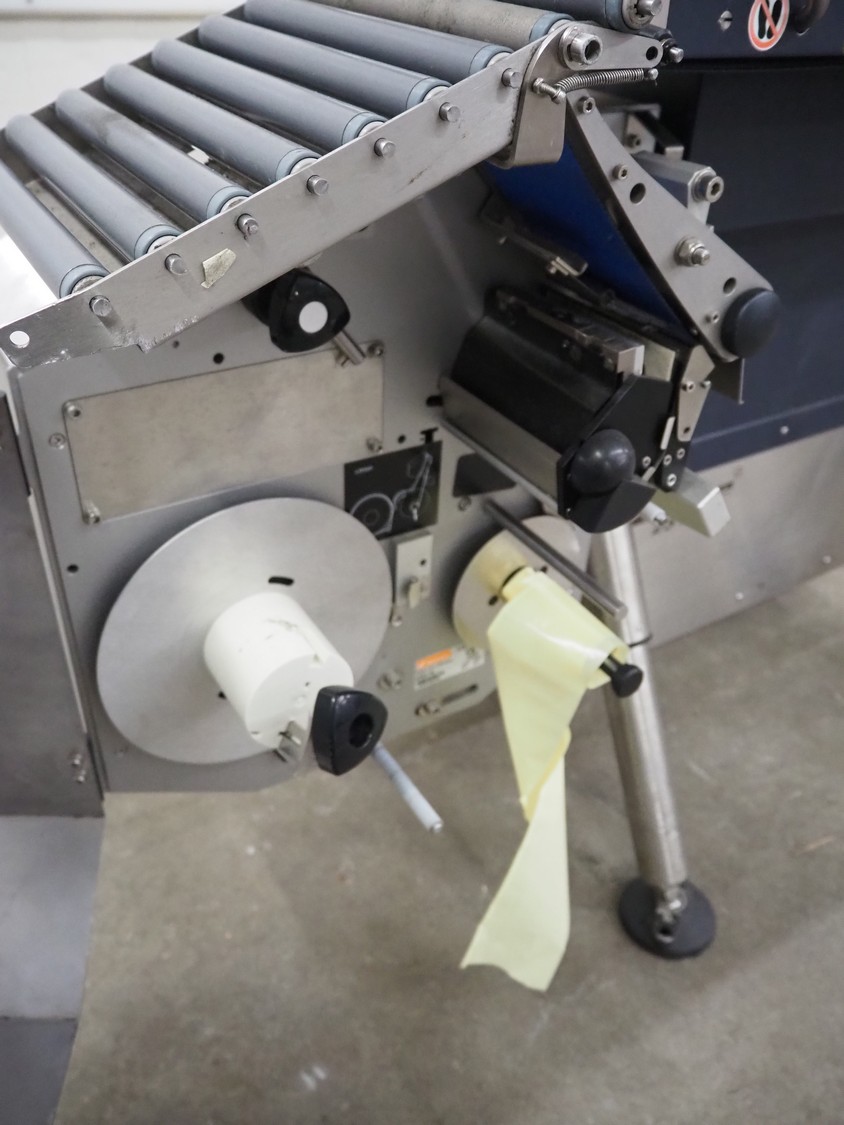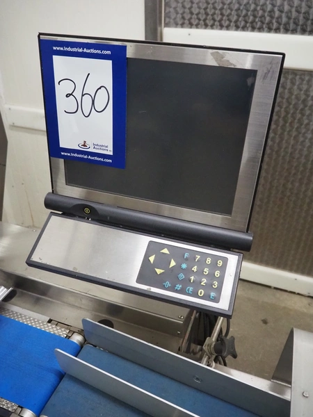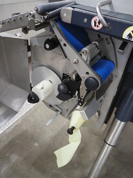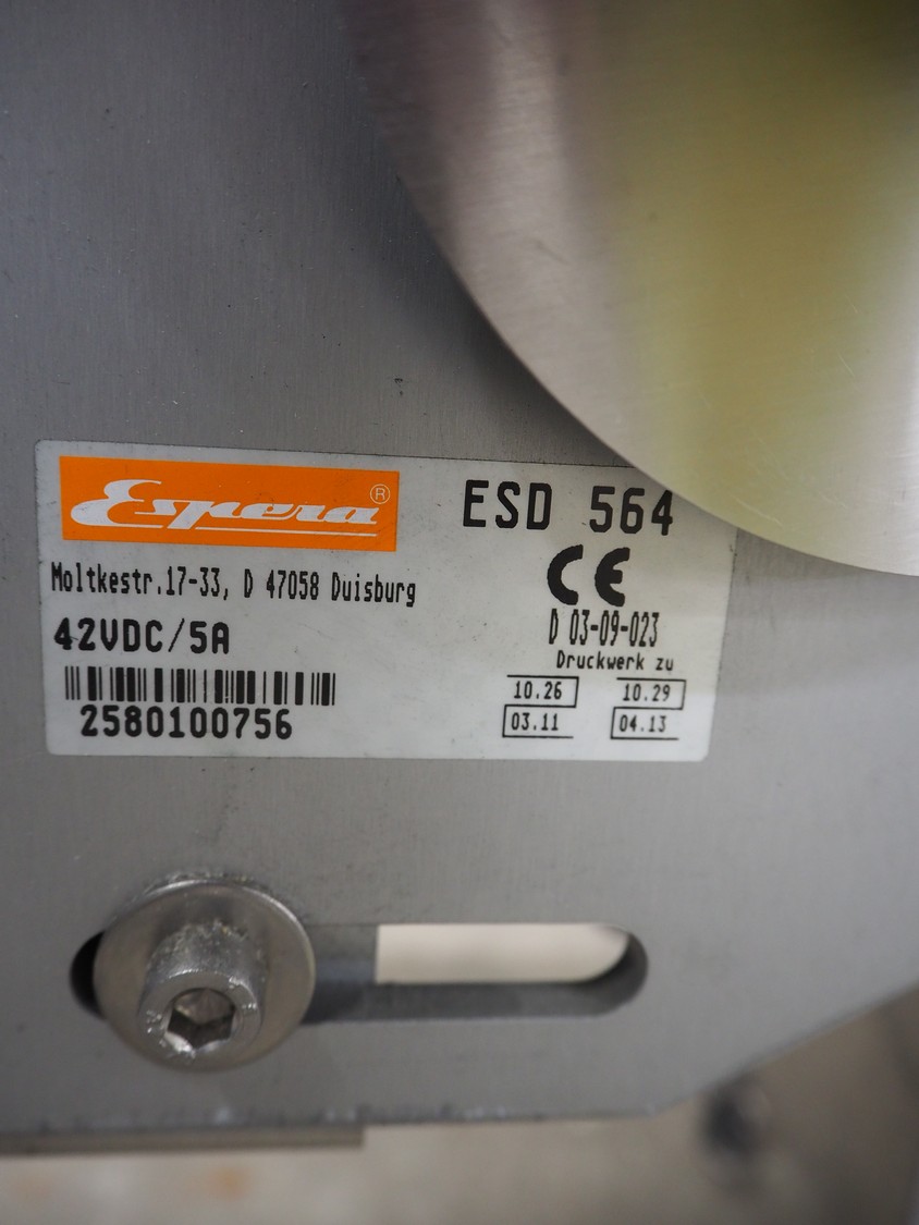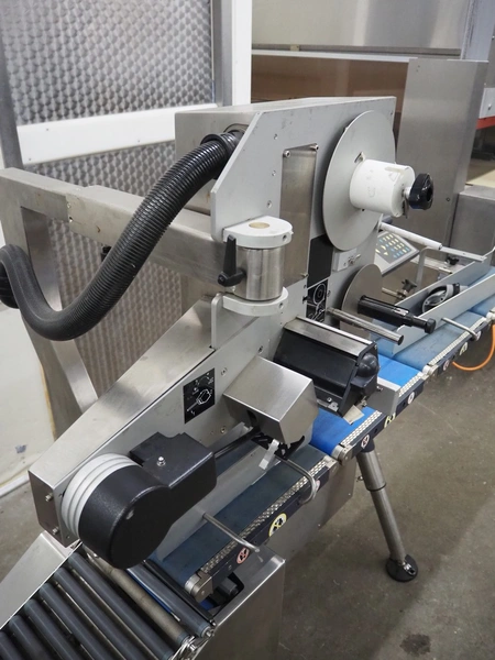Espera weighing and labelling machine with top and bottom labeller, type: ES 5000, year of construction: 2011, type weigher: ESW 2504, maximum weight: 6 kg, minimum weight: 40 gram, e= 2 gram, T= -6 kg, type labelling units: ESD 564, plastic belt, belt width: 140 mm, total dimensions: 1800 mm x 800 mm x 1500 mm.