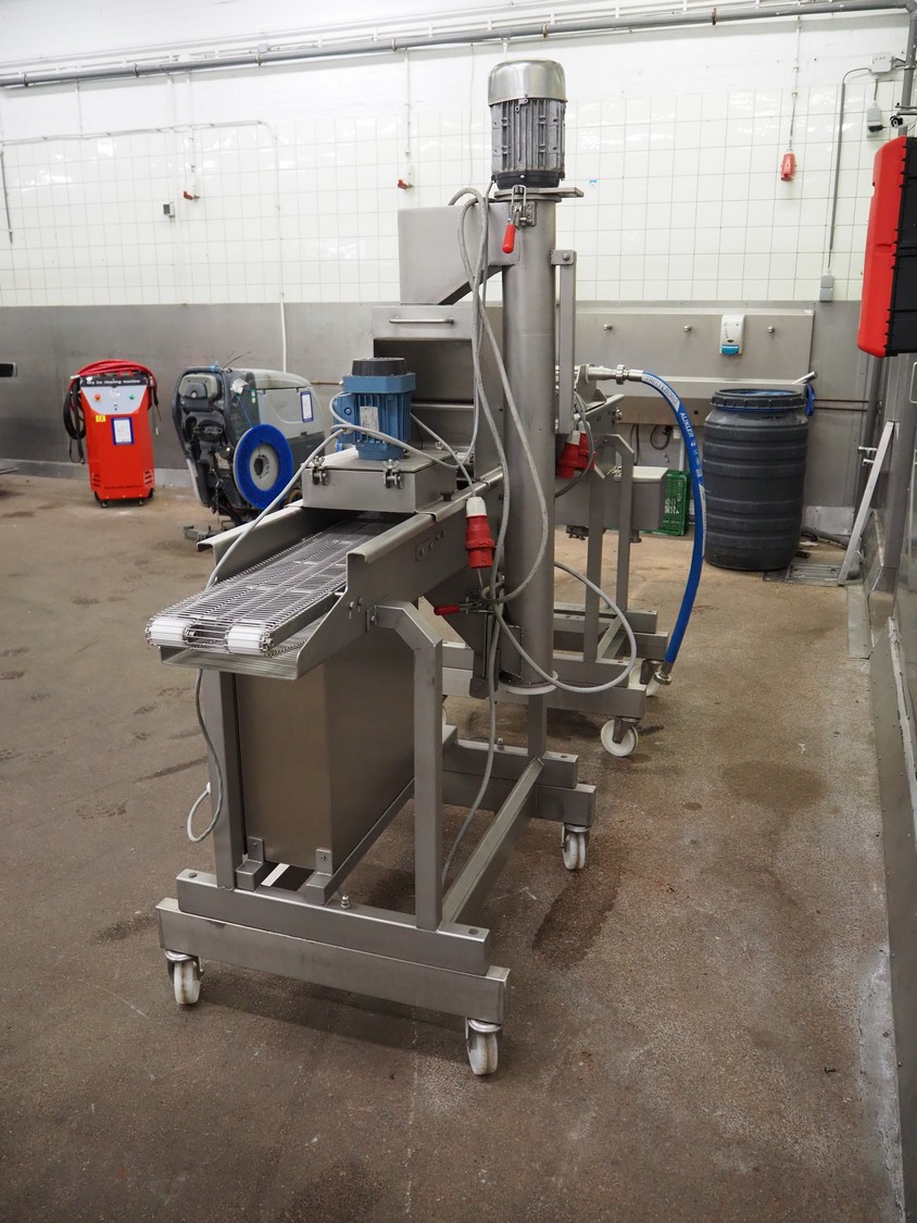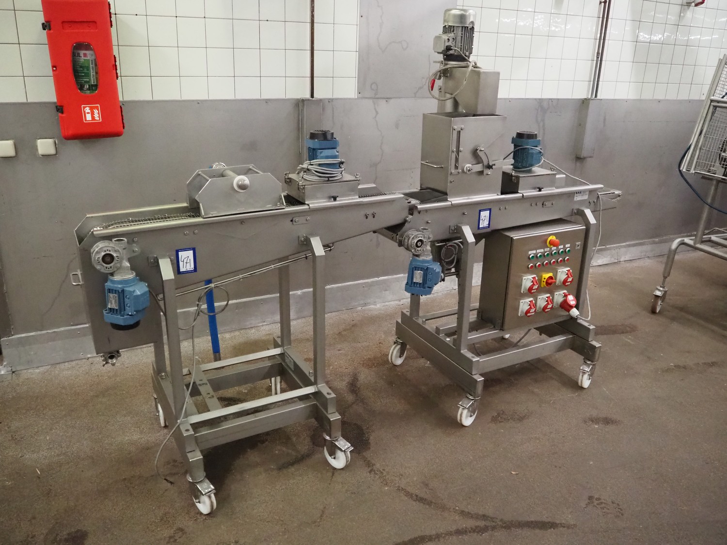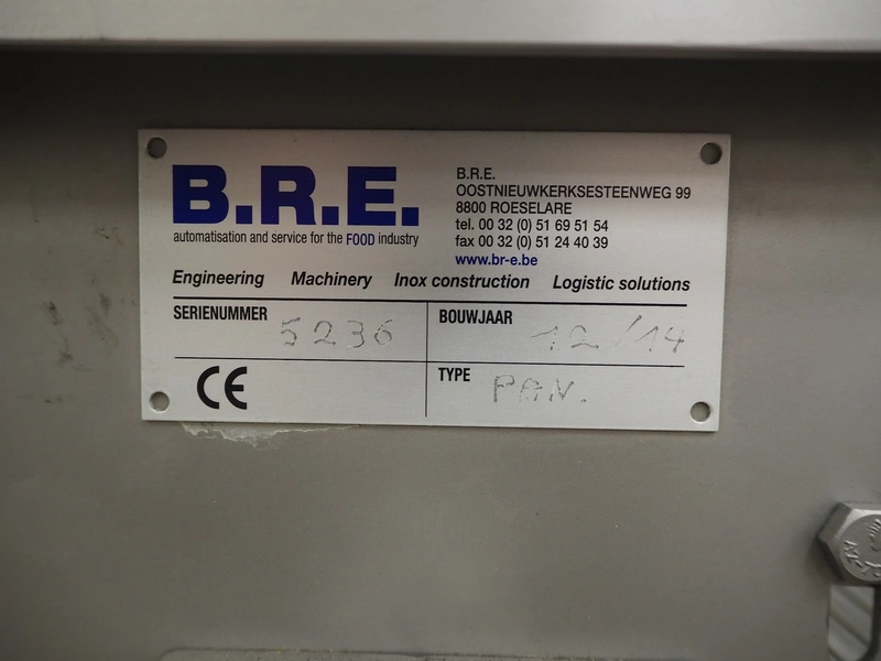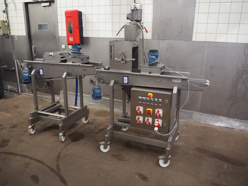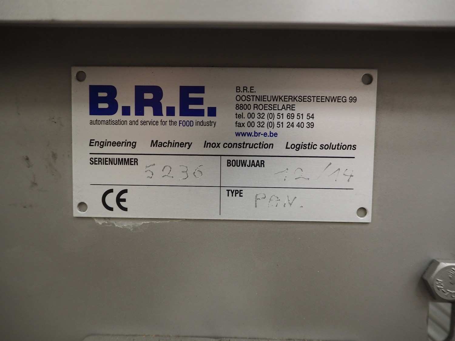 B.R.E. breading line consisting of mobile coating machine, type: E.W., serial number: 5235, year of construction: 2014, s/s mesh belt, belt width: 200 mm, dimensions coating machine: 1400 mm x 760 mm x 1400 mm and mobile breading machine, type: PAN, serial number: 5236, year of construction: 2014, s/s mesh belt, belt width: 200 mm, dimensions breading machine: 1500 mm x 760 mm x 1700 mm.
