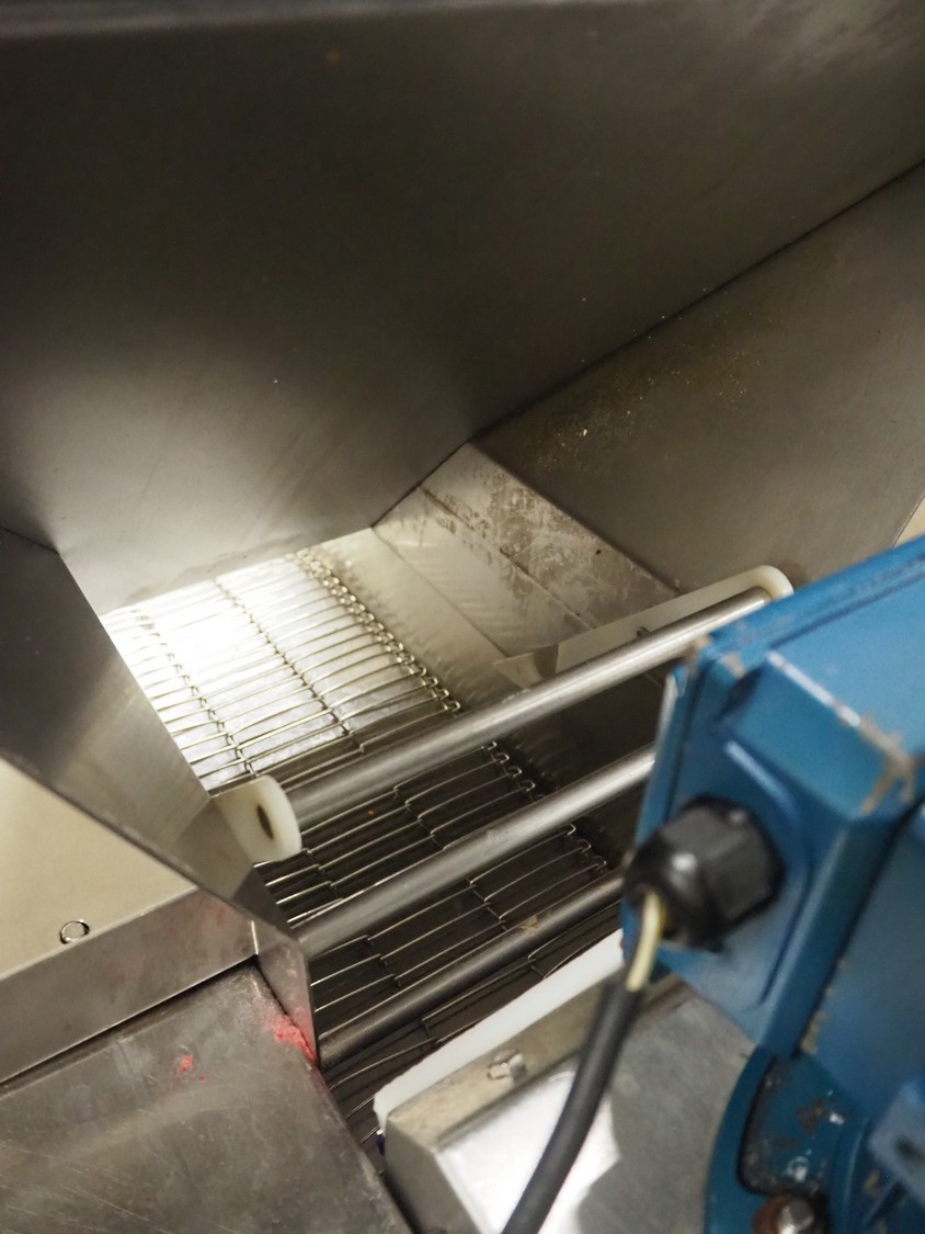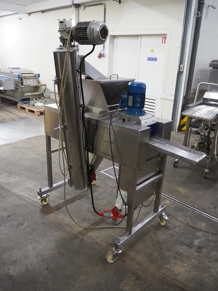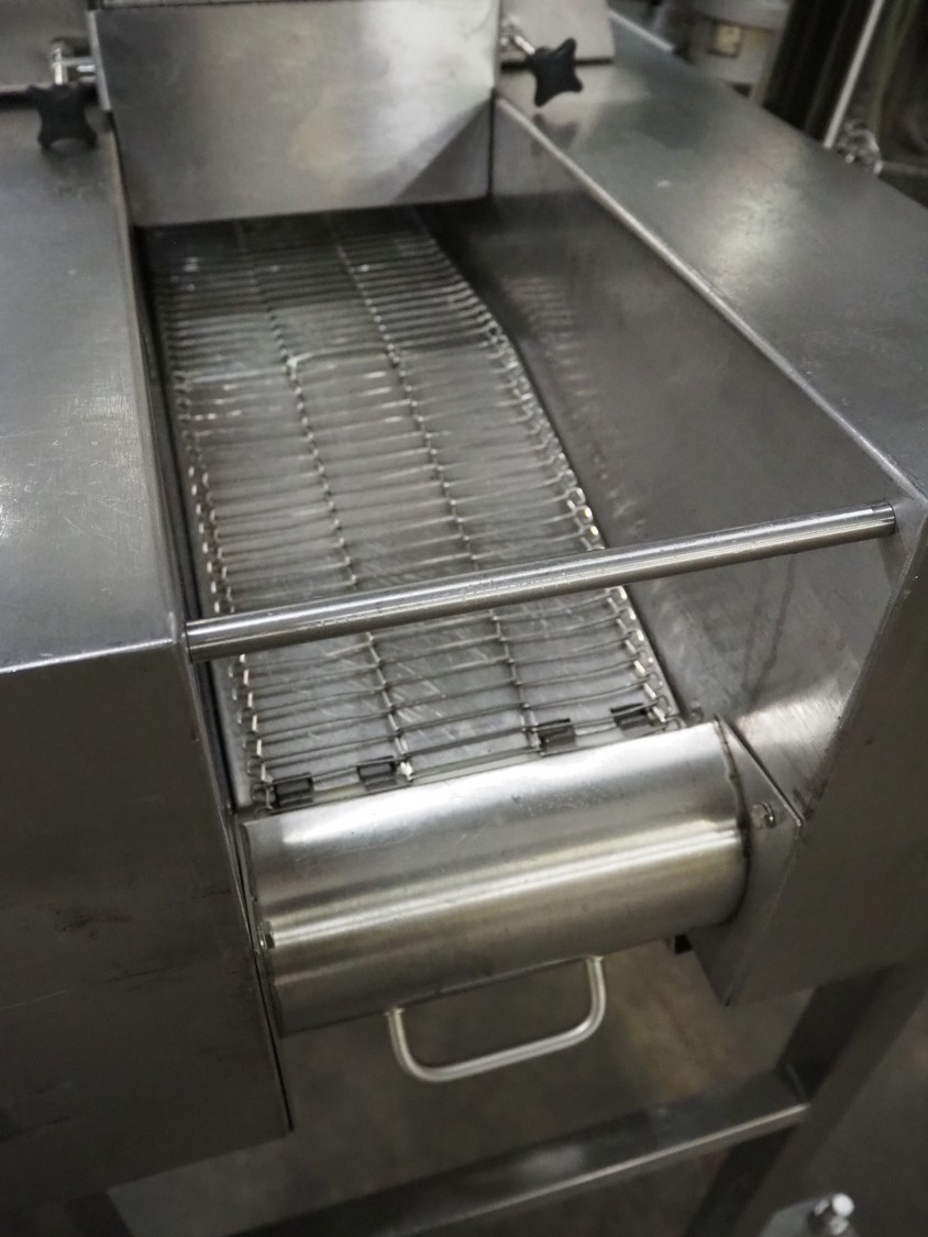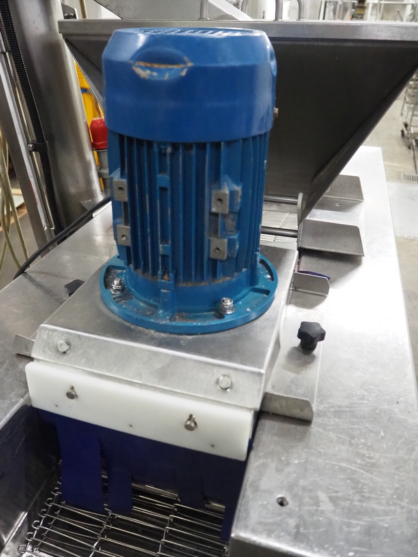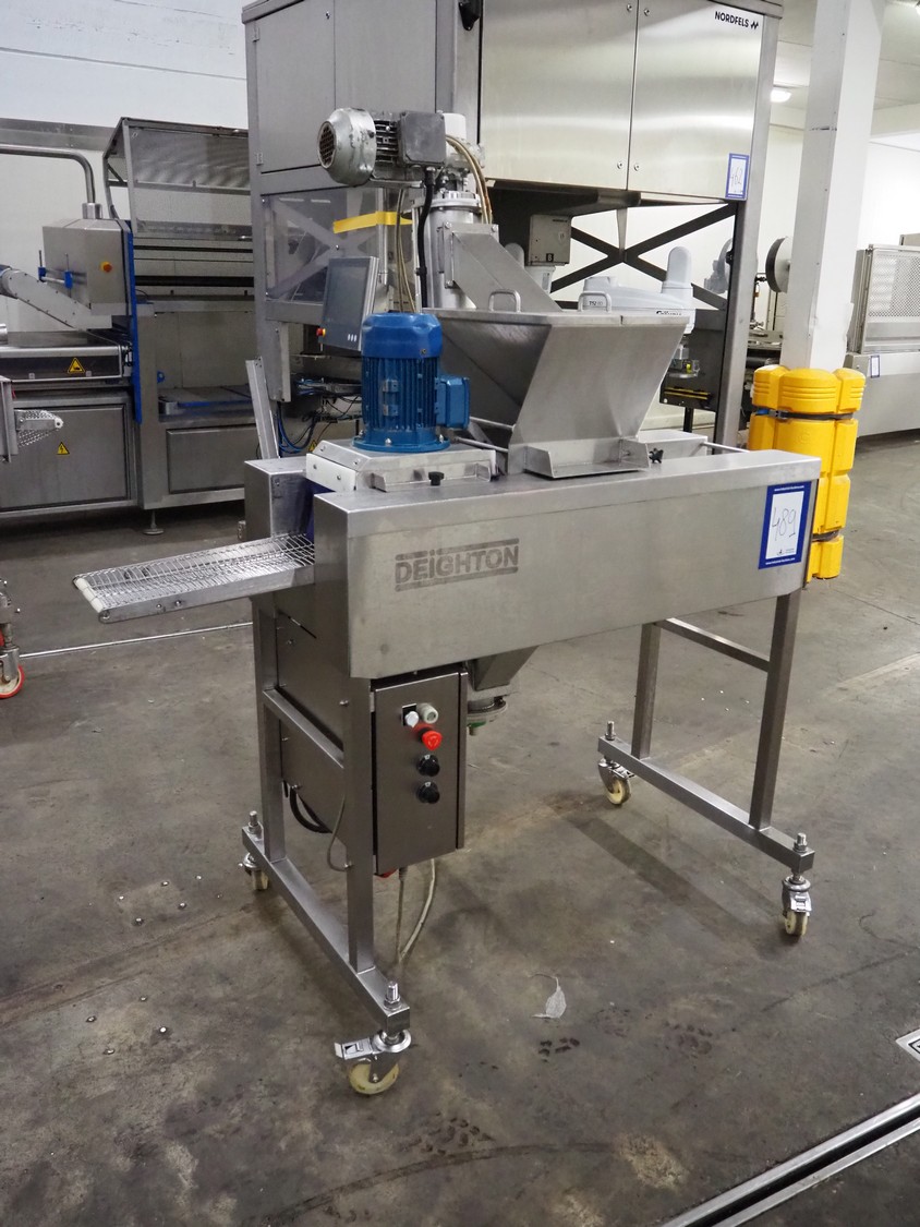 Deighton Manufacturing UK LTD mobile breading machine, s/s mesh belt, belt width: 200 mm, total dimensions: 1600 mm x 900 mm x 1900 mm.