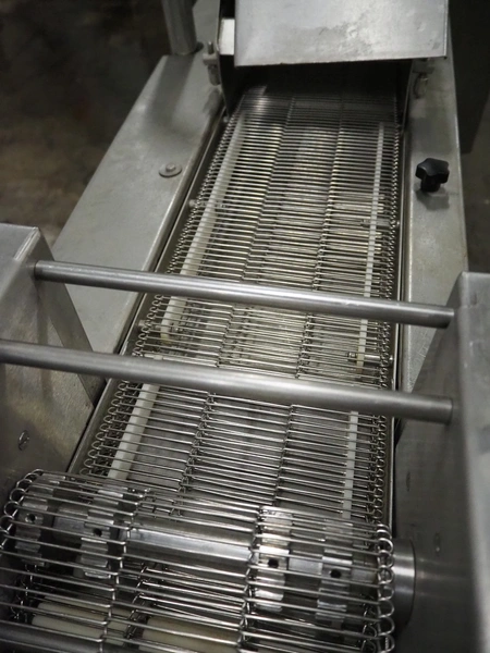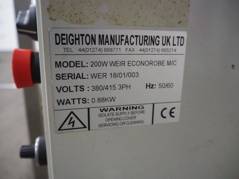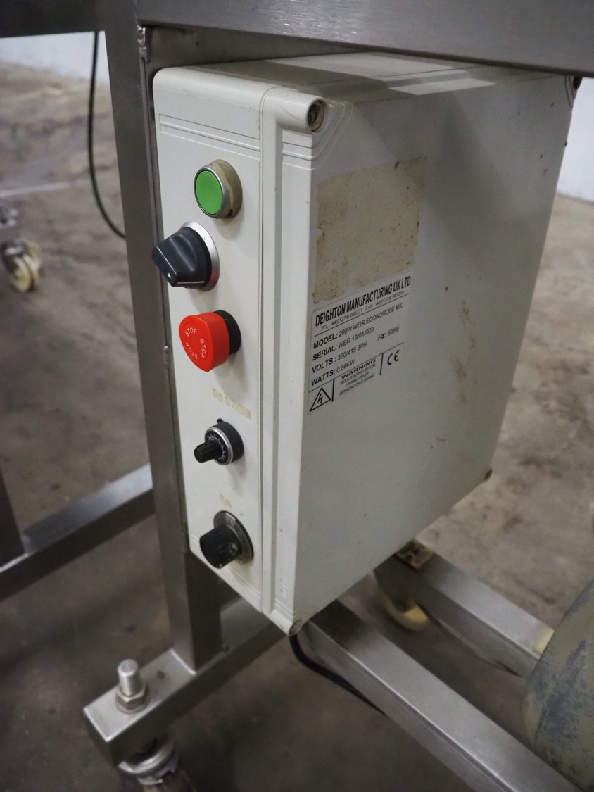 Deighton Manufacturing UK LTD mobile battering machine, model: 200W WEIR ECONOROBE M/C, serial number: WER 18/01/003, 380/415 V, 3 Ph, 50/60 Hz, 0.88 kW, s/s mesh belt, belt width: 220 mm, total dimensions: 1400 mm x 650 mm x 1300 mm.