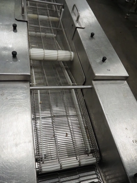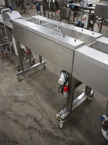 Deighton Manufacturing UK LTD mobile battering machine, model: 200W DIP-ECONOROBE M/C, serial number: ER 18/01/005, 380/415 V, 3 Ph, 50/60 Hz, 0.4 kW, s/s mesh belt, belt width: 220 mm, total dimensions: 1500 mm x 800 mm x 1200 mm.
