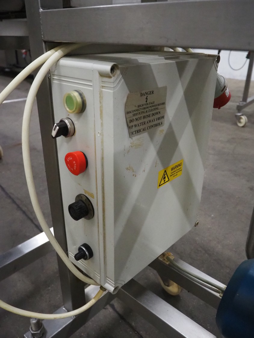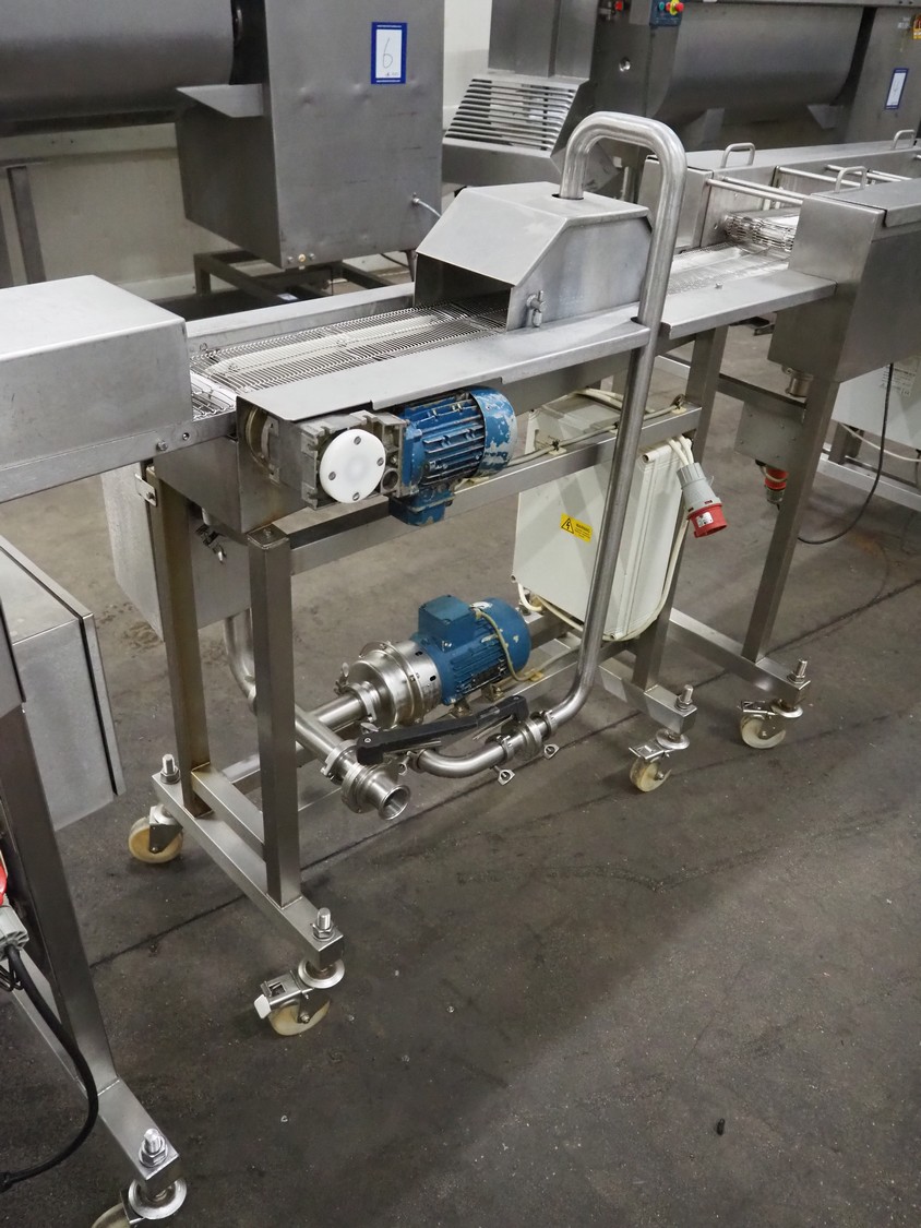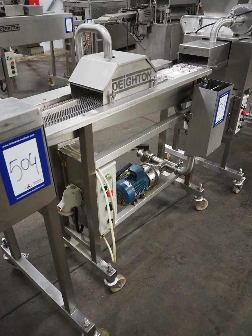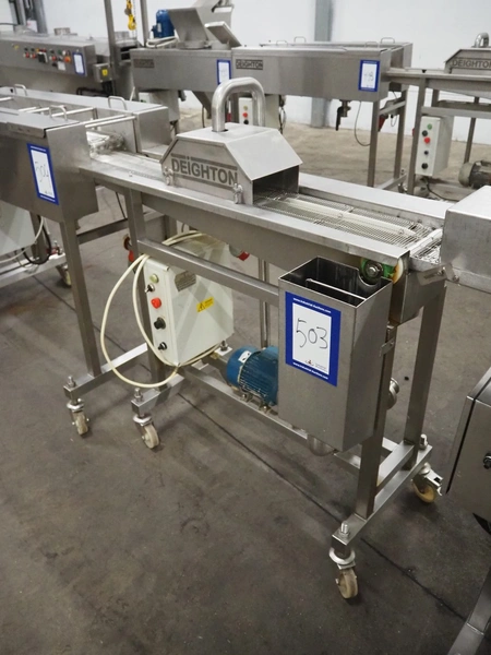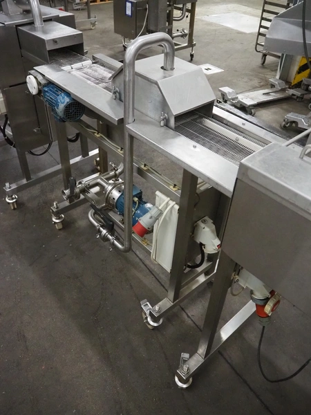 Deighton Manufacturing UK LTD mobile battering machine, s/s mesh belt, belt width: 220 mm, total dimensions: 1400 mm x 650 mm x 1300 mm.