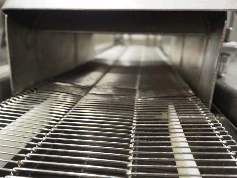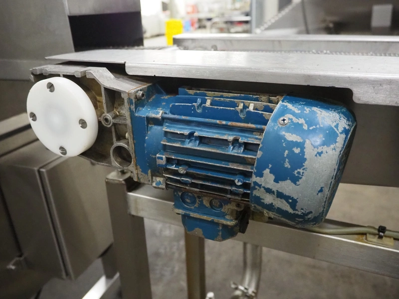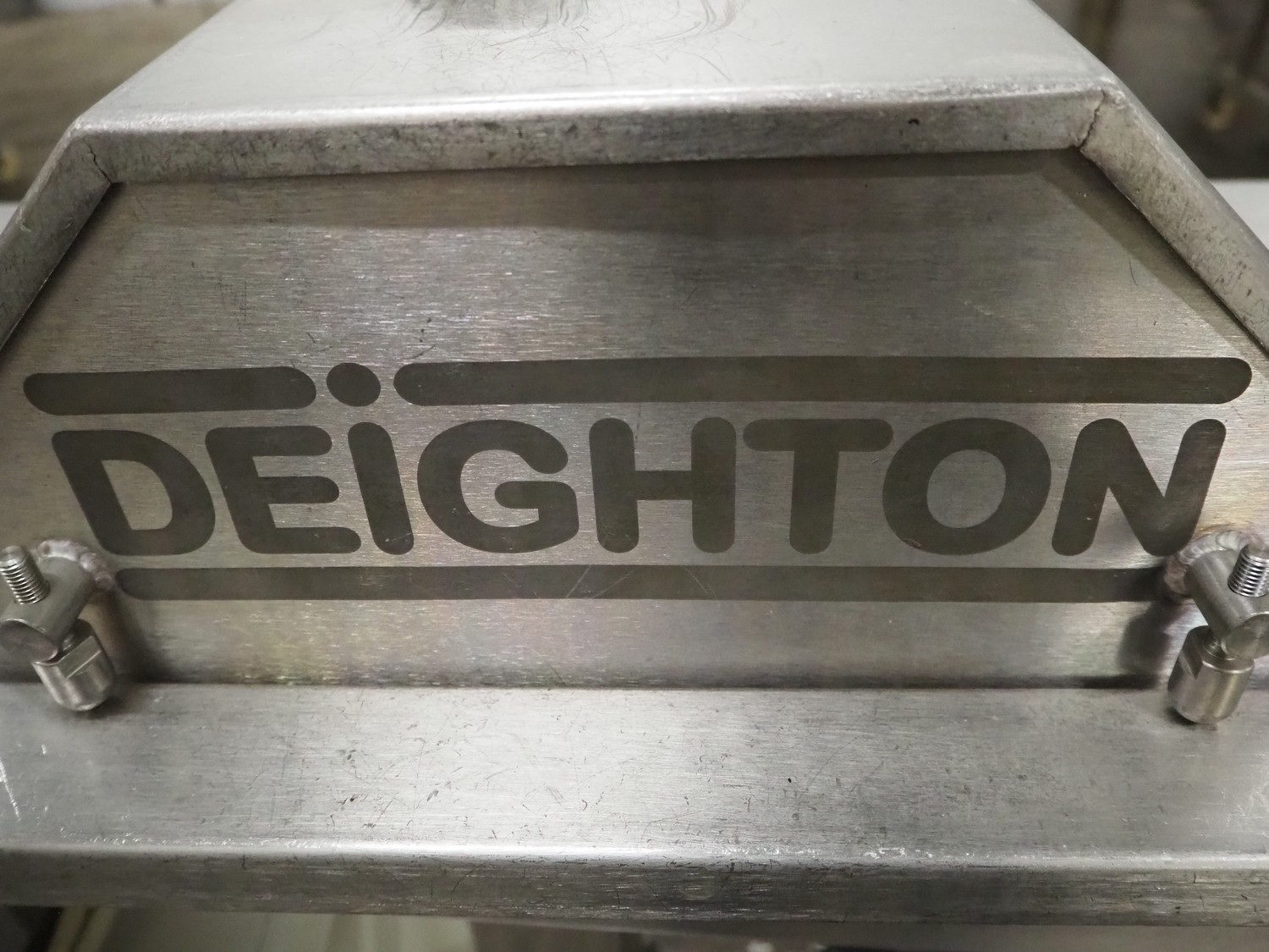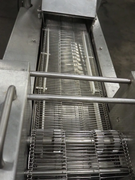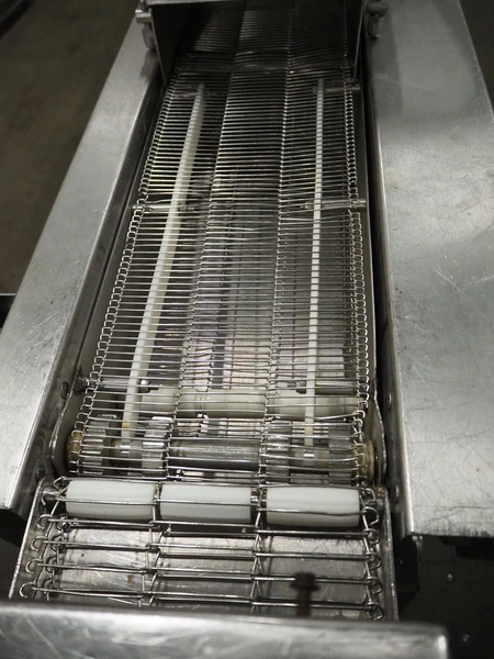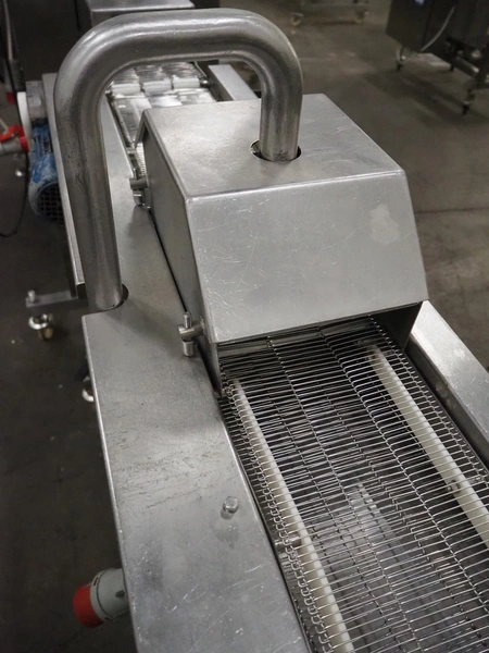Deighton Manufacturing UK LTD mobile battering machine, s/s mesh belt, belt width: 220 mm, total dimensions: 1400 mm x 650 mm x 1300 mm.