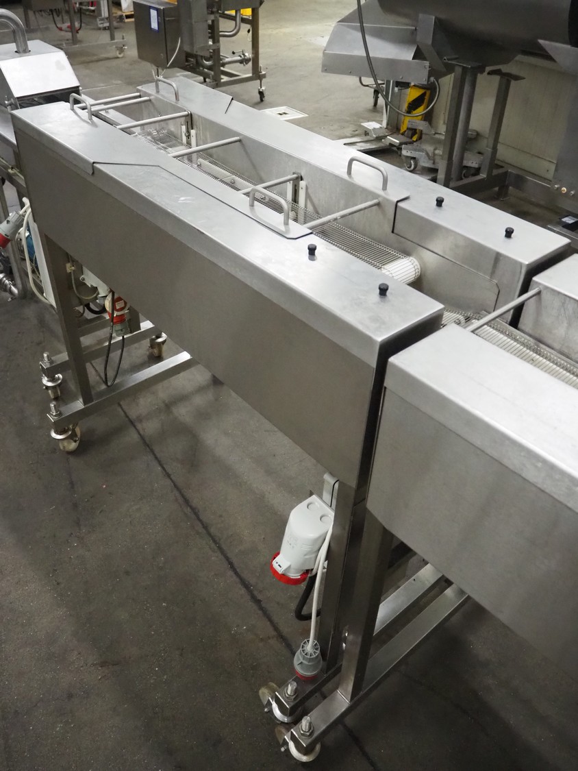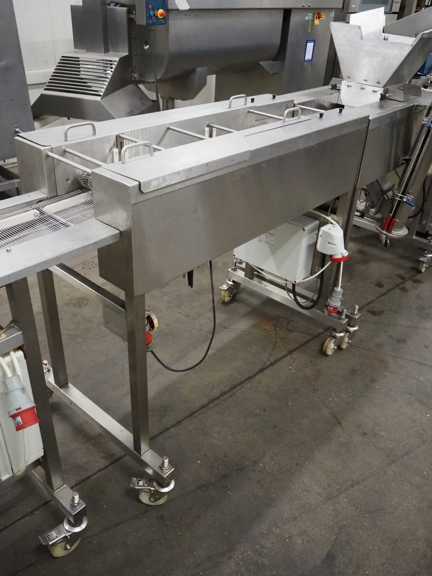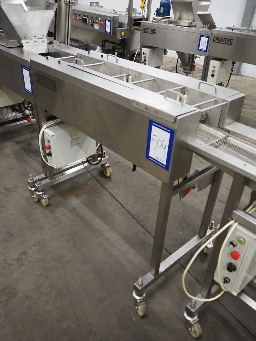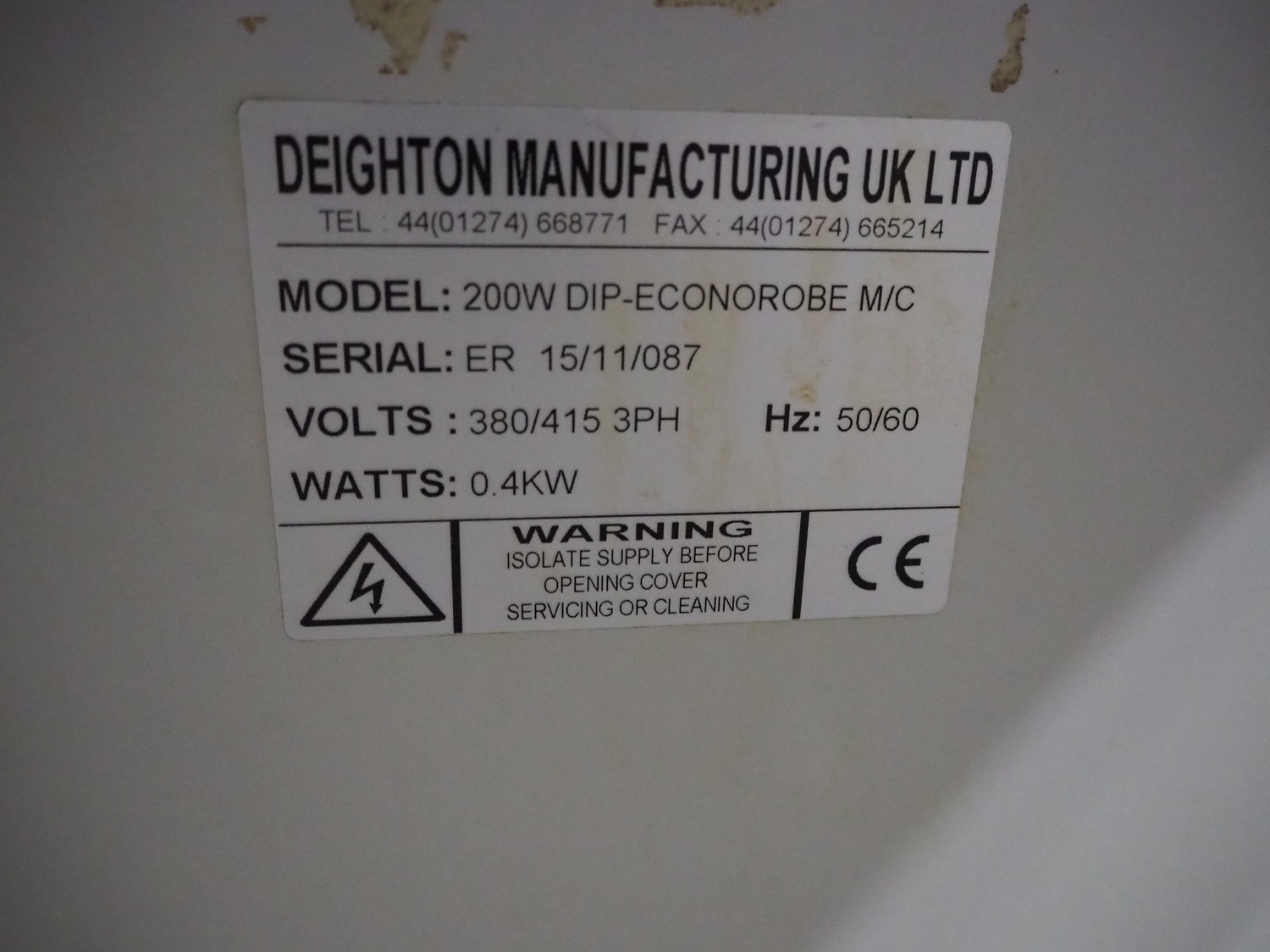 Deighton Manufacturing UK LTD mobile battering machine, model: 200W DIP-ECONOROBE M/C, serial number: ER 15/11/087, 380/415 V, 3 Ph, 50/60 Hz, 0.4 kW, s/s mesh belt, belt width: 220 mm, total dimensions: 1500 mm x 800 mm x 1200 mm.