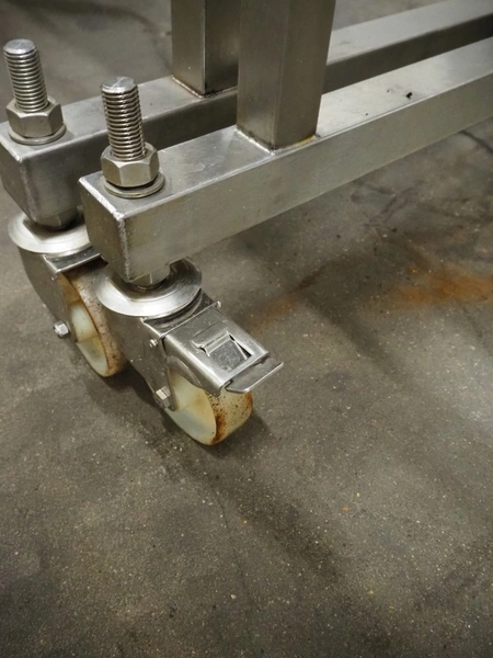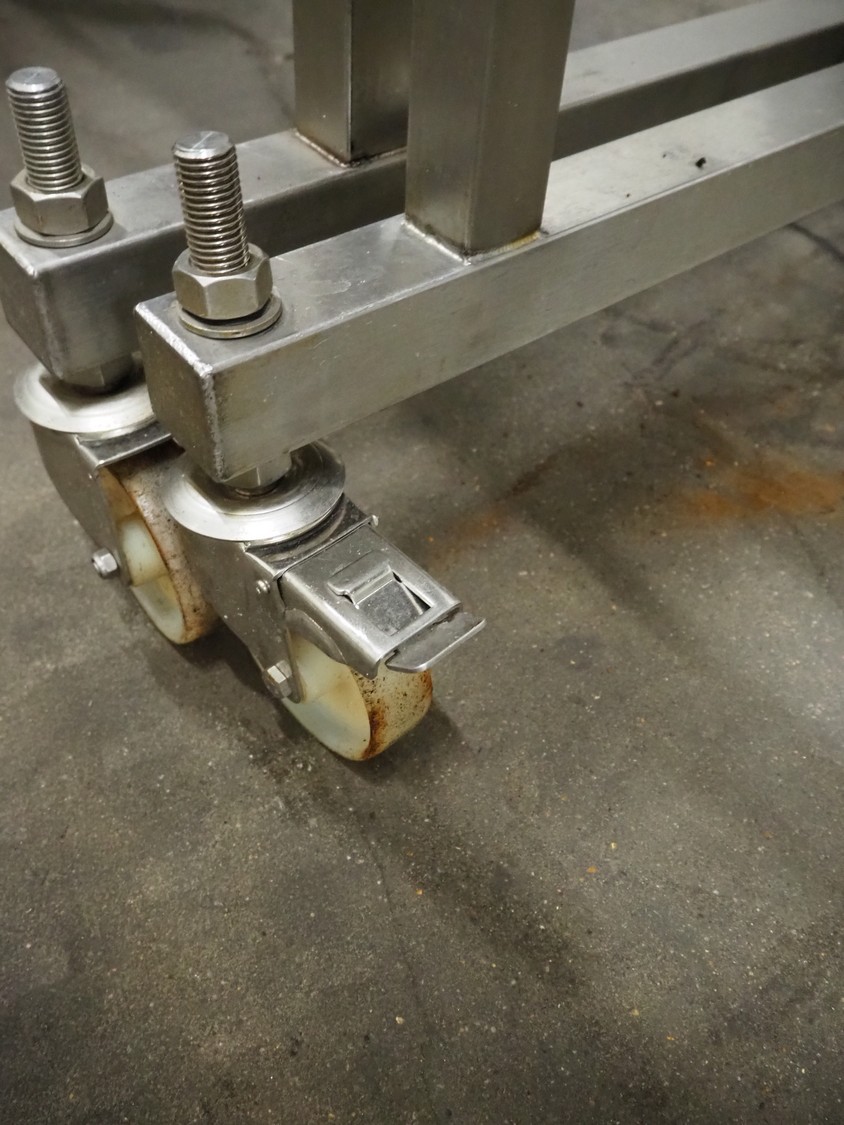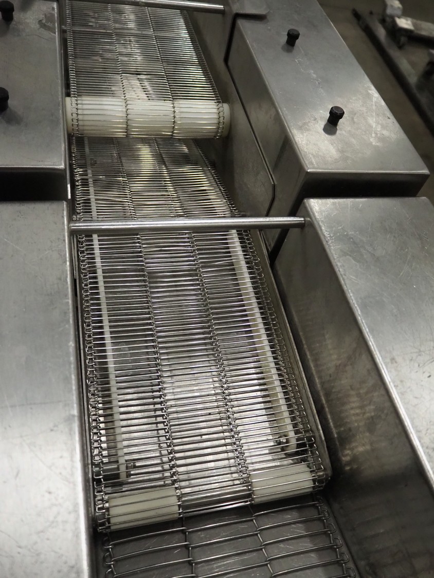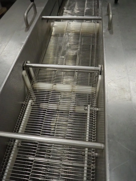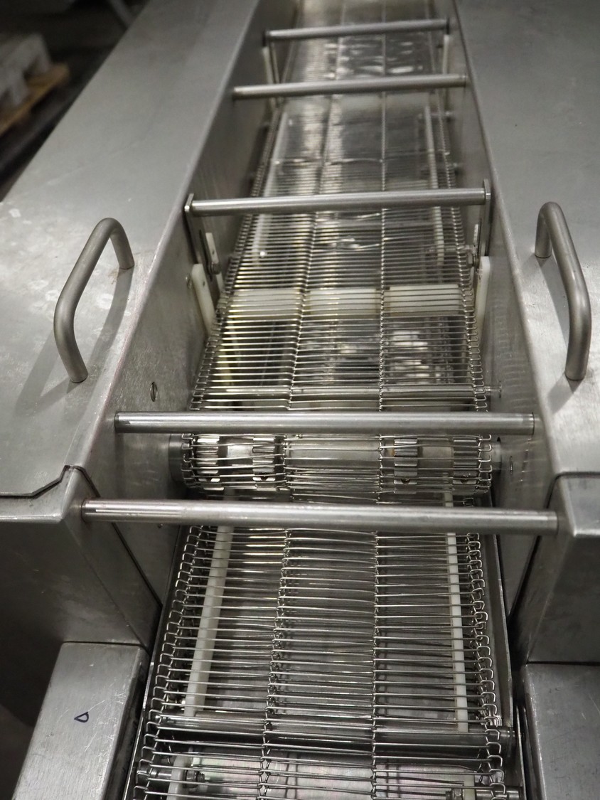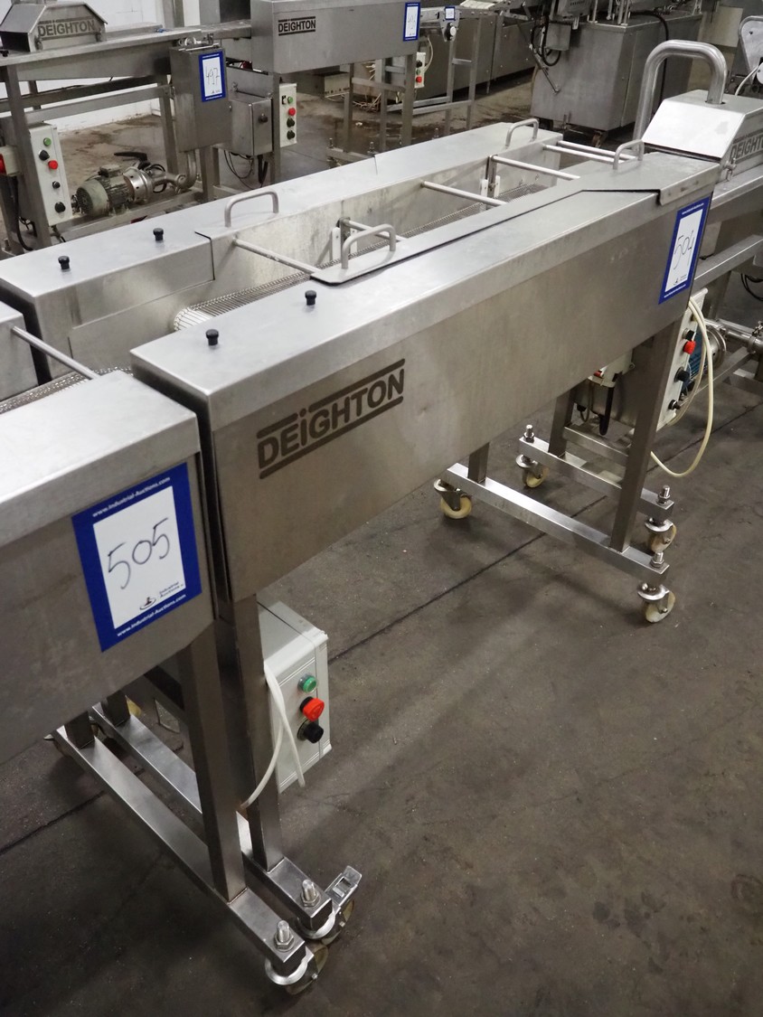 Deighton Manufacturing UK LTD mobile battering machine, model: 200W DIP-ECONOROBE M/C, serial number: ER 15/11/087, 380/415 V, 3 Ph, 50/60 Hz, 0.4 kW, s/s mesh belt, belt width: 220 mm, total dimensions: 1500 mm x 800 mm x 1200 mm.