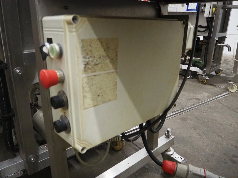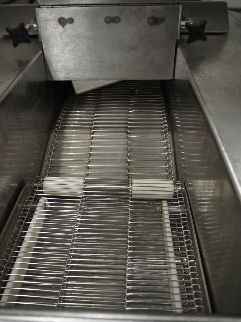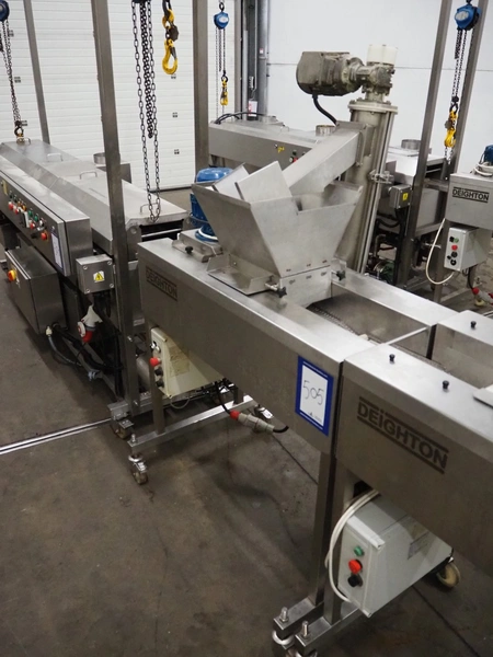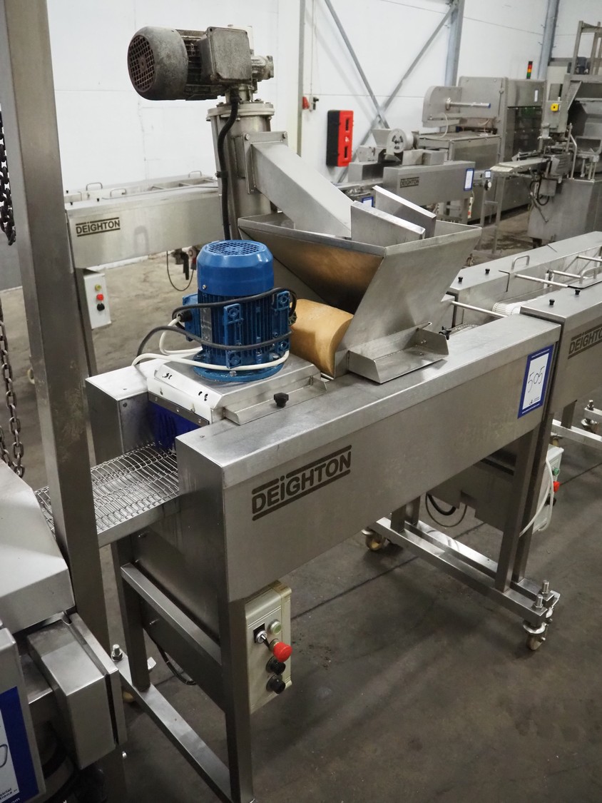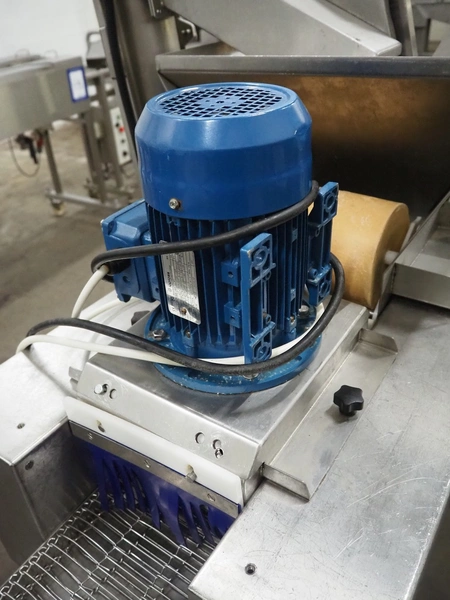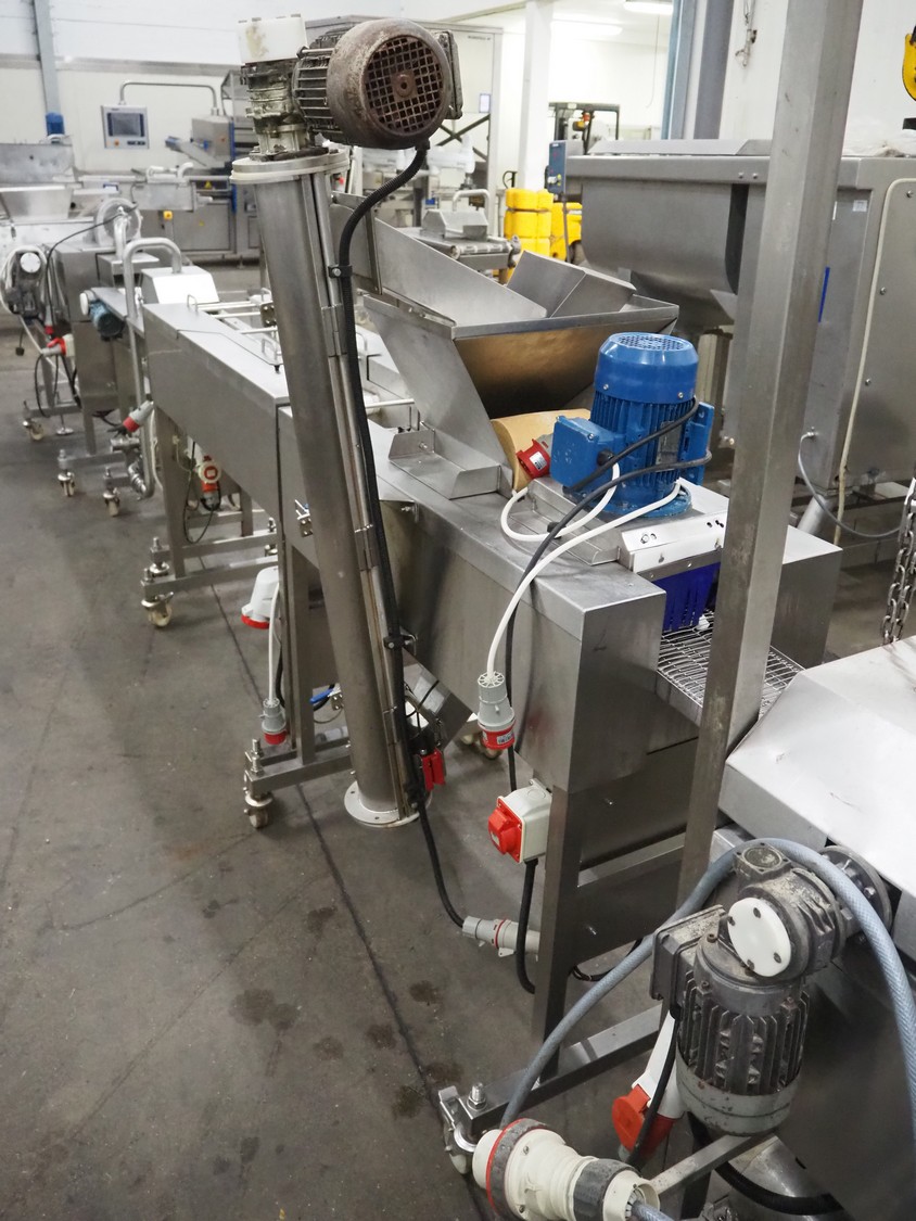 Deighton Manufacturing UK LTD mobile breading machine, s/s mesh belt, belt width: 220 mm, total dimensions: 1500 mm x 800 mm x 1200 mm.