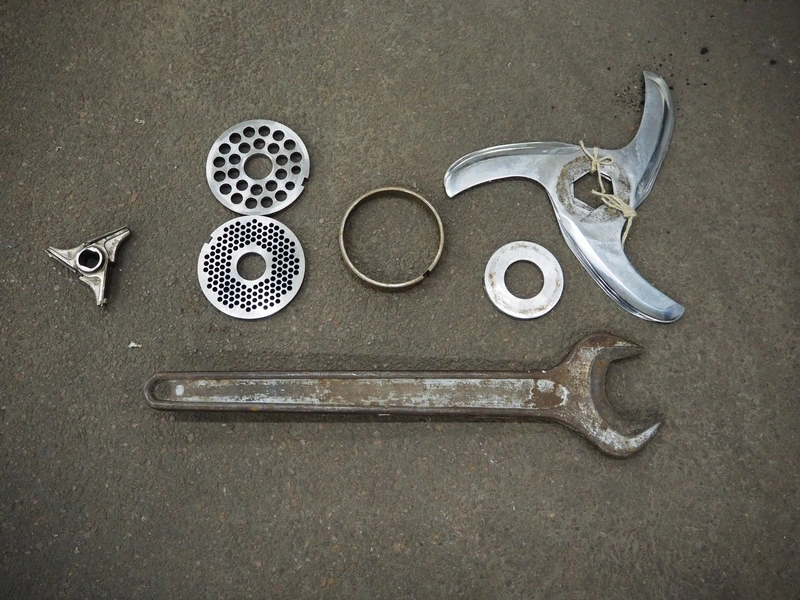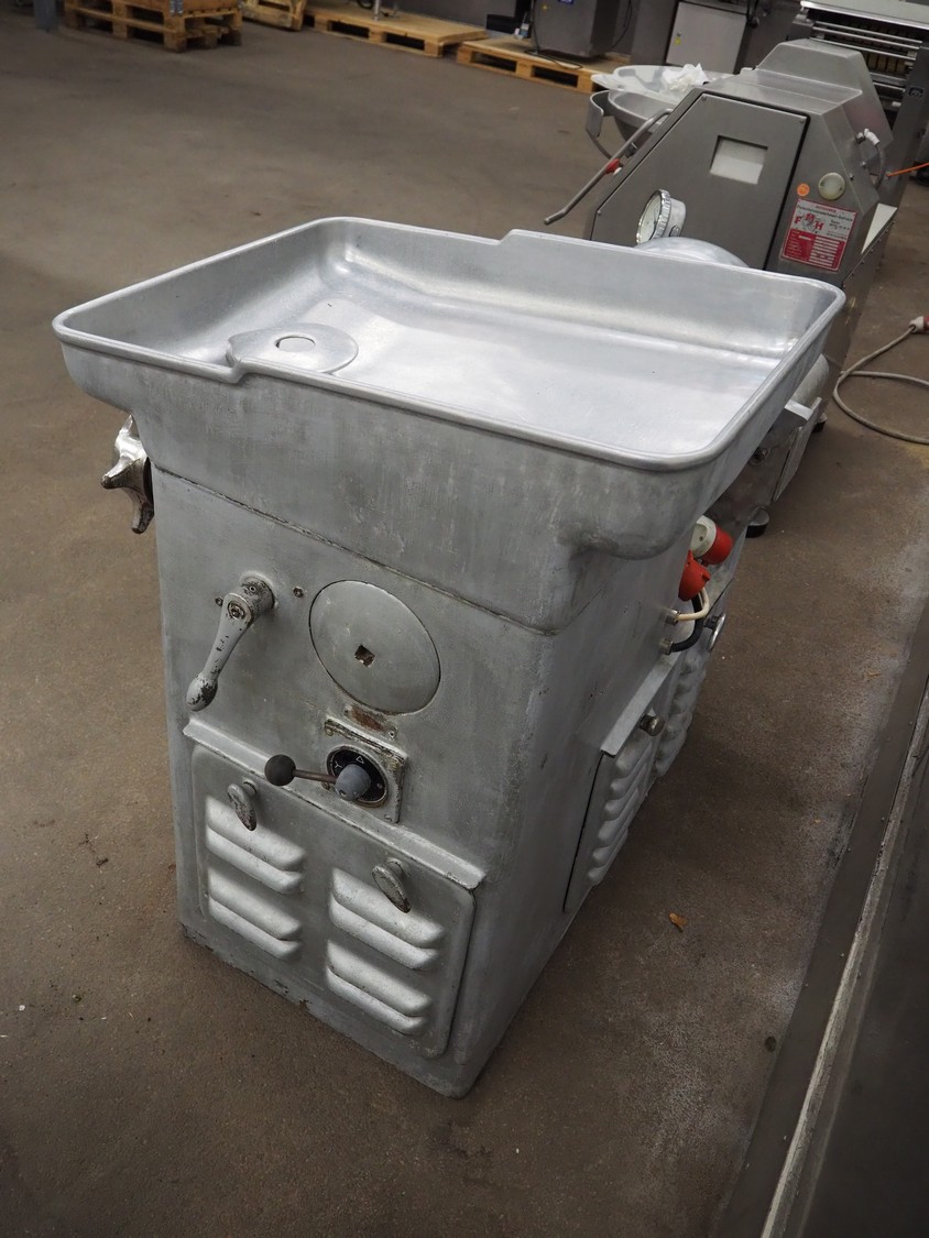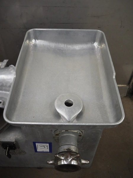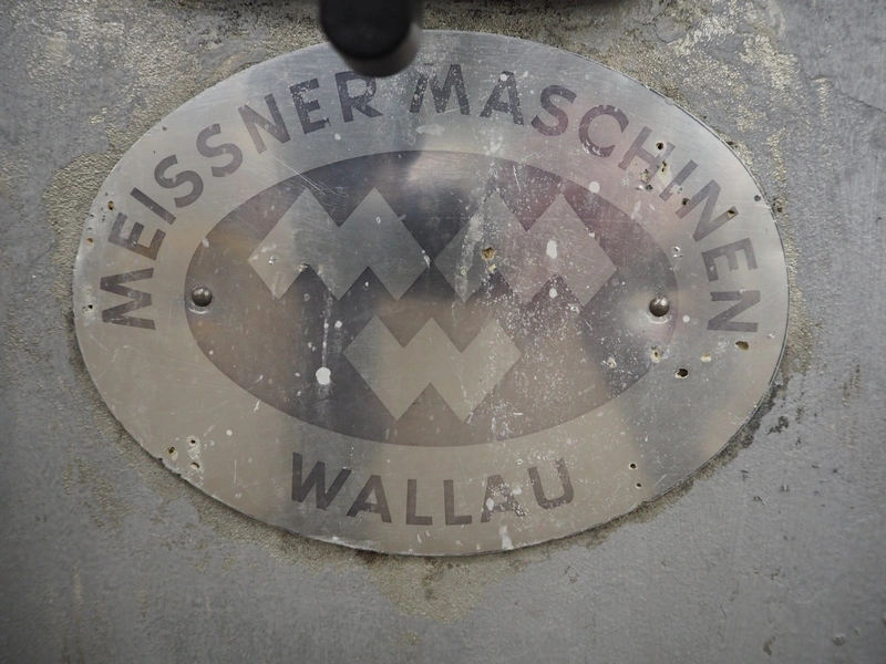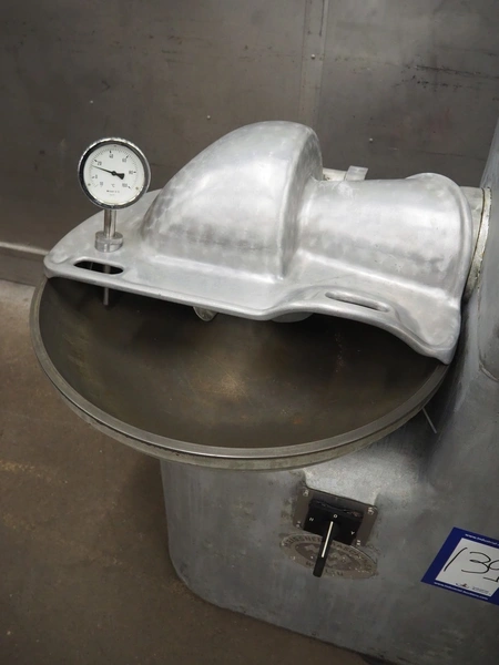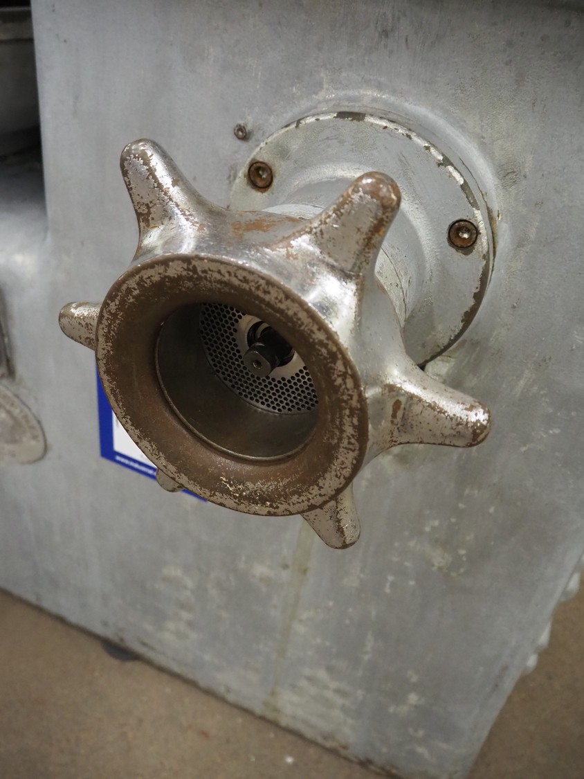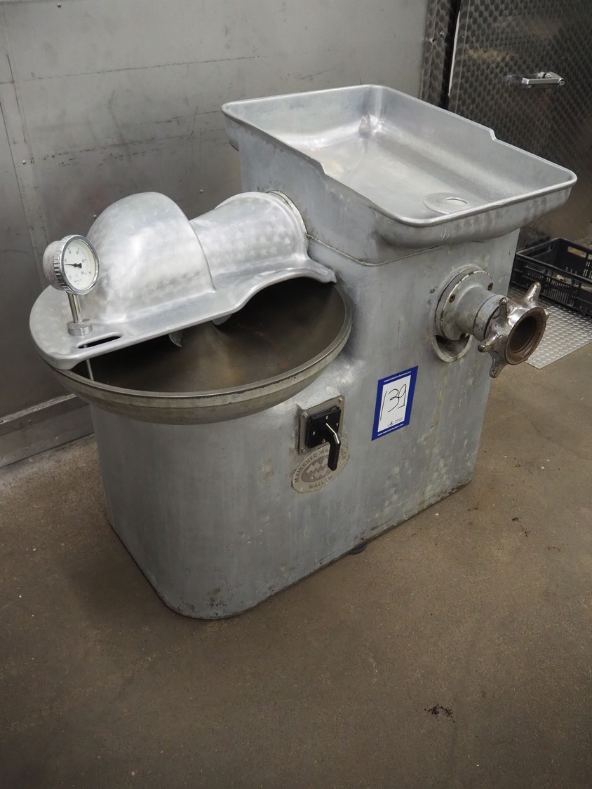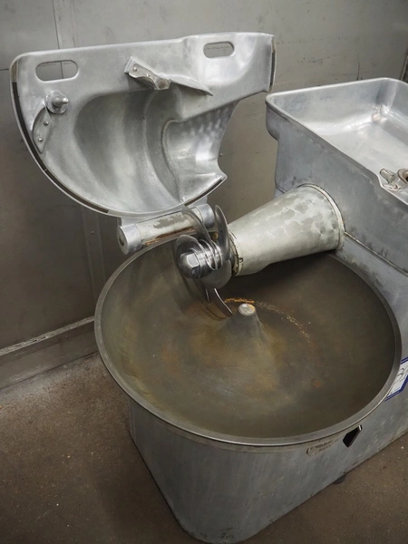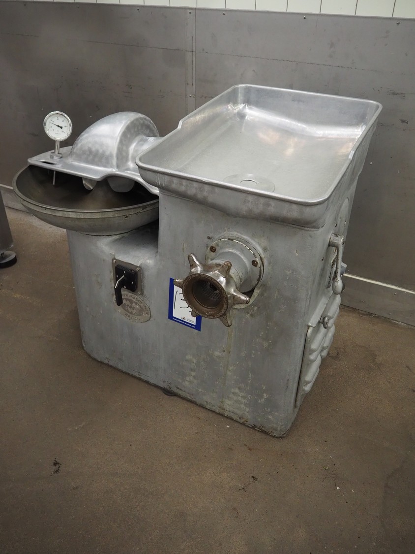 Meissner cutter with grinder, steel bowl, s/s knives, plate diameter: 98 mm, total dimensions: 1300 mm x 900 mm x 1200 mm. Including extra plates and knives.