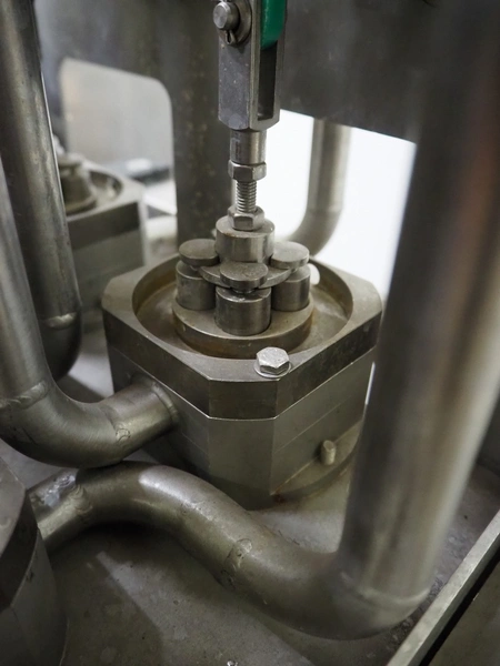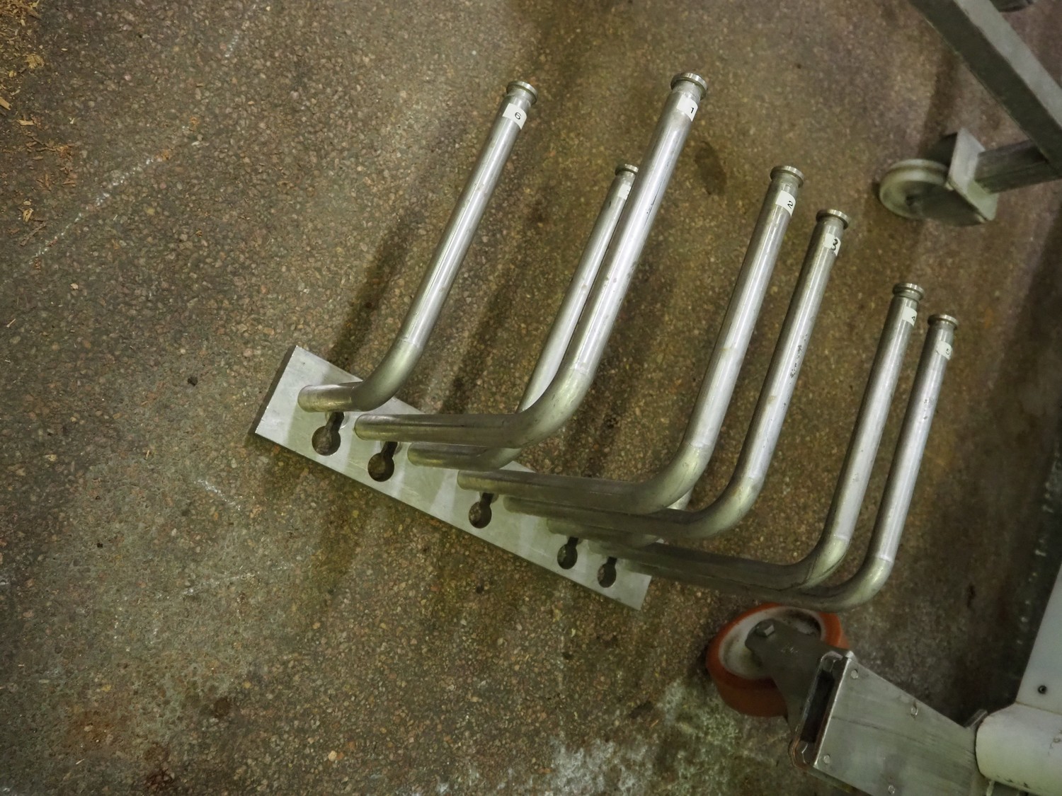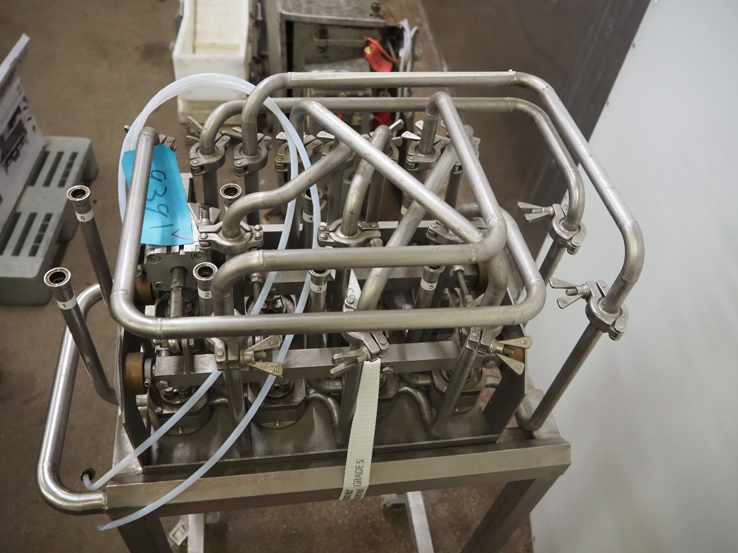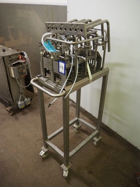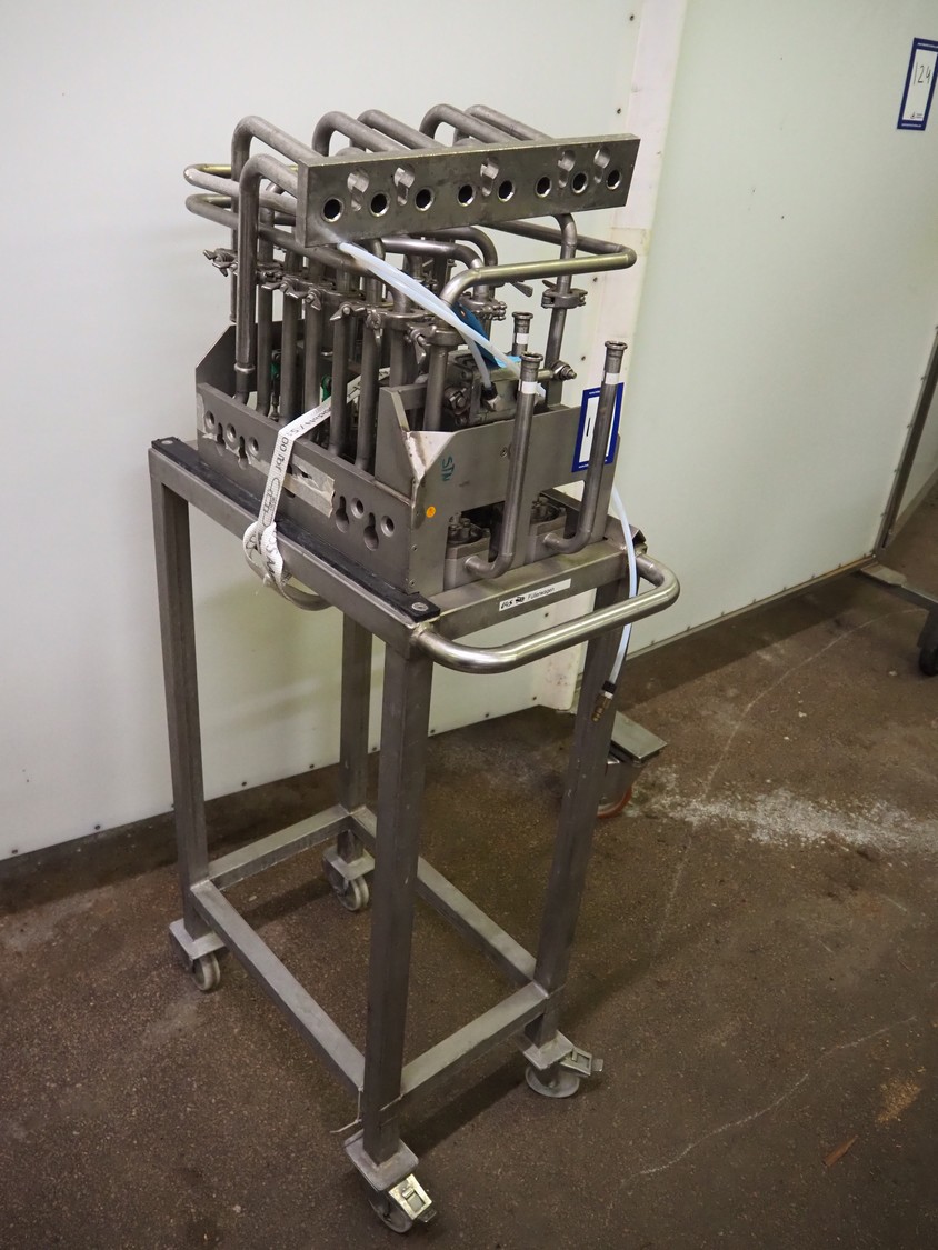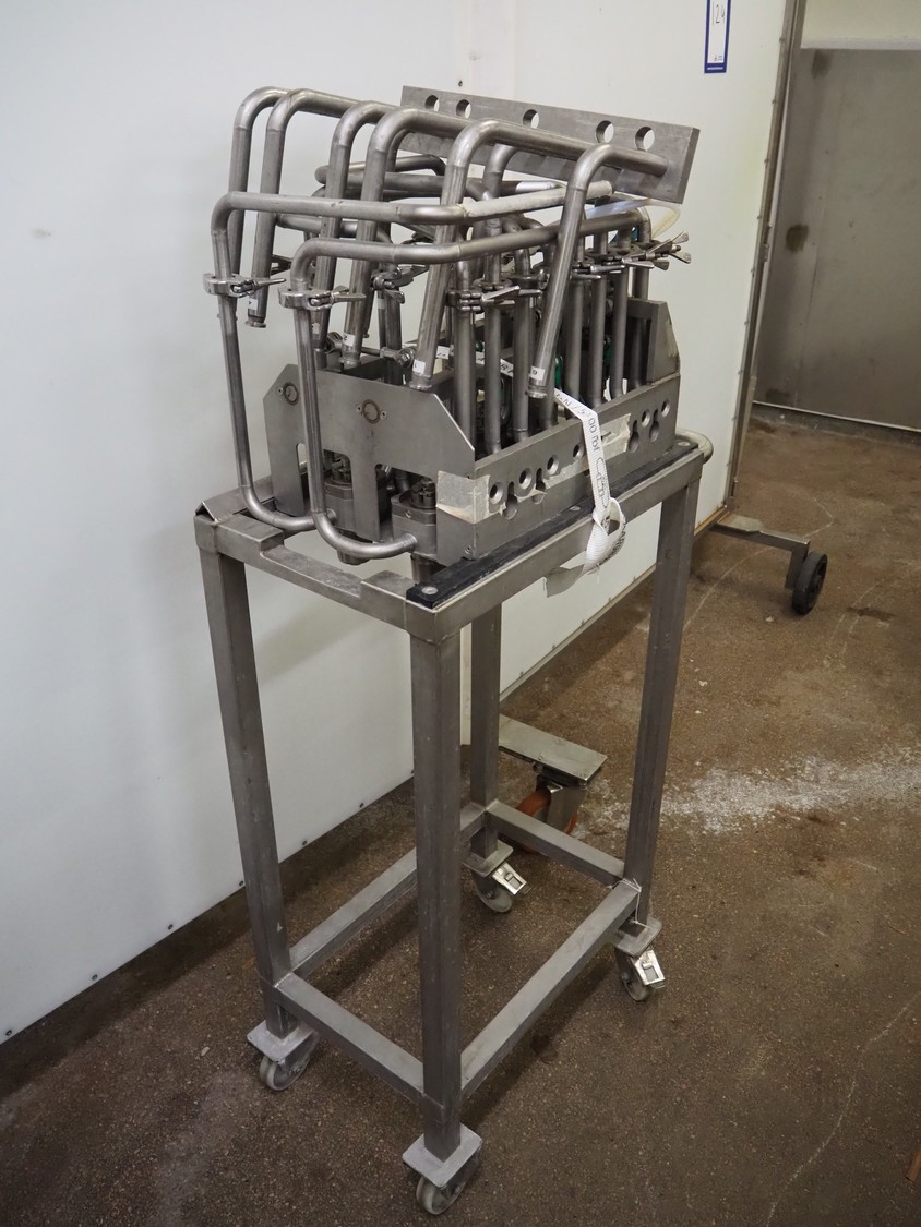 Mobile frame with filling head, 8x4 filling heads, dimensions: 740 mm x 400 mm x 1500 mm.