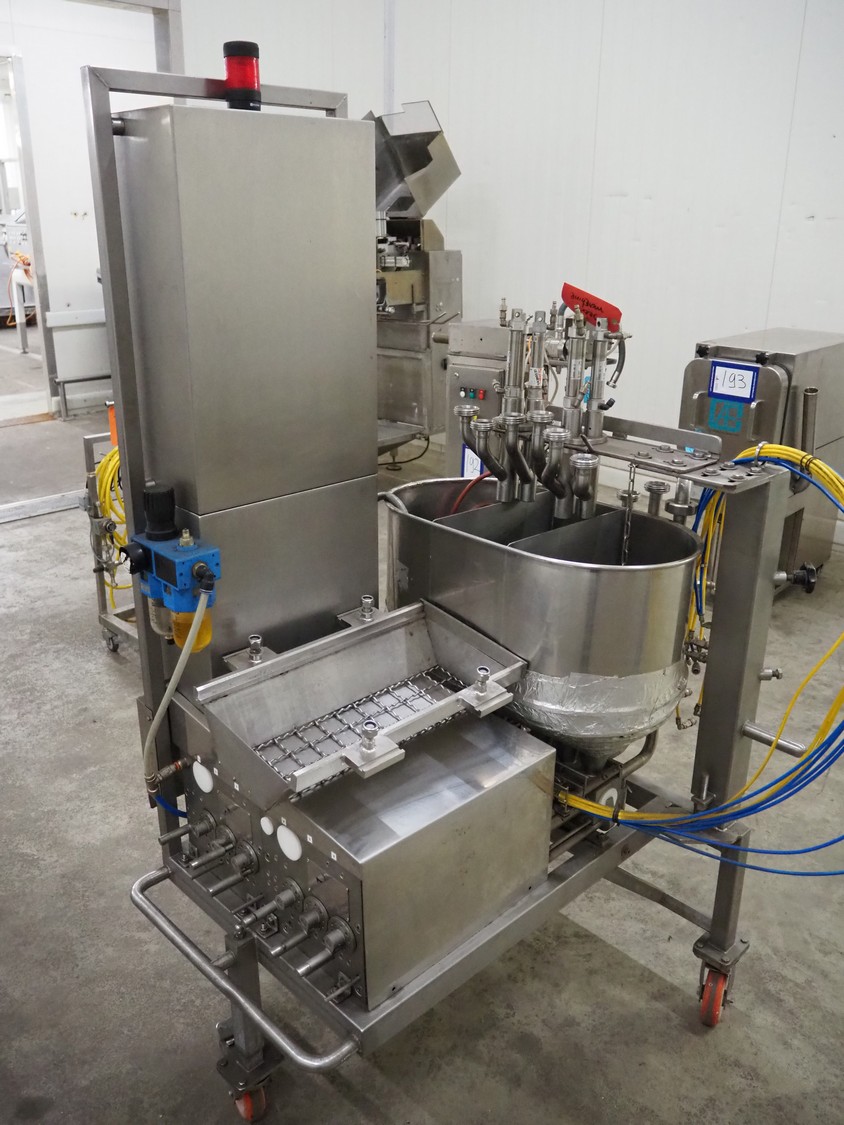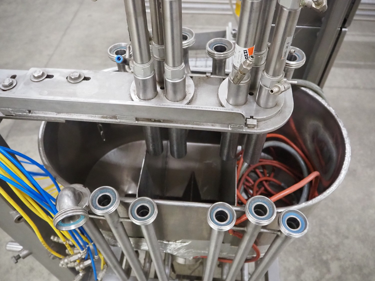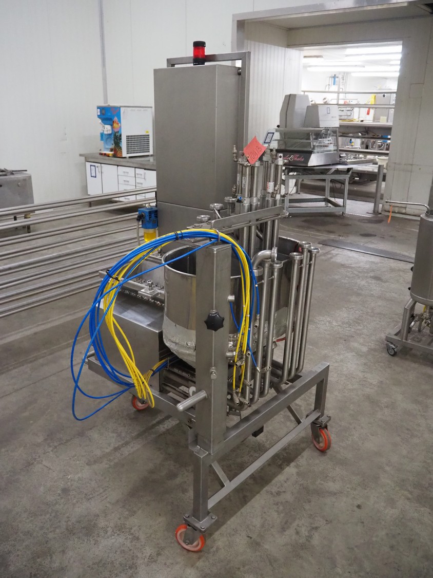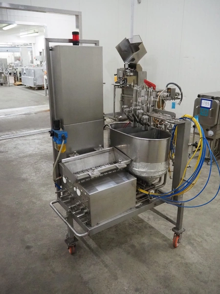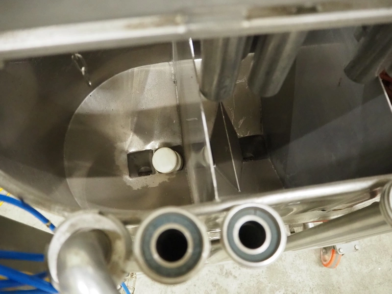 Turbo Systems mobile dosing and filling machine, number: M93014203008, dimensions funnel: 700 mm x 400 mm x 500 mm, diameter output pipe: (6x) 20 mm, total dimensions: 1000 mm x 950 mm x 1900 mm.