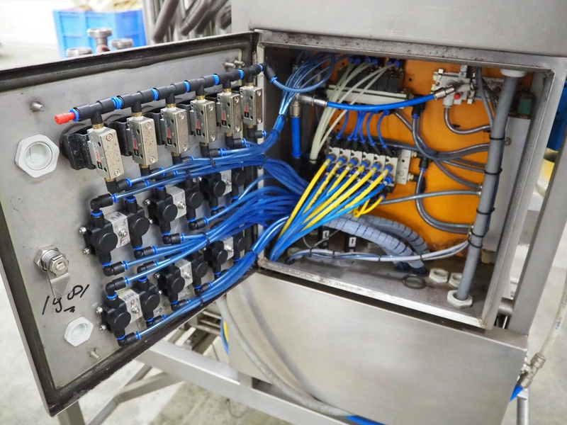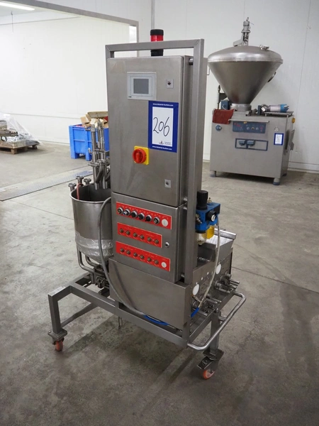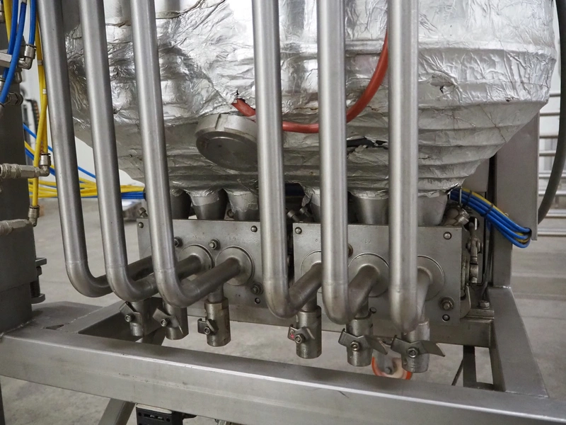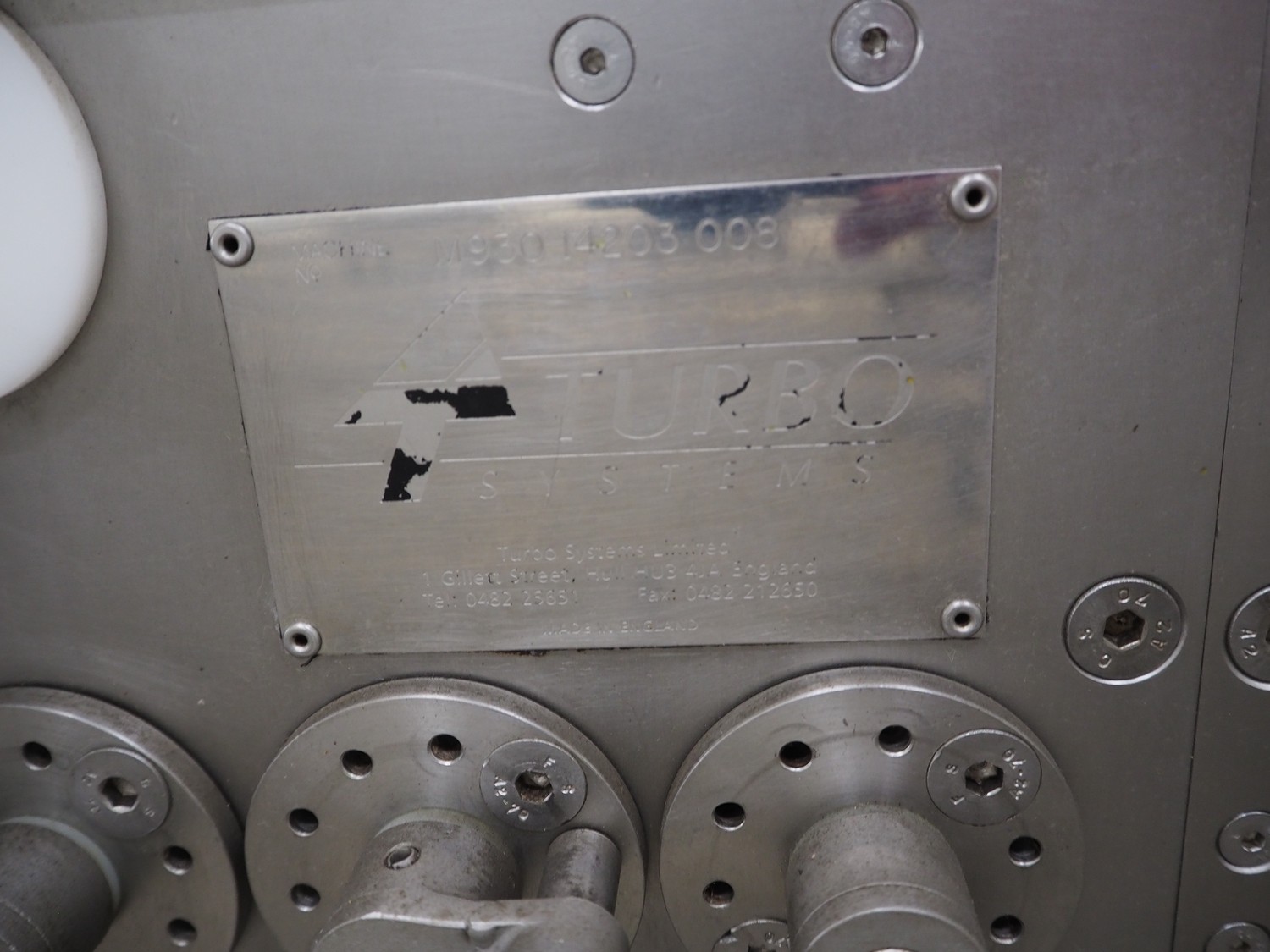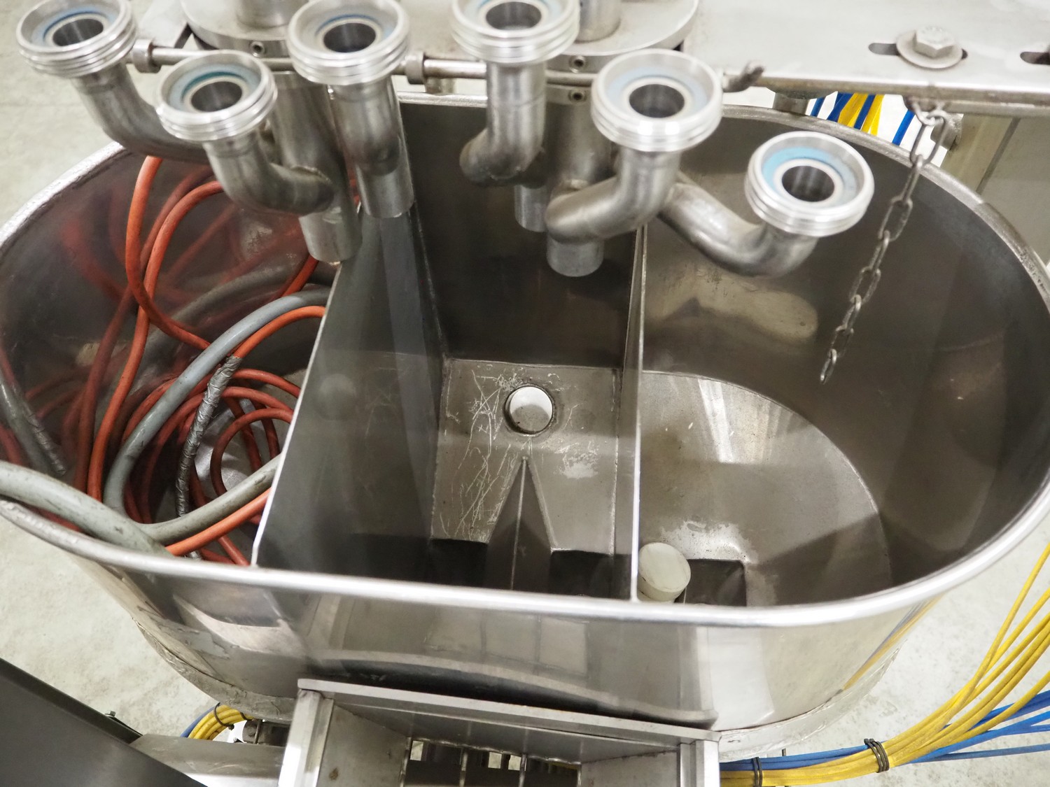 Turbo Systems mobile dosing and filling machine, number: M93014203008, dimensions funnel: 700 mm x 400 mm x 500 mm, diameter output pipe: (6x) 20 mm, total dimensions: 1000 mm x 950 mm x 1900 mm.