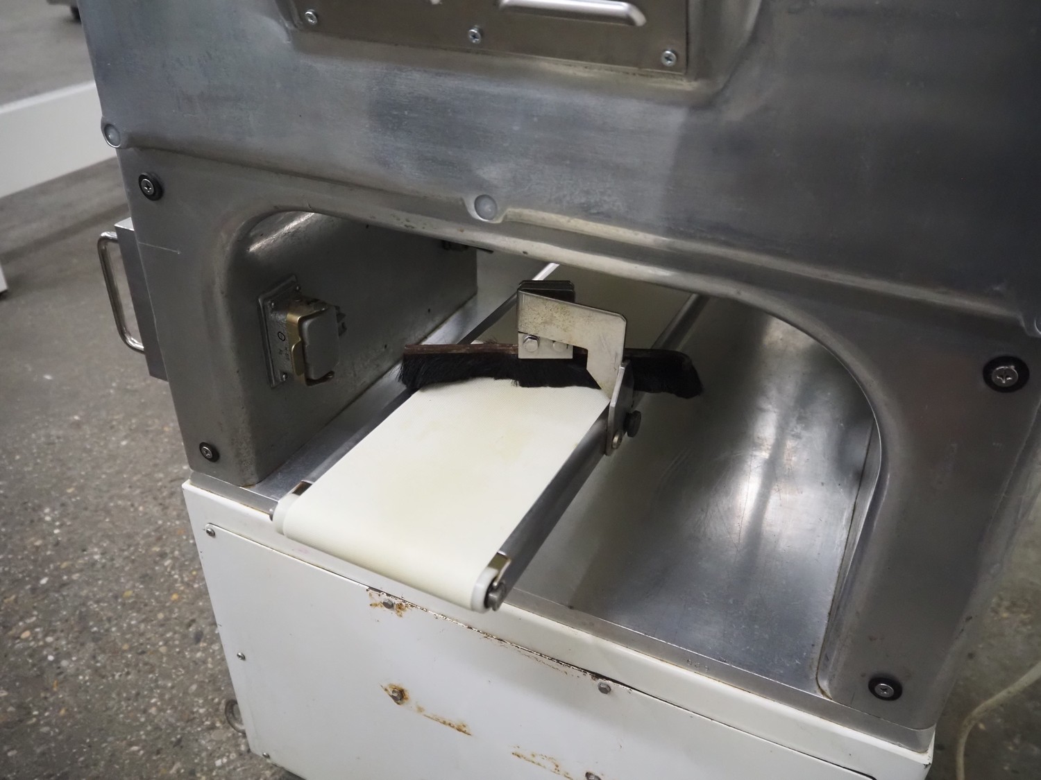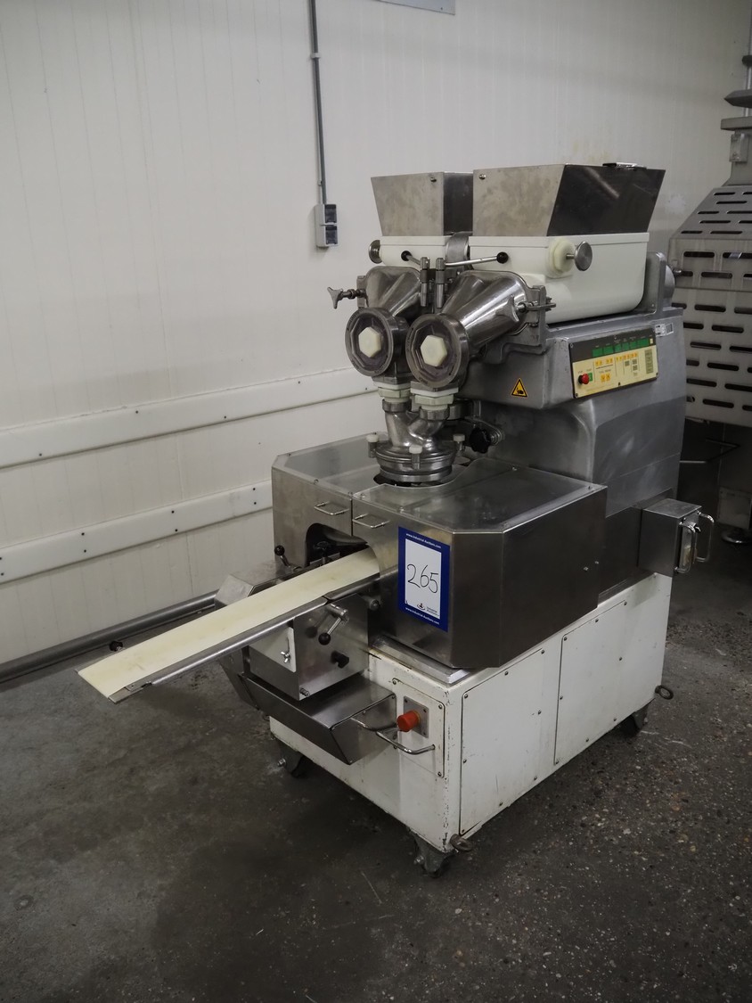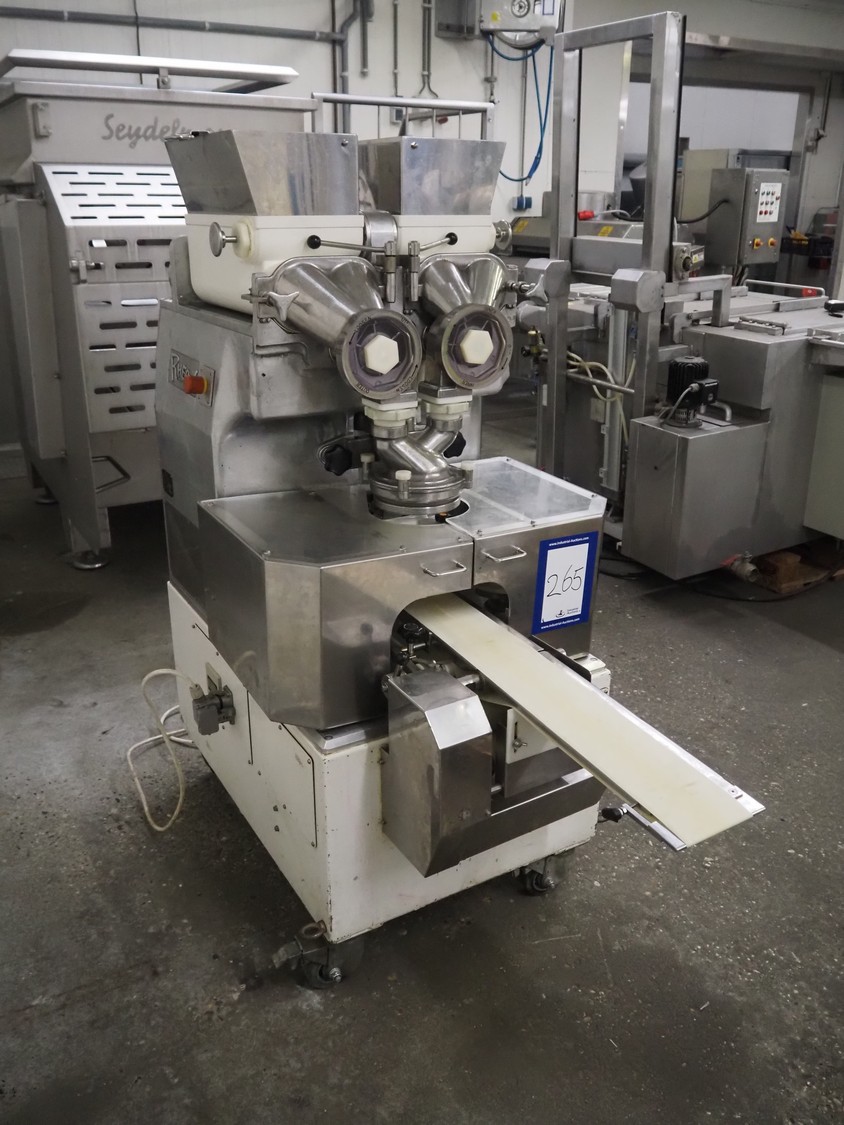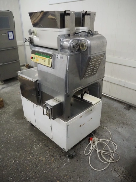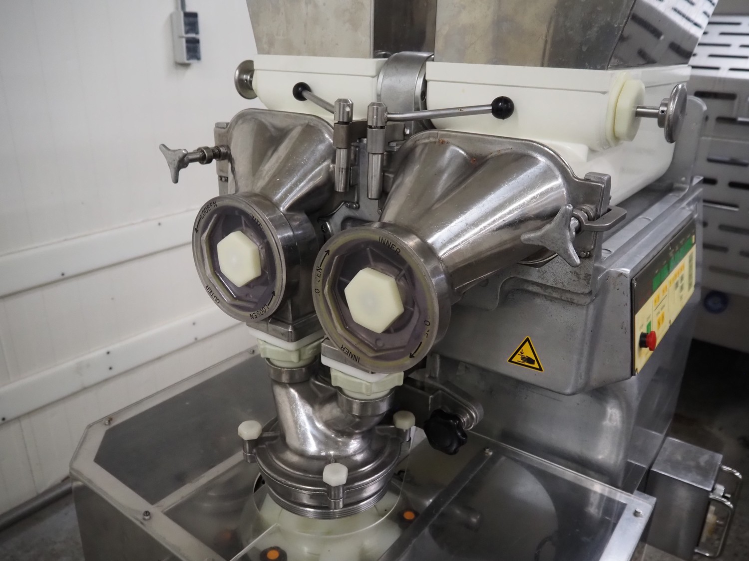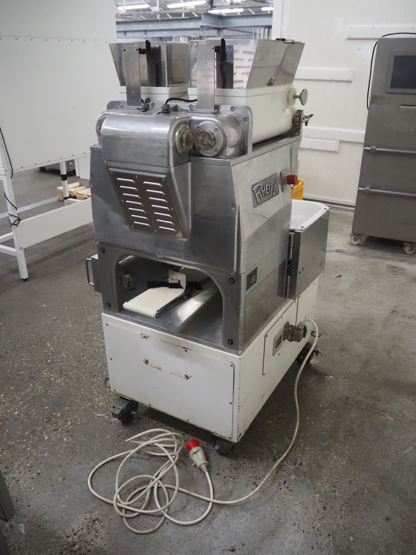 Rheon mobile encrusting machine, name: CORNUCOPIA, model: KN 200, serial number: 039, year of construction: sept 1989, 415 V, 3 Ph, 50 Hz, 1.64 kW, plastic belt, belt width: 130 mm, total dimensions: 1240 mm x 800 mm x 1590 mm. Including crate and box with parts.