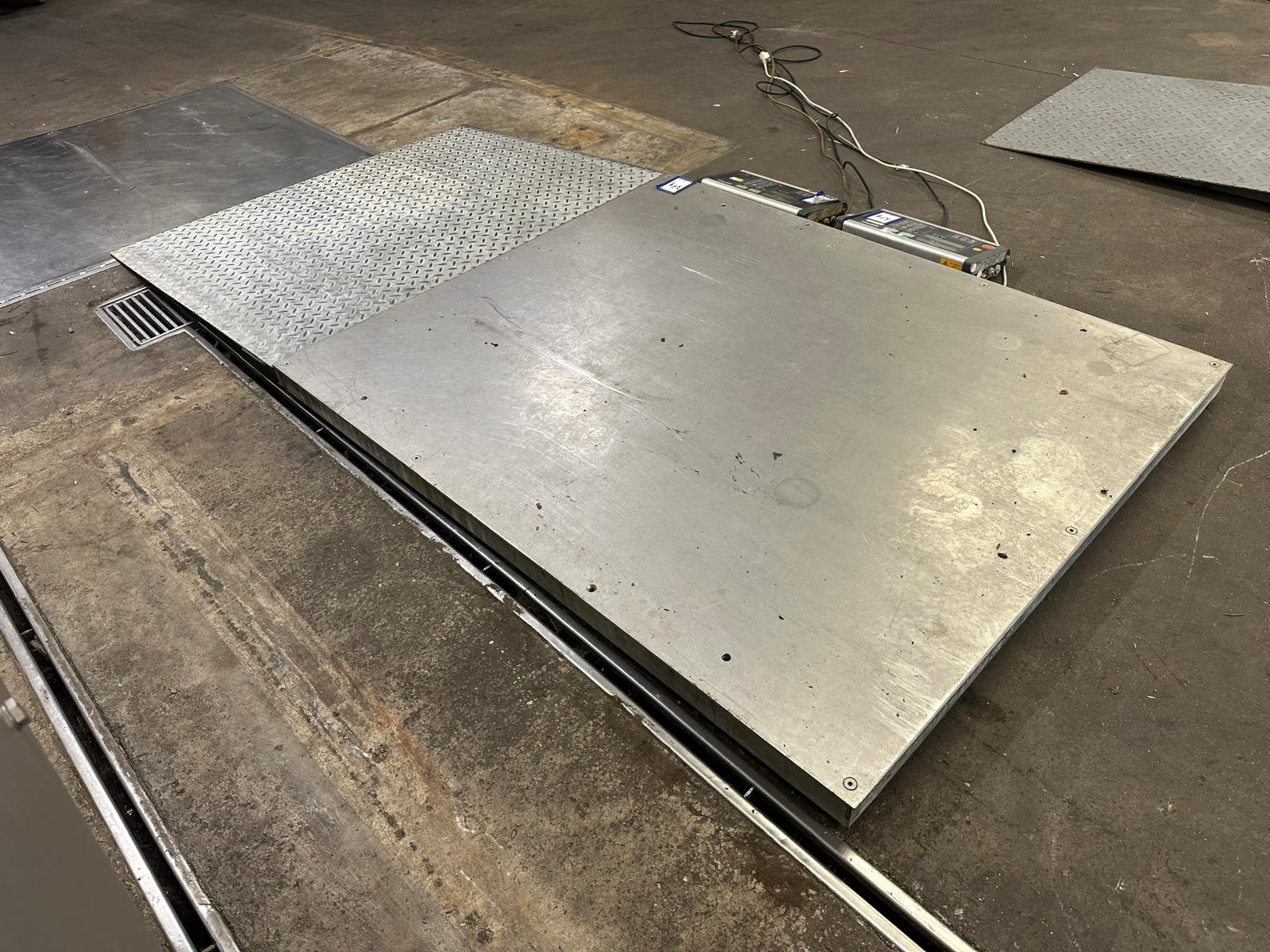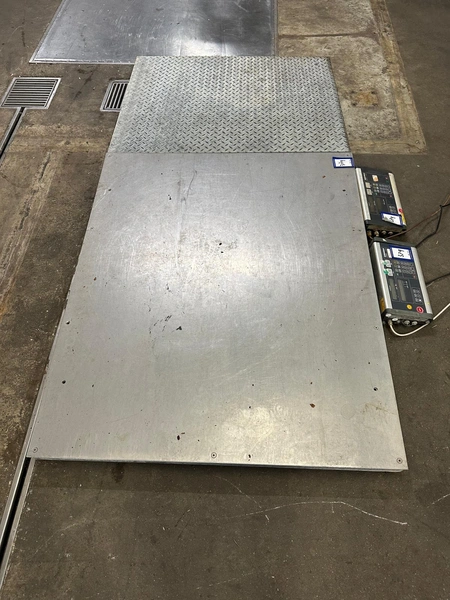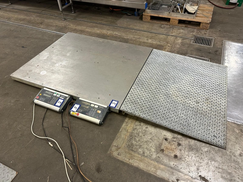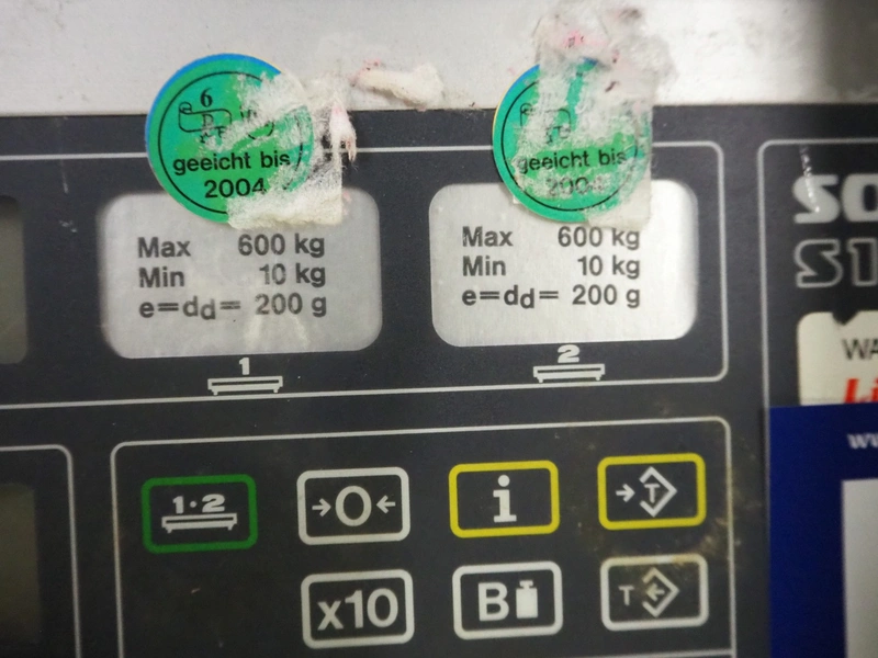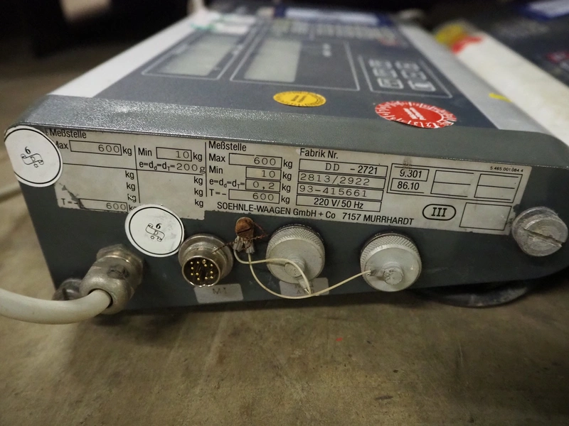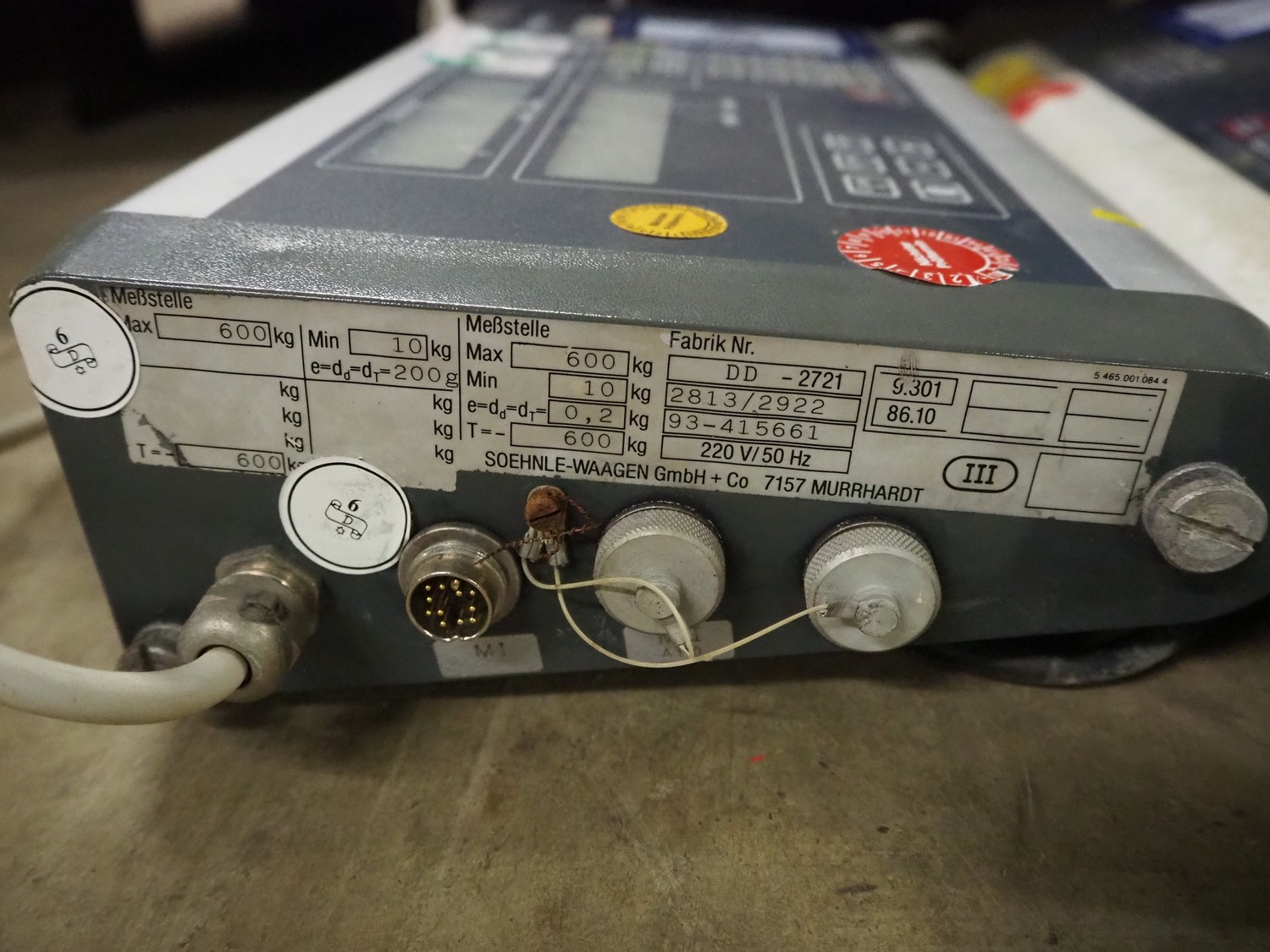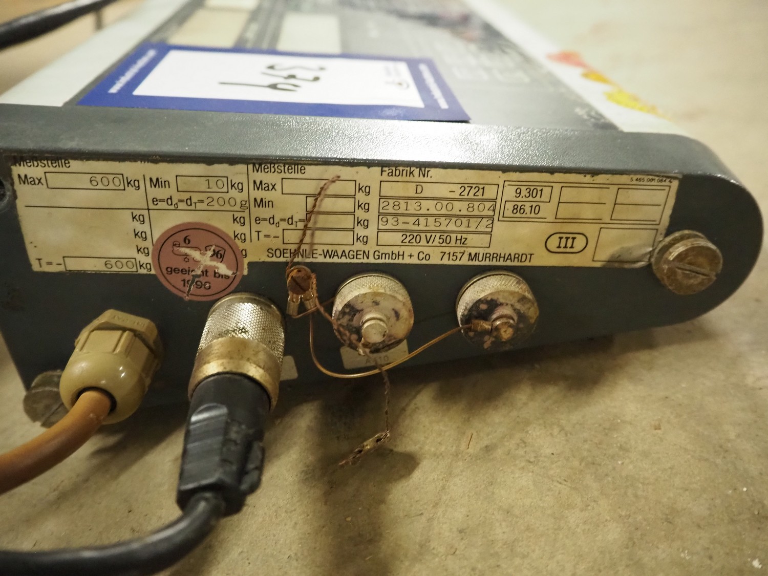 Soehnle floor weighing scale with indicators, 220 V, 50 Hz, maximum 600 kg, minimum 10 kg, e=d= 0.2 kg, dimensions: 1500 mm x 1250 mm x 80 mm.