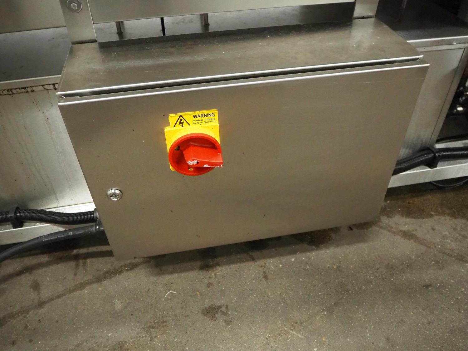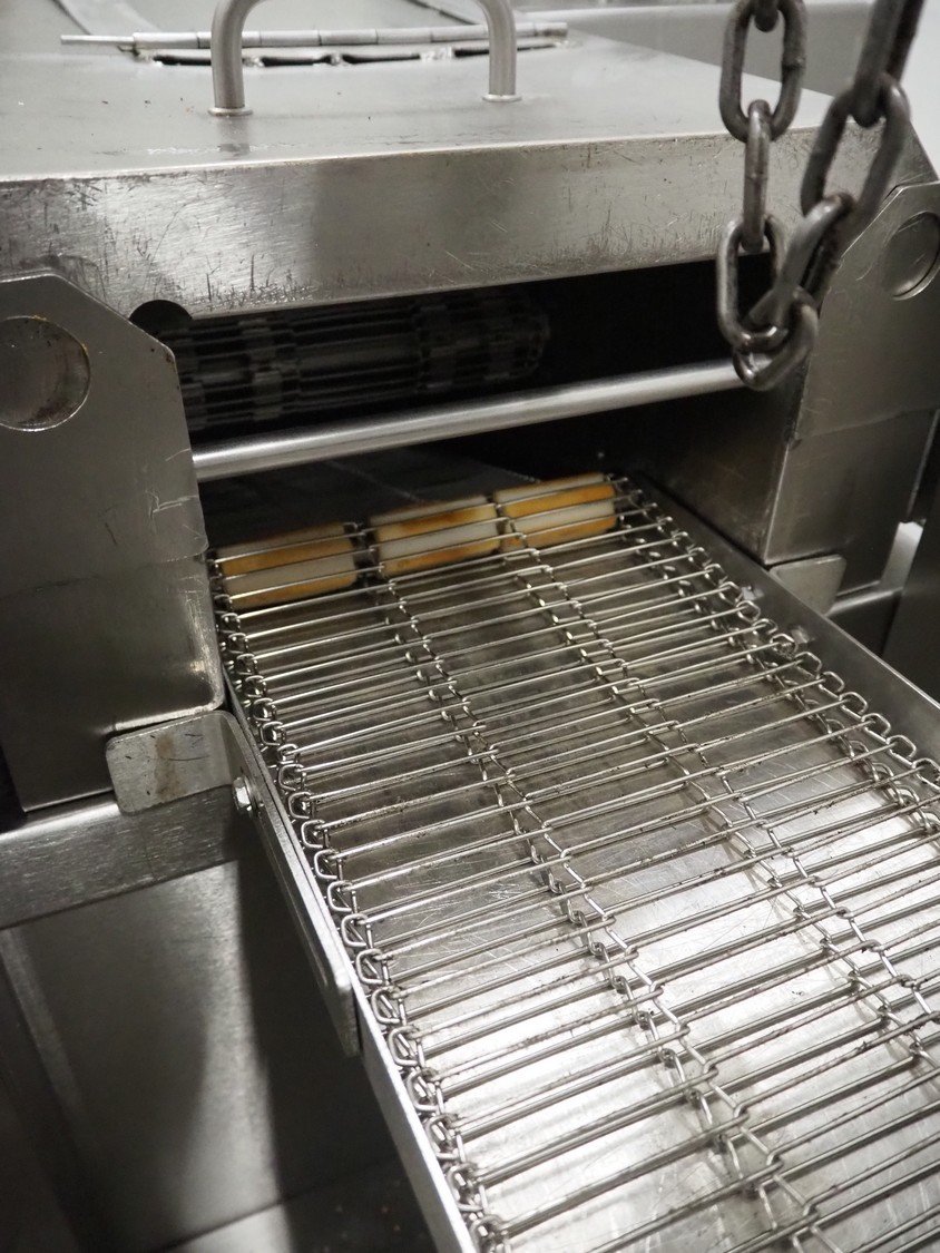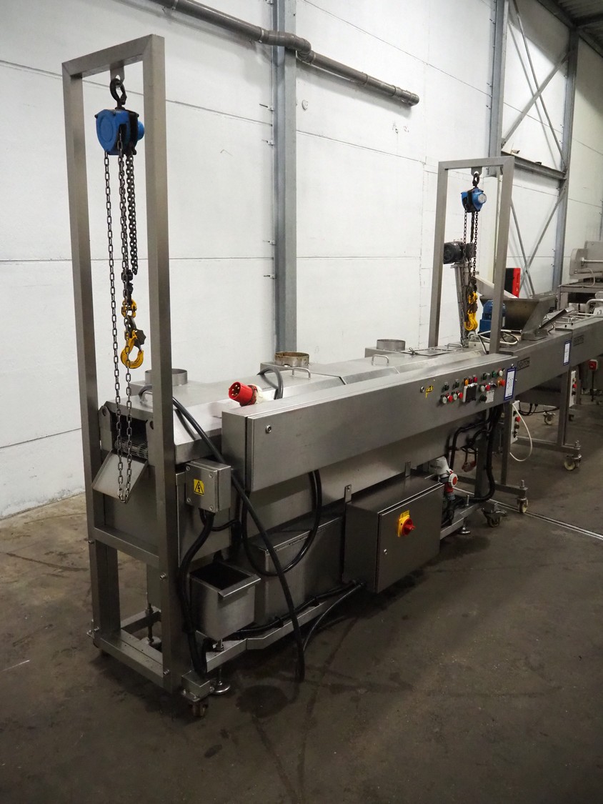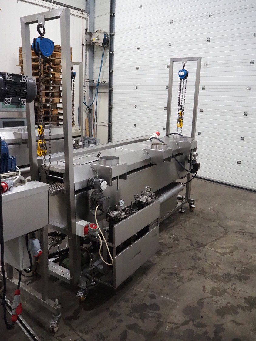 Deighton Manufacturing UK LTD mobile fryer, s/s mesh belt, belt width: 220 mm, clearance: 220 mm x 80 mm, total dimensions: 3000 mm x 1200 mm x 2400 mm.
