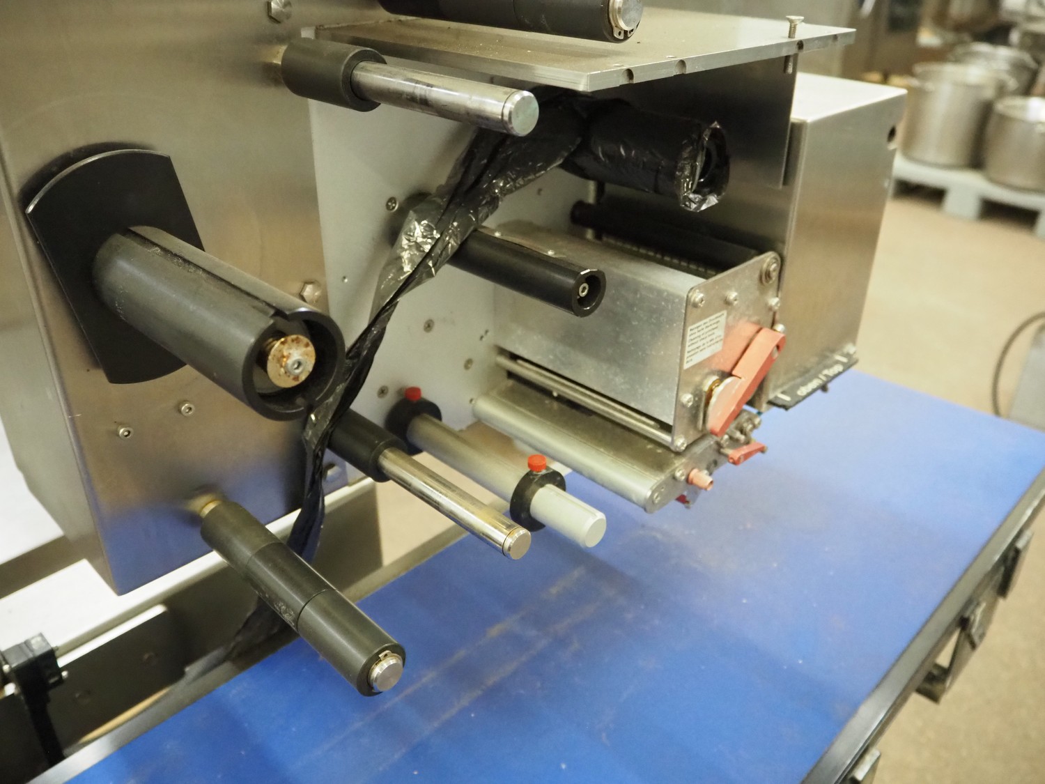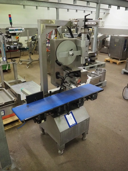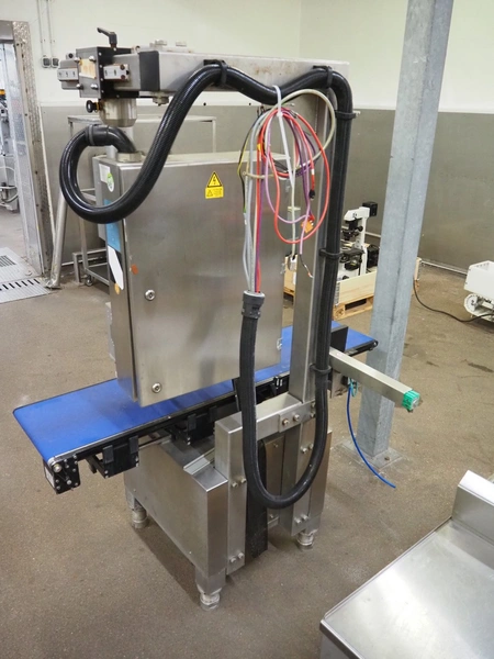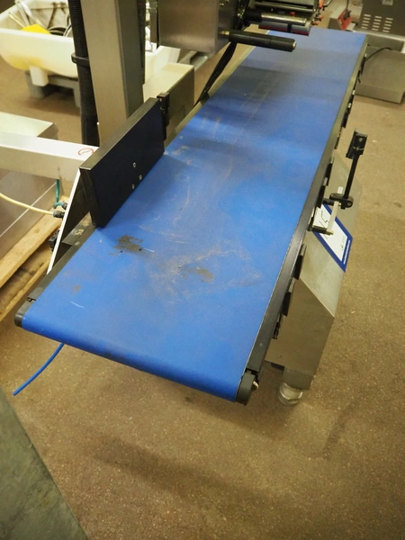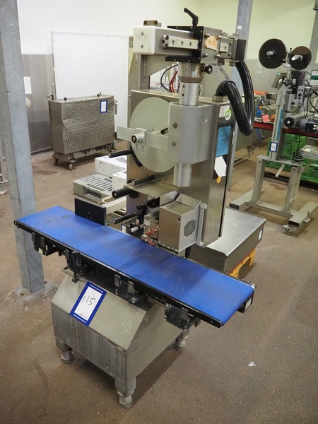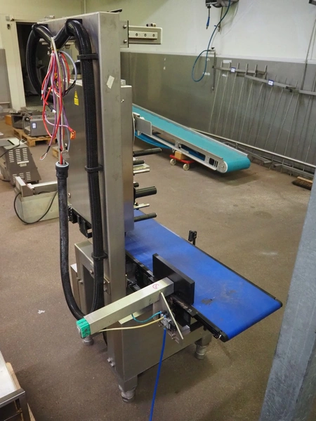 Wipotec labelling machine, serial number: 0003733, year of production: 2006, plastic belt, belt width: 300 mm, total dimensions: 1400 mm x 650 mm x 1800 mm.