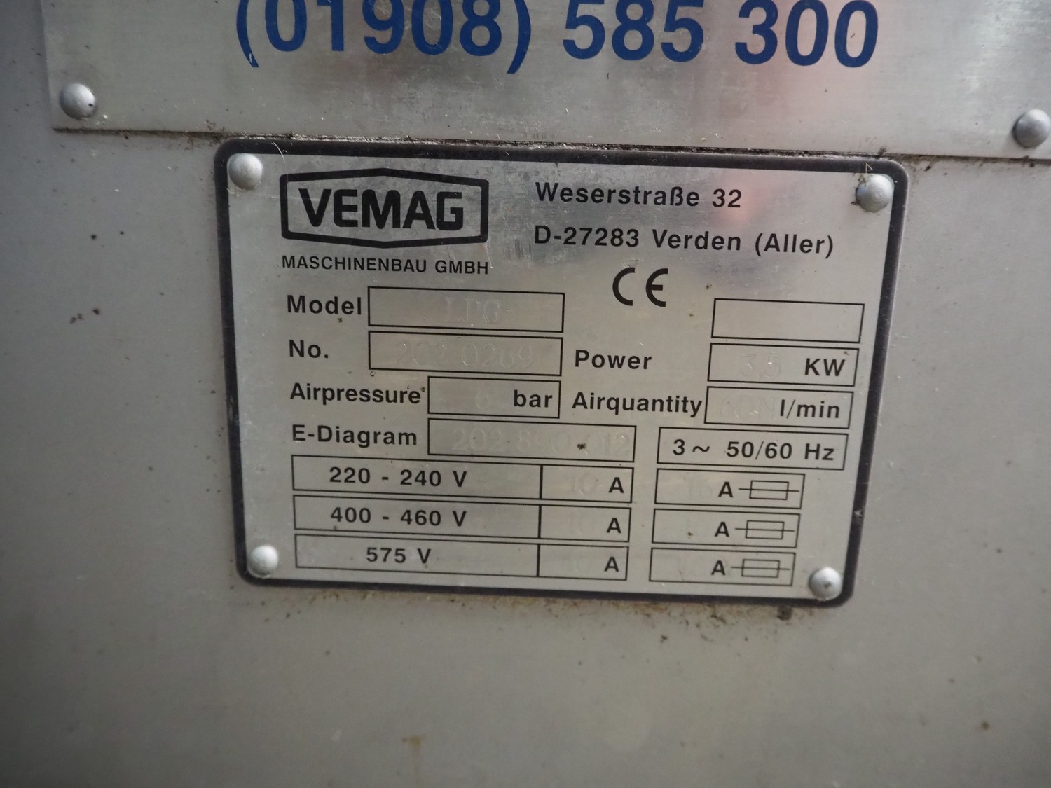 Vemag mobile linking machine, model: LPG 202, number: 2020269, 220/240/400/460/575 V, 3 Ph, 50/60 Hz, 10 A, 3.5 kW, dimensions: 1350 mm x 1850 mm x 1530 mm. Including spare parts.