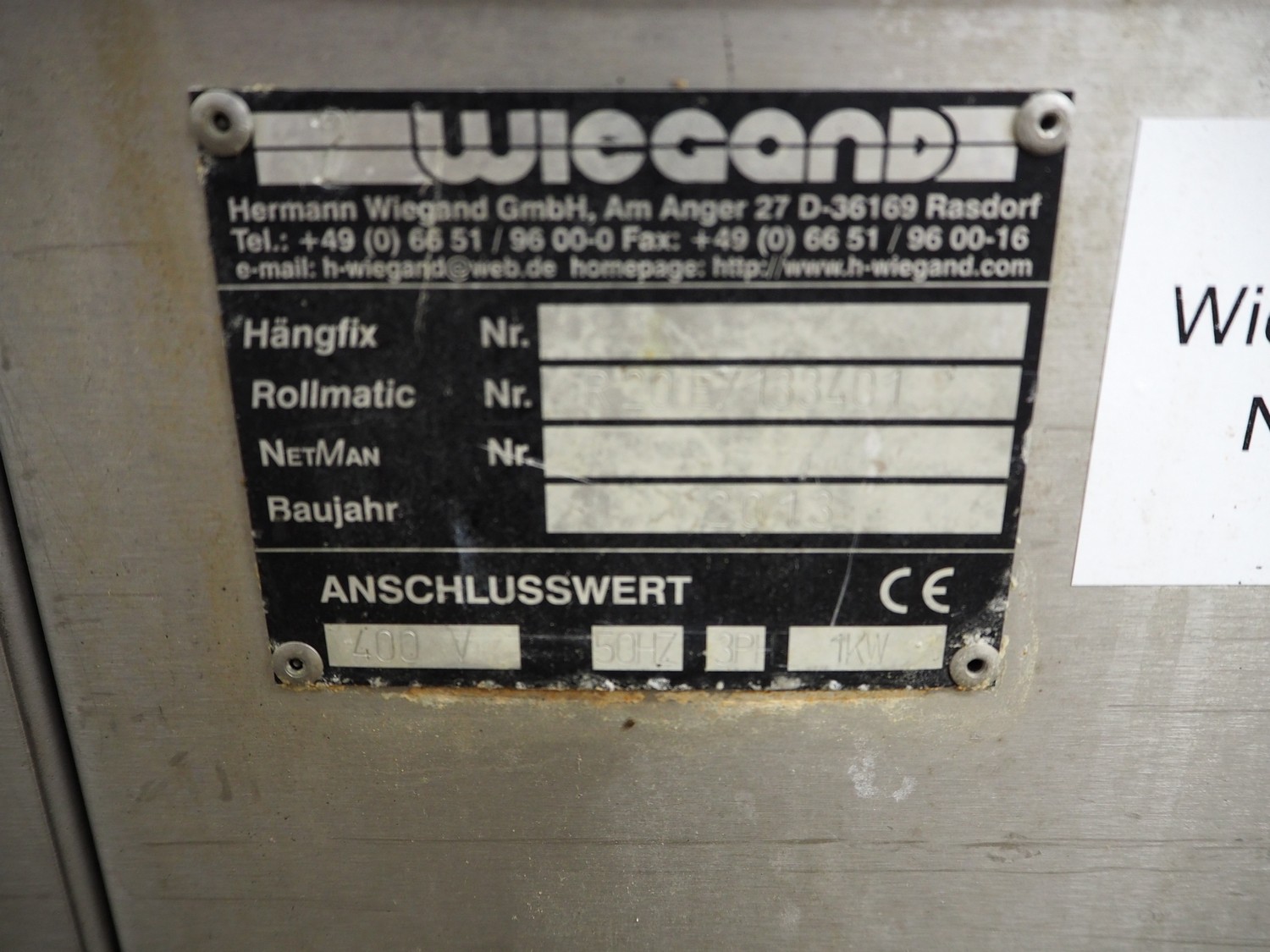 Wiegand mobile binding machine, number: R 20 E/113401, year of construction: 2013, 400 V, 3 Ph, 50 Hz, 1 kW, clearance: Ø 180 mm, total dimensions: 650 m x 540 mm x 1340 mm.