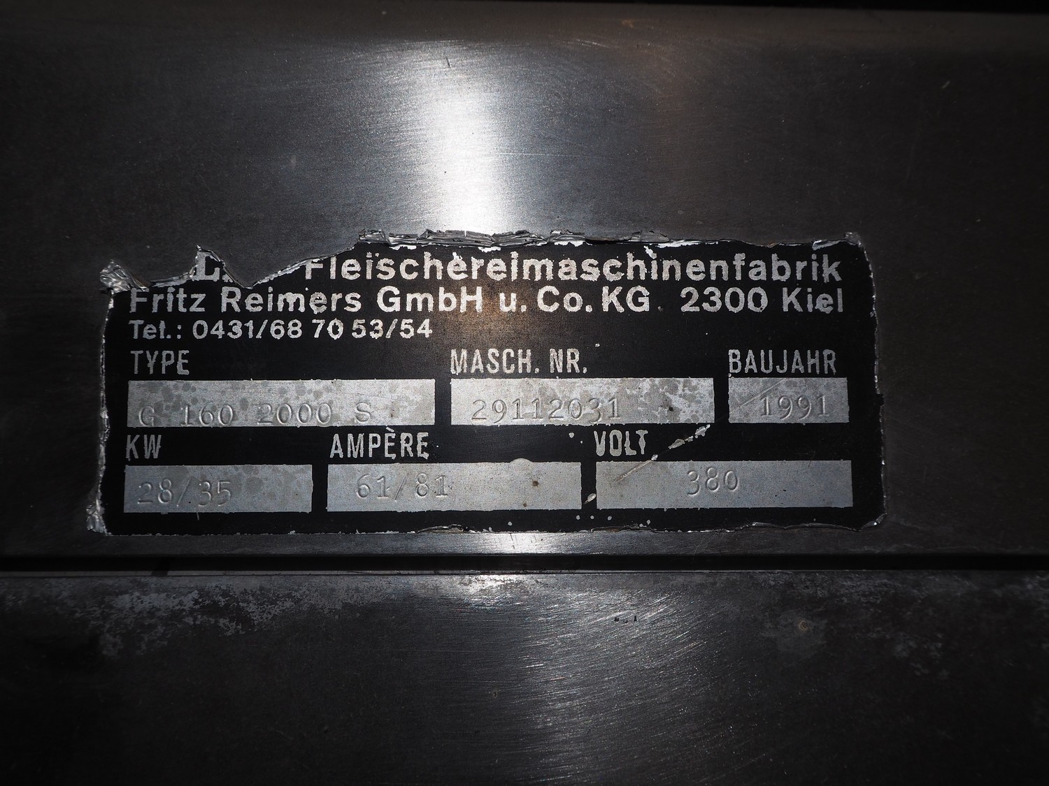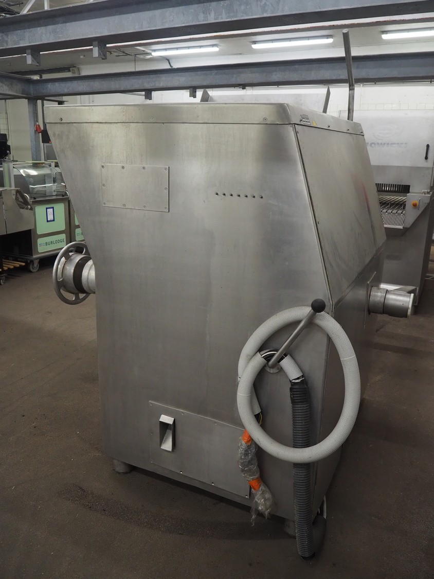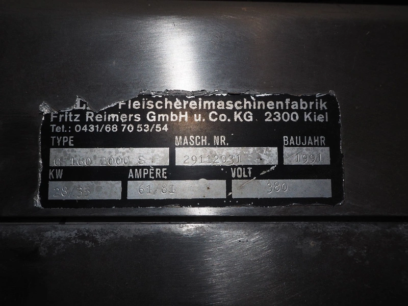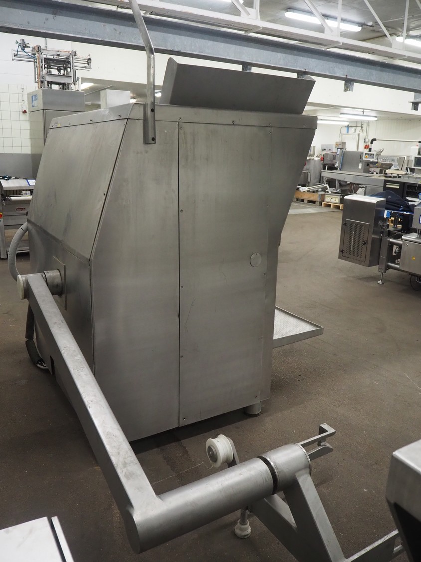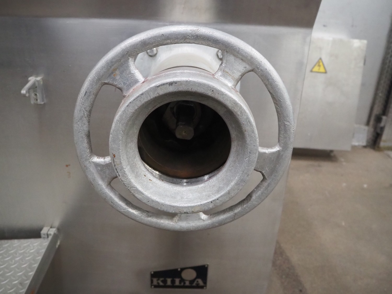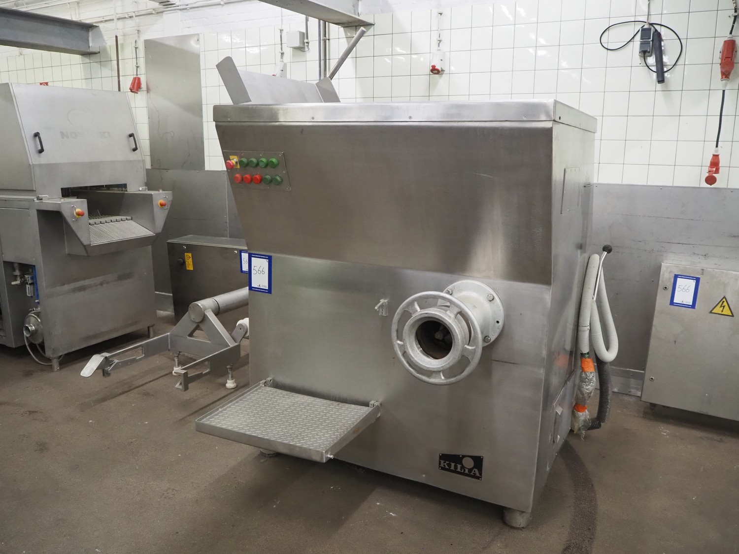 Kilia mixer-grinder with lifter for 200 liter meat bins, type: G 160 2000 S, machine number: 29112031, year of construction: 1991, 380 V, 61/81 A, 28/35 kW, diameter plate: 160 mm, total dimensions: 2750 mm x 1750 mm x 2300 mm. Including switch cabinet, dimensions: 750 mm x 200 mm x 950 mm. Missing knives and plates.