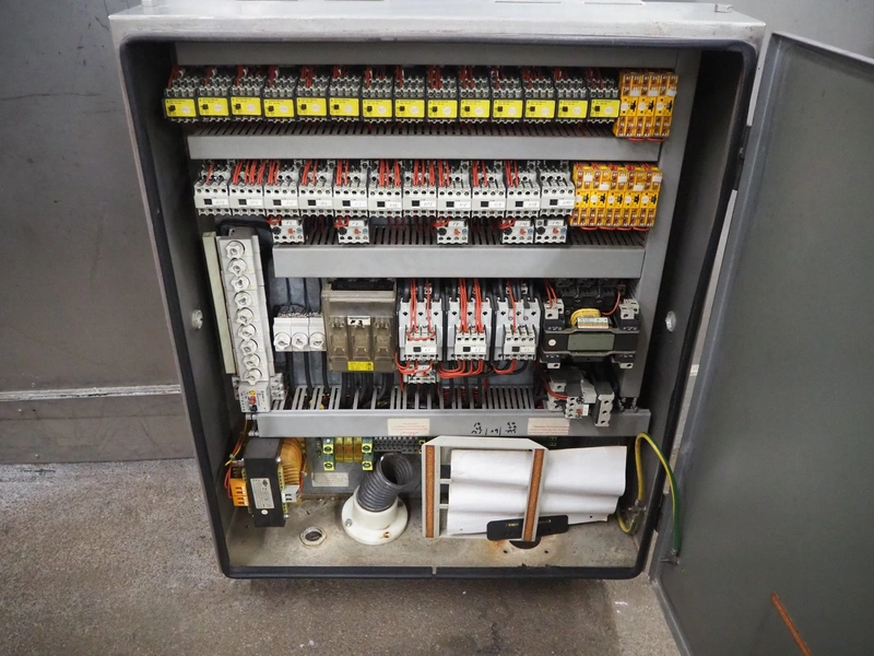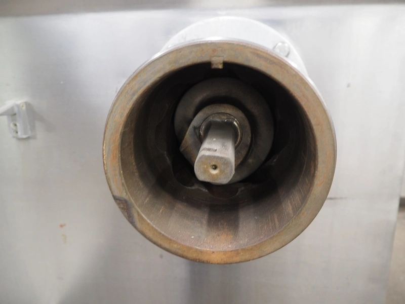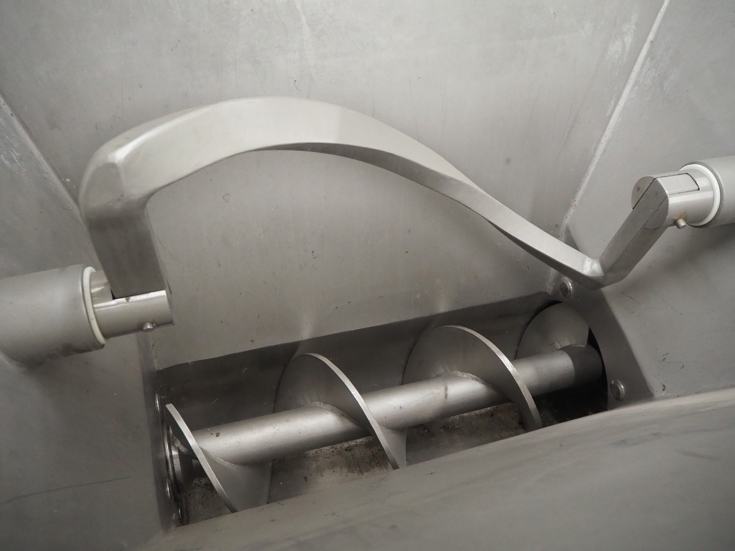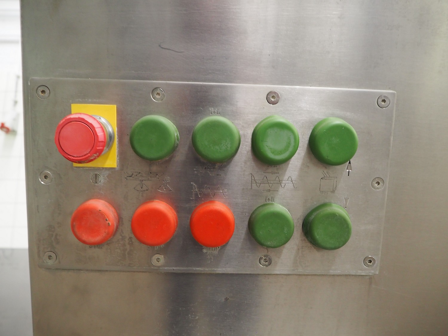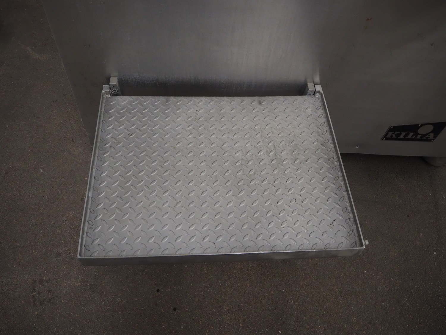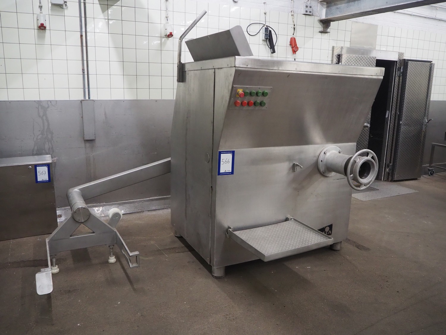 Kilia mixer-grinder with lifter for 200 liter meat bins, type: G 160 2000 S, machine number: 29112031, year of construction: 1991, 380 V, 61/81 A, 28/35 kW, diameter plate: 160 mm, total dimensions: 2750 mm x 1750 mm x 2300 mm. Including switch cabinet, dimensions: 750 mm x 200 mm x 950 mm. Missing knives and plates.