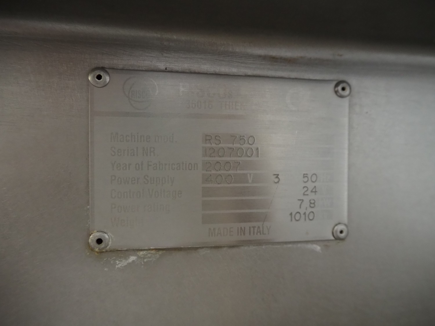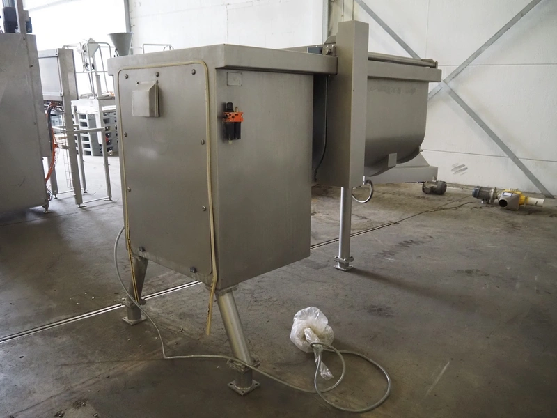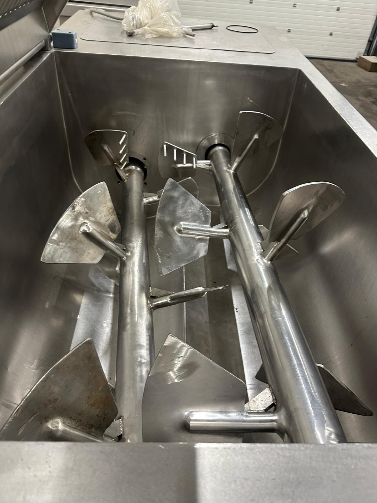 Risco S.p.A. double shaft paddle mixer, model: RS 750, serial number: 1207001, year of construction: 2007, 400 V, 3 Ph, 50 Hz, 7.8 kW, weight: 1010 kg, volume: 750 liter, dimensions: 2760 mm x 1170 mm x 1820 mm.