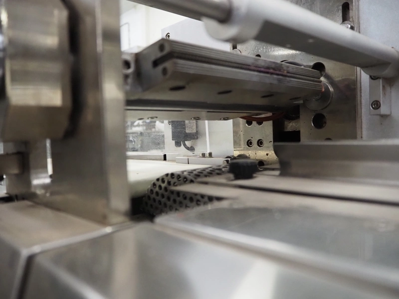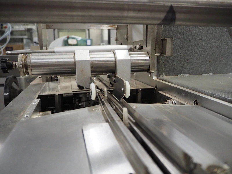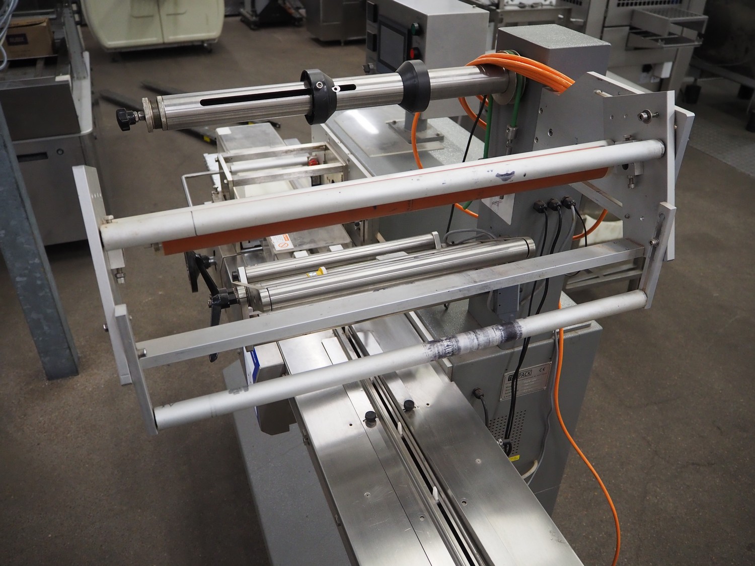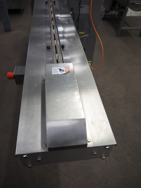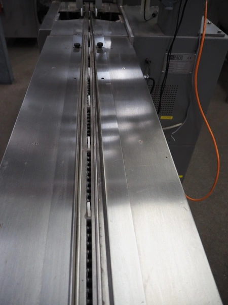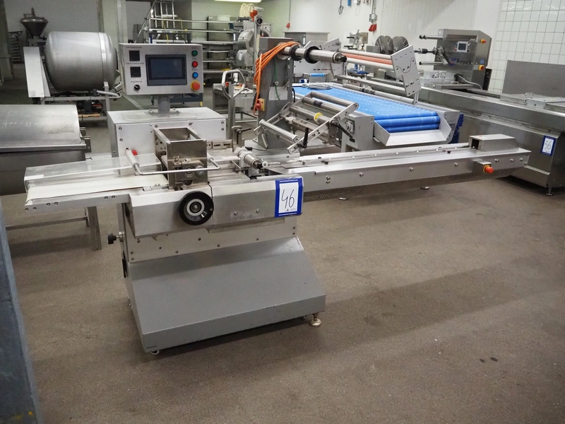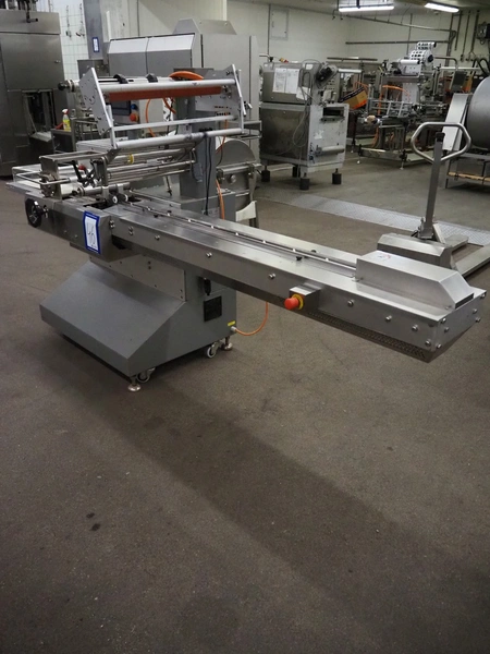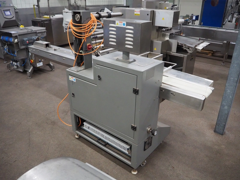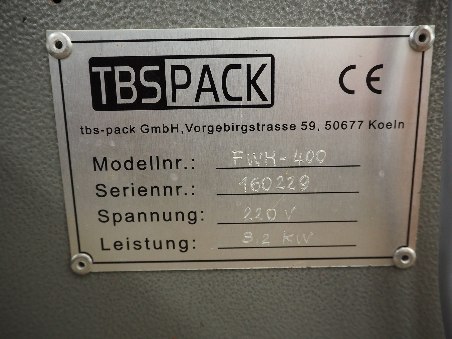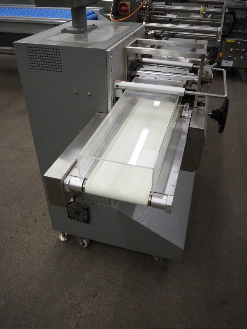 TBS-Pack GmbH mobile flow packer, model: FWH-400, serial number: 160229, 220 V, 3.2 kW, seal width: 200 mm, plastic belt, belt width: 180 mm, total dimensions: 3000 mm x 850 mm x 1520 mm.