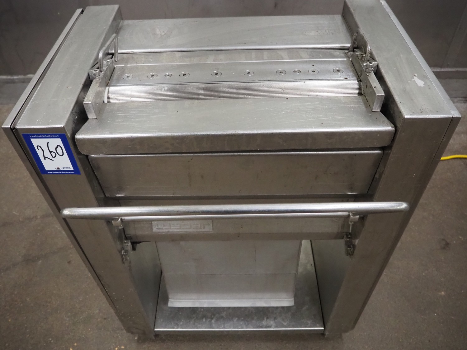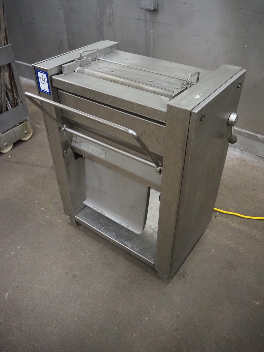 Weber skinning machine, working width: 500 mm, total dimensions: 770 mm x 650 mm x 1050 mm.