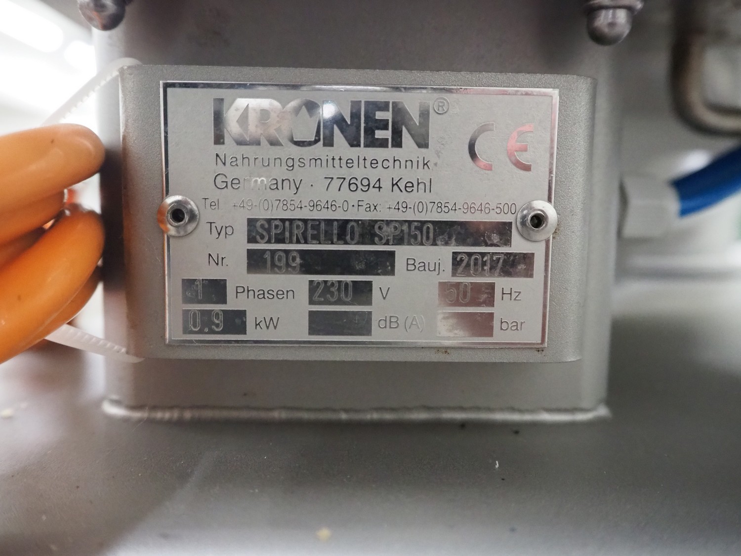 Kronen mobile vegetable spiral cutting machine, type: SPIRELLO SP150, number: 199, year of construction: 2017, 230 V, 1 Ph, 50 Hz, 0.9 kW, clearane: Ø 75 mm, total dimensions: 1100 mm x 600 mm x 1700 mm.
