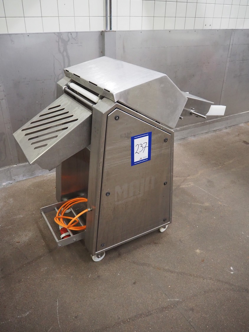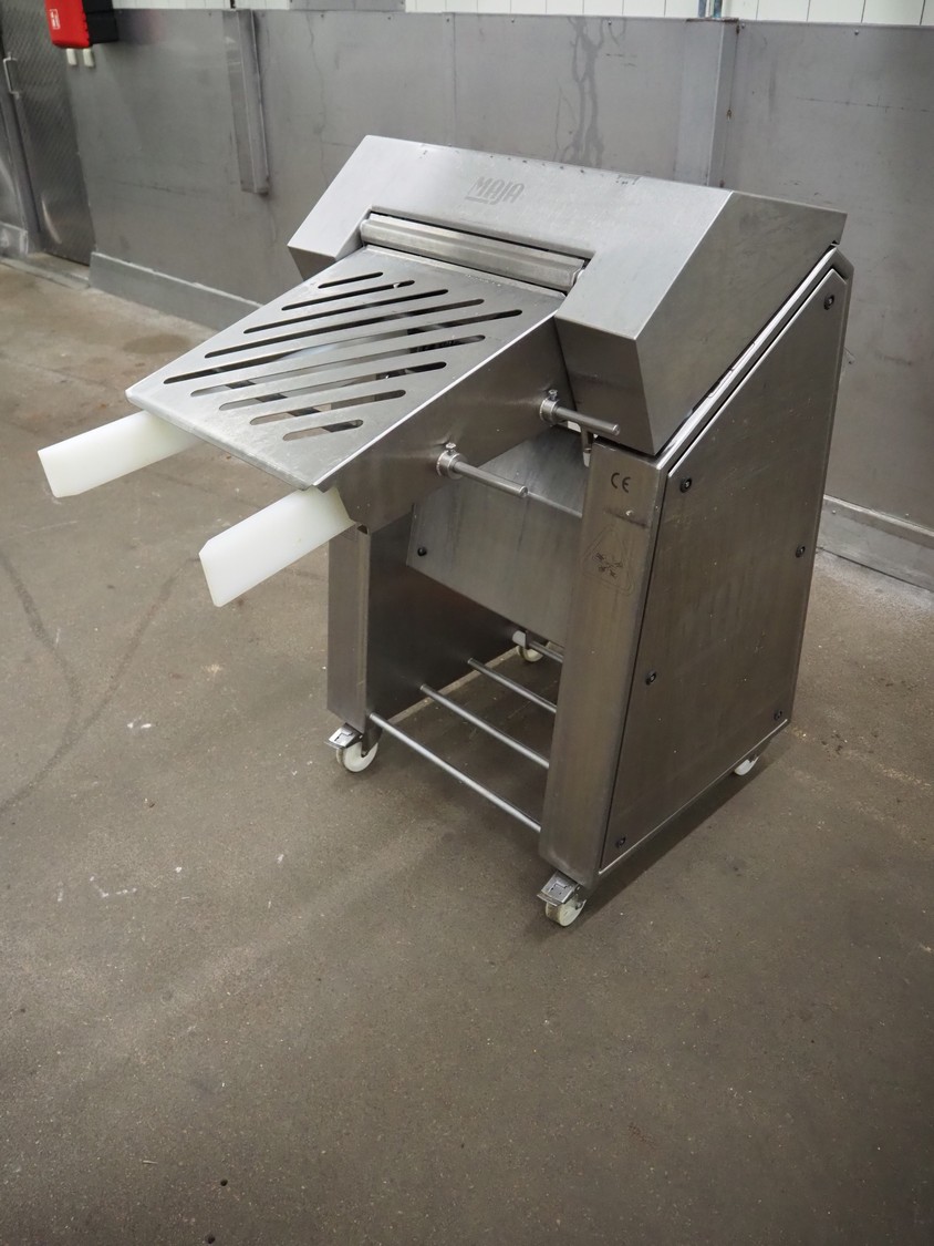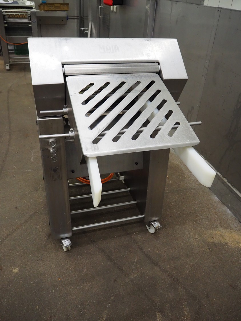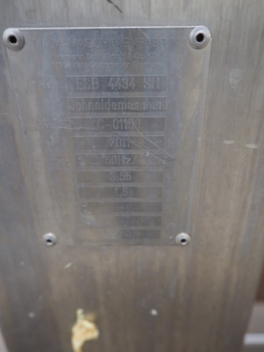 Maja Maschinenfabrik mobile strip cutter, type: ESB 4434 SH, serial number: C-01159, year of construction: 2011, 400 V, 3 Ph, 50 Hz, 3.55 A, 1.5 kW, working width: 440 mm, distance between knives: 0.5 mm, total dimensions: 1600 mm x 800 mm x 1300 mm. Incomplete, missing belts and knife.