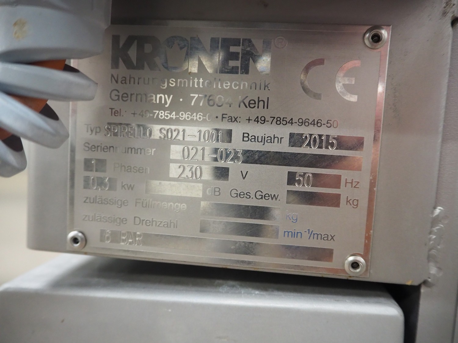 Kronen mobile vegetable slicer, type: SPIRELLO S021-1001, serial number: 021-023, year of construction: 2015, 230 V, 1 Ph, 50 Hz, 0.3 kW, dimensions: 1000 mm x 600 mm x 1200 mm.