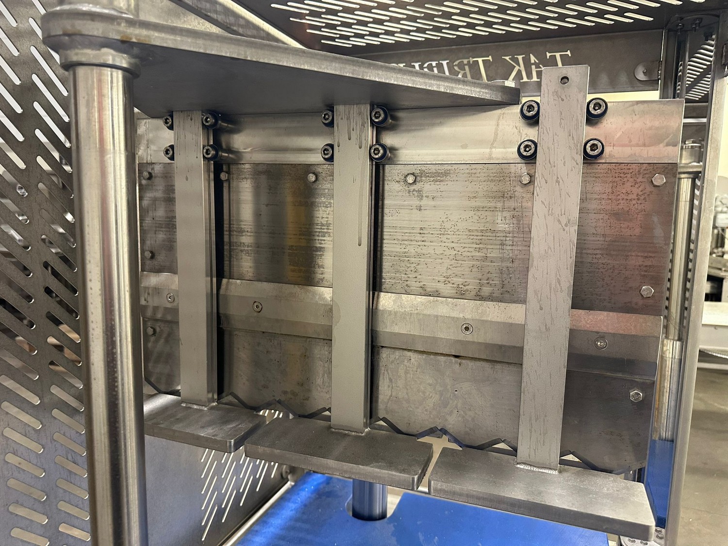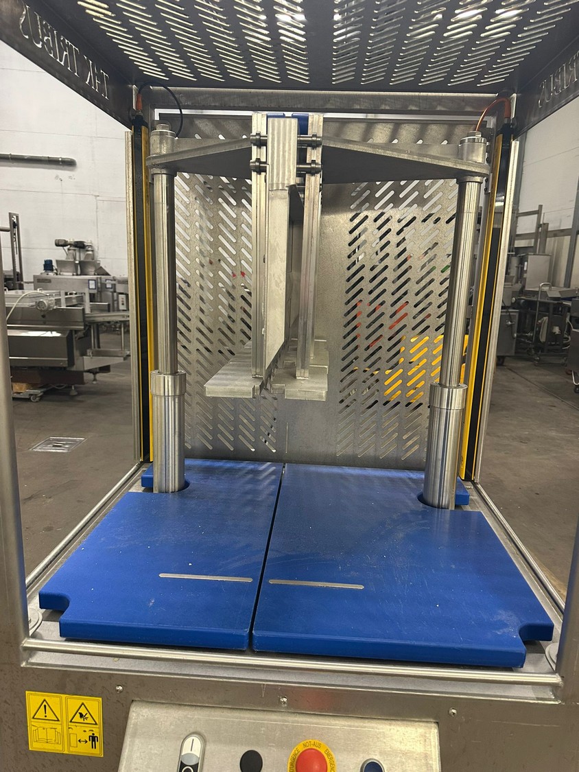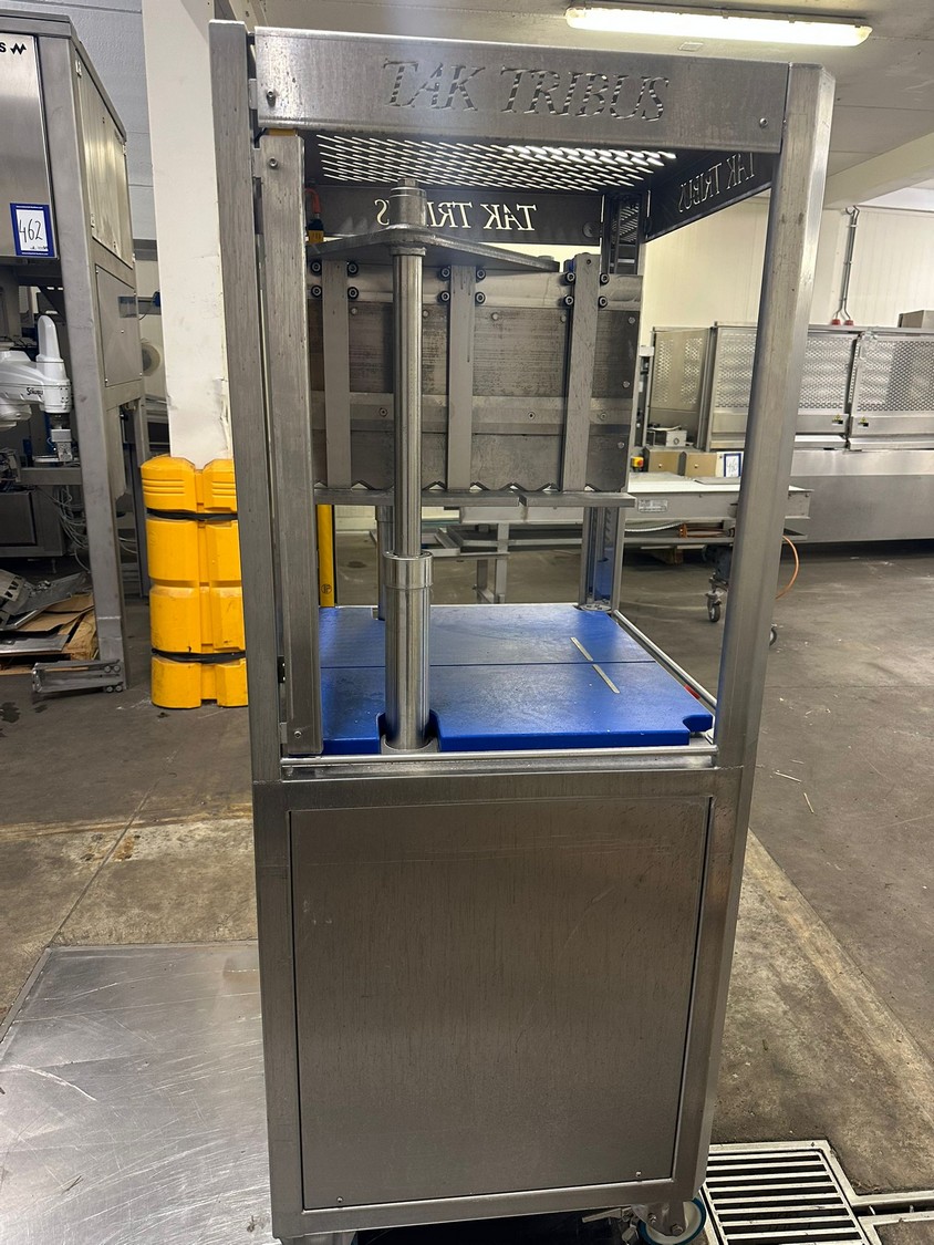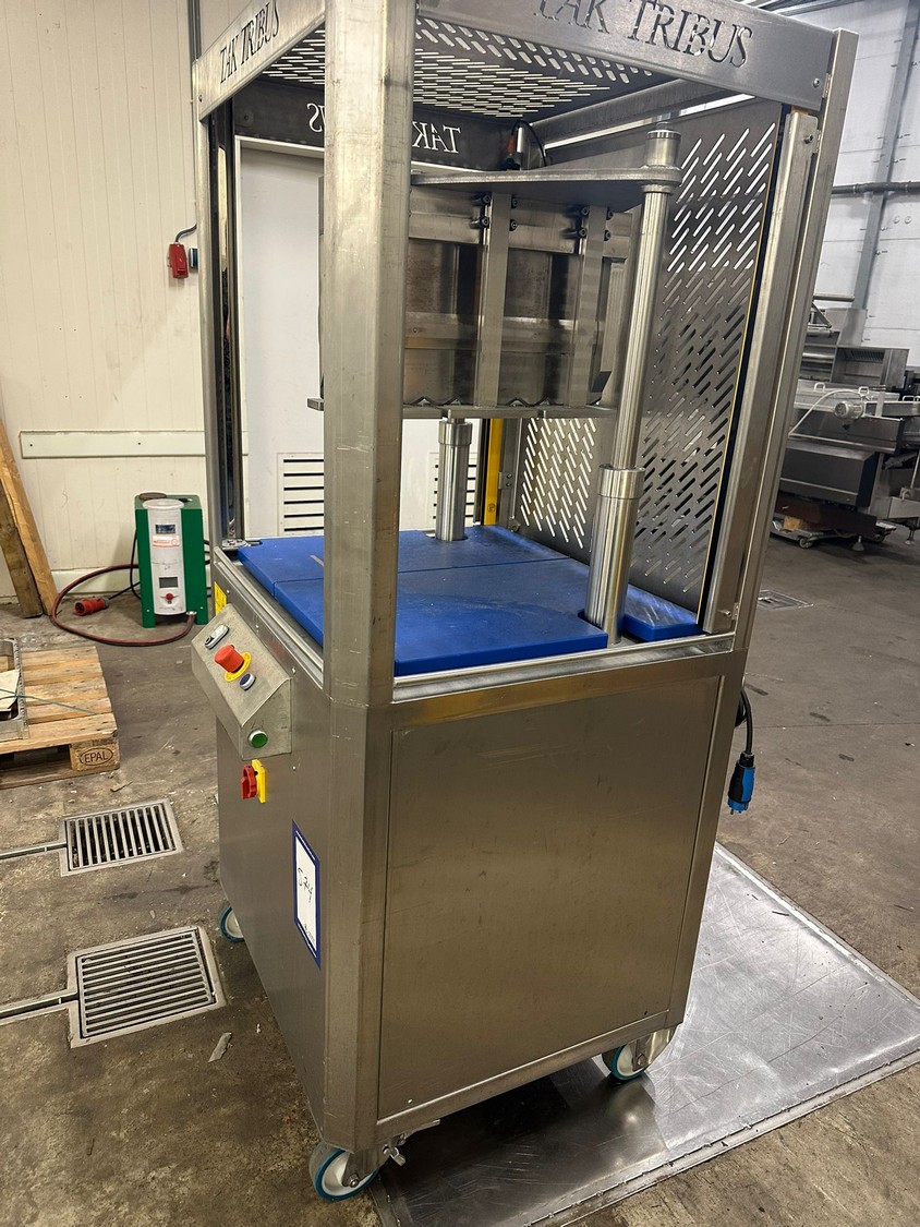 Tak-Tribus bacon slicer, type: SSE18, number: SSE180801, year of construction: 08-2018, 230 V, 50 Hz, 8 A, 1.5 kW, weight: 396 kg, knife width: 600 mm, total dimensions: 850 mm x 750 mm x 1880 mm.
