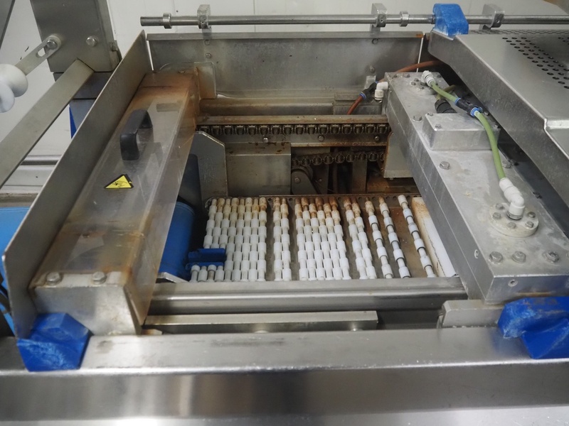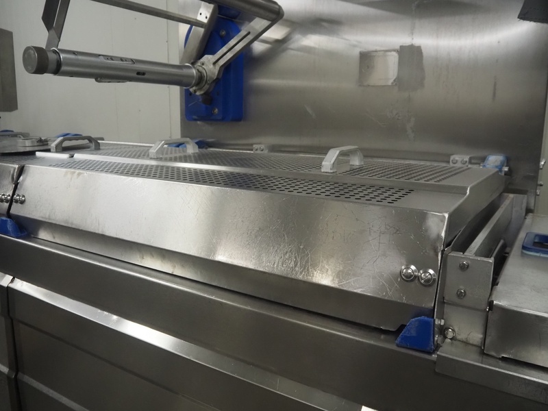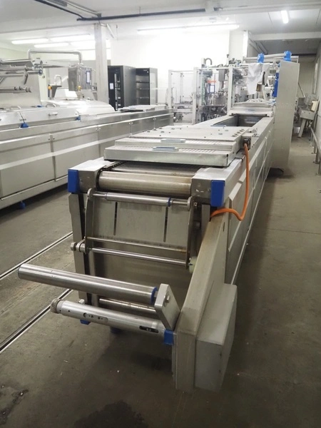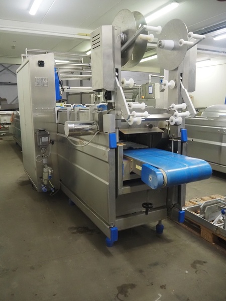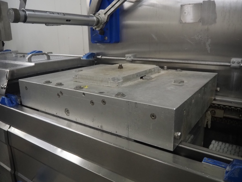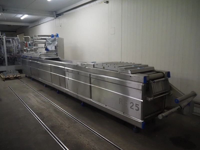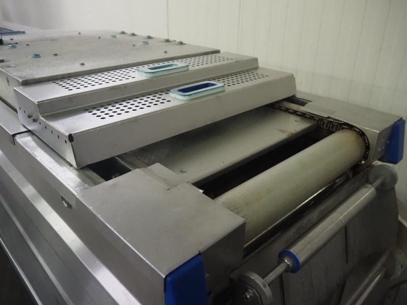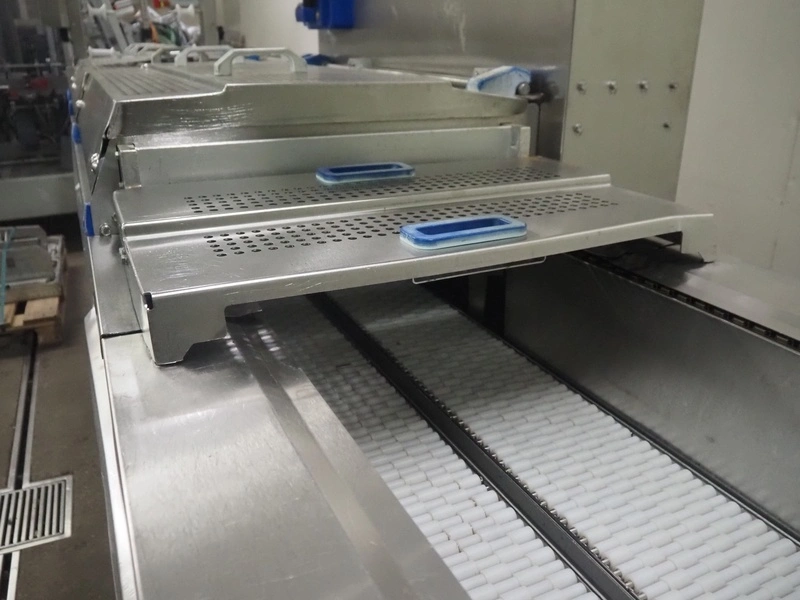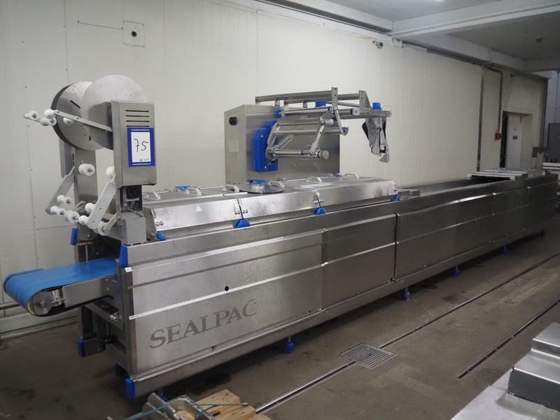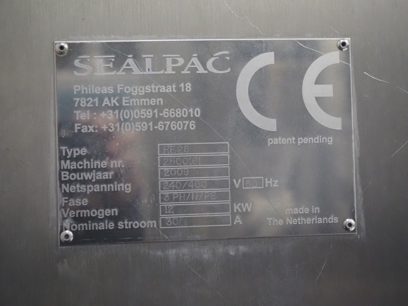 Sealpac thermoformer, type: RE25, machine number: 2500161, year of construction: 2009, 240/400 V, 3 Ph, 50 Hz, 30 A, 12 kW, film width: 450 mm, dye: 390 mm x 350 mm, plastic outfeed belt, belt width: 400 mm, total dimensions: 8700 mm x 1100 mm x 2150 mm.