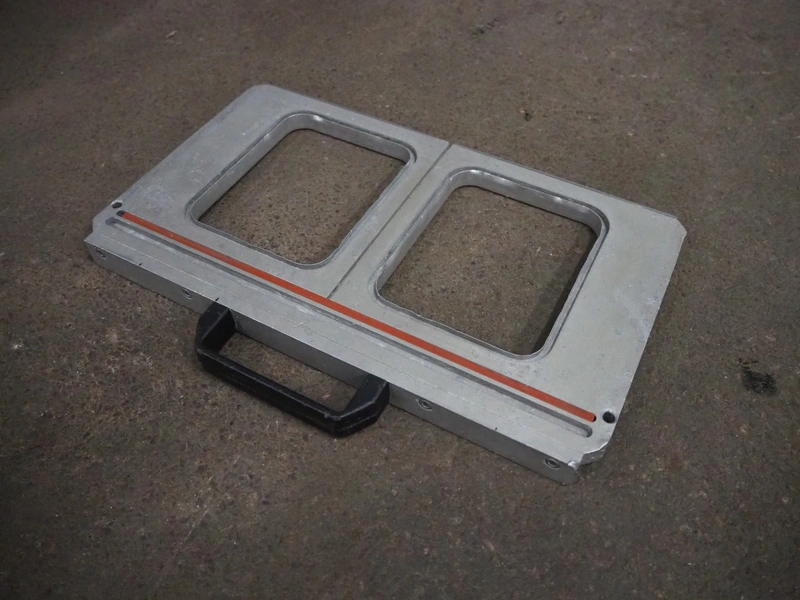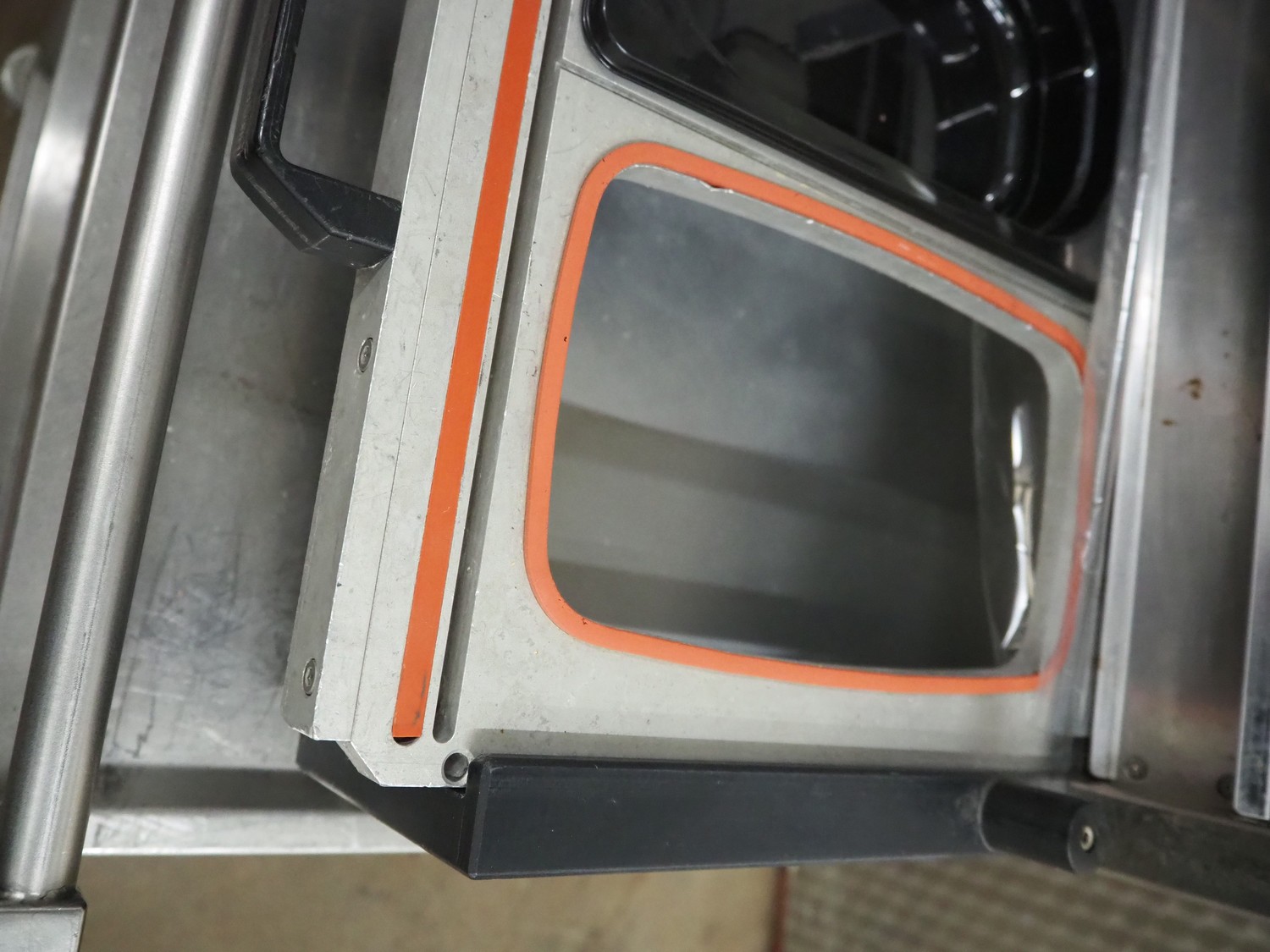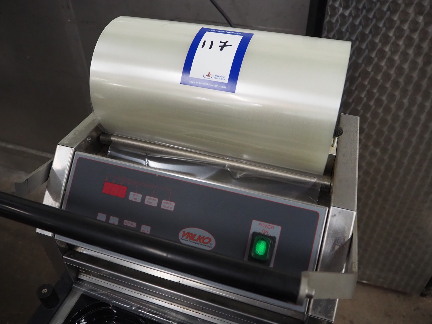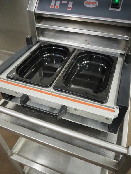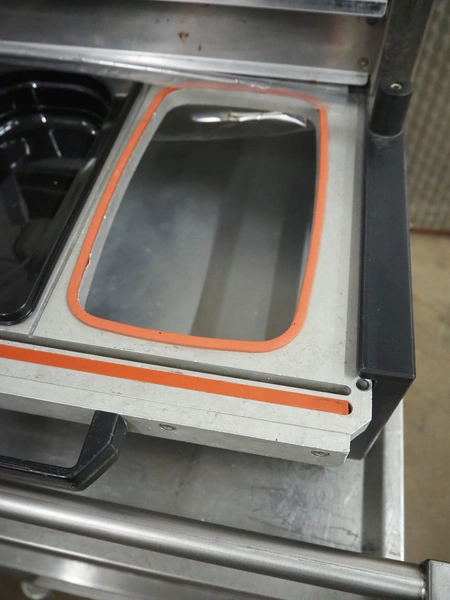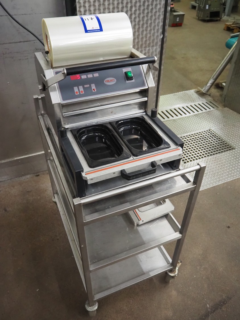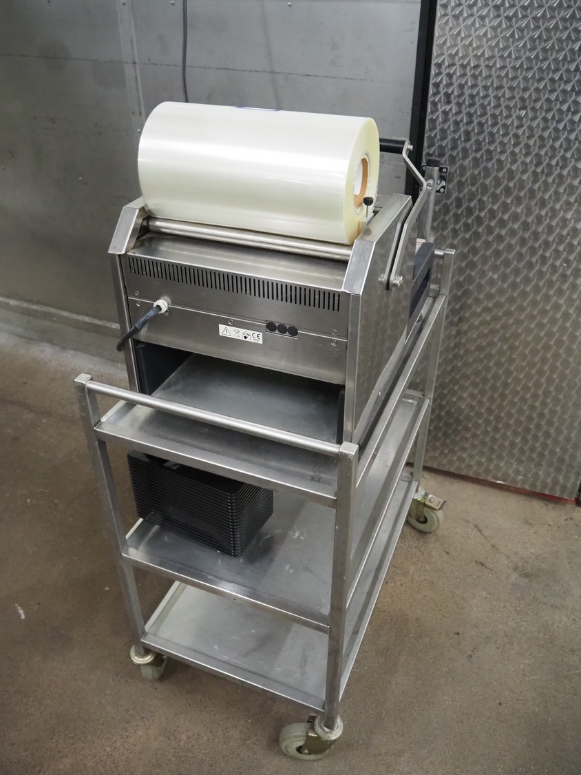 Valko traysealer on s/s trolley, film width: 340 mm, dye: 260 mm x 155 mm and 150 mm x 120 mm, total dimensions traysealer: 700 mm x 450 mm x 540 mm, total dimensions trolley: 840 mm x 560 mm x 1400 mm.